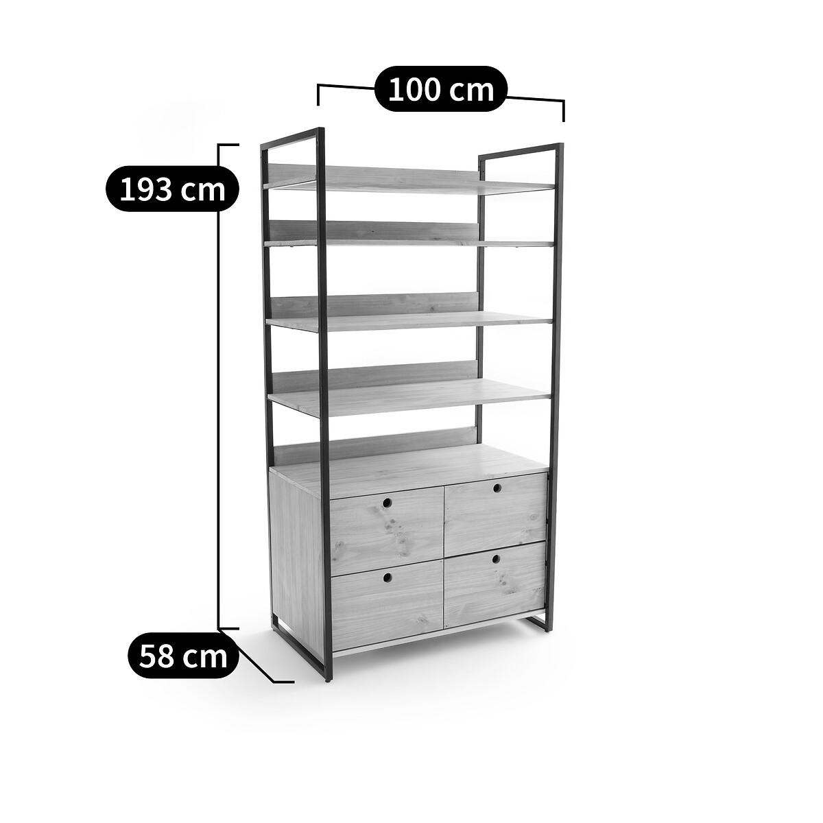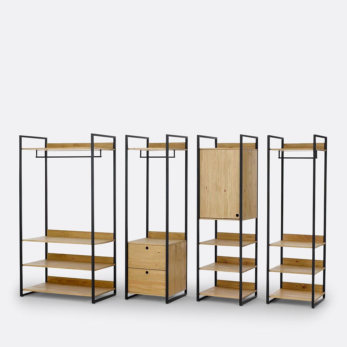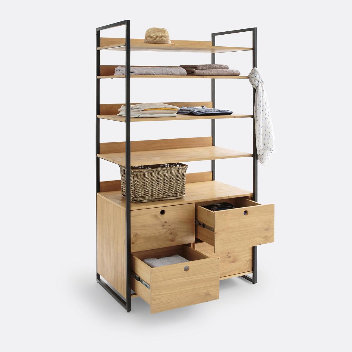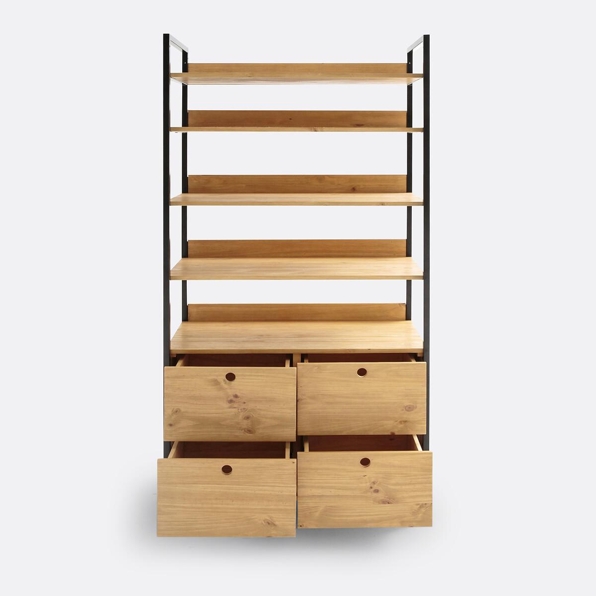 The Hiba 4-drawer, 4-shelf unit. Perfect for creating your own walk-in wardrobe. To be fixed to the wall or to be combined with other Hiba modules.Product Details • 4 drawers. • 4 external fixed shelves. • Black metal structure, matte finish. • Cabinet and shelves in solid pine, natural stained, nitrocellulose matt finish. Dimensions • Width: 100cm • Depth: 58cm • Height: 193cm • Drawer dimensions: 39 x 39 x 21cm. Delivery:Assembly required. Available for home delivery. Note! Please check that all access points are large enough to accommodate your delivery (doors, stairs, lifts).Dimensions and weight of parcel:2 parcels • 203 x 67.5 x 14.5 cm. 39kg • 109 x 62 x 17cm. 37kg