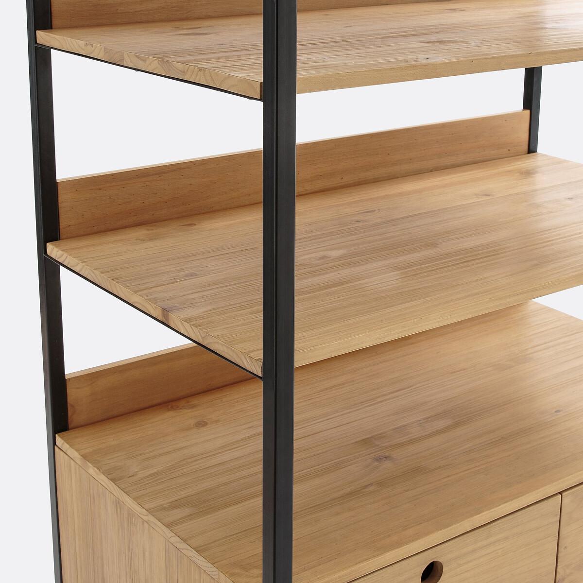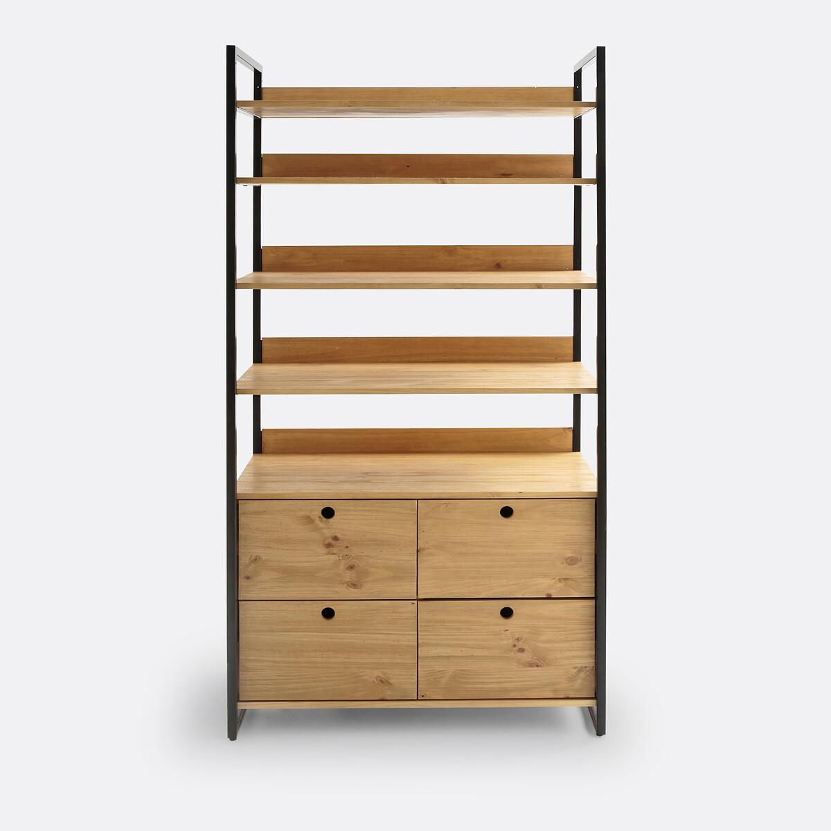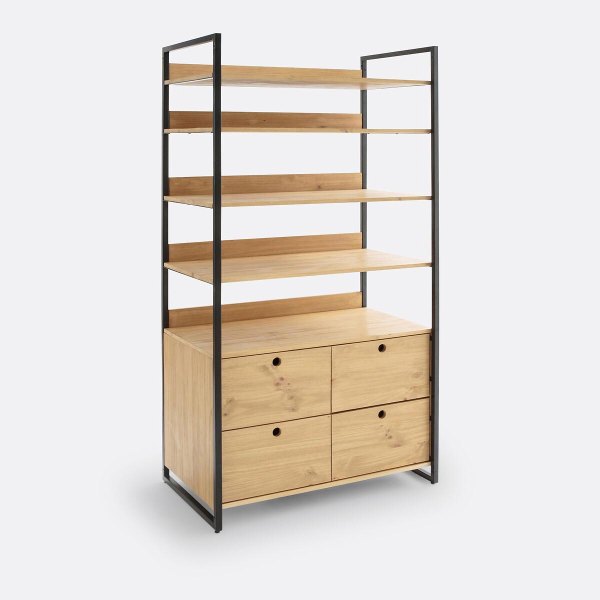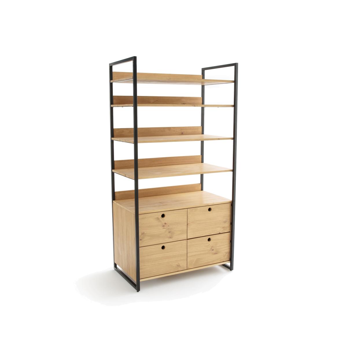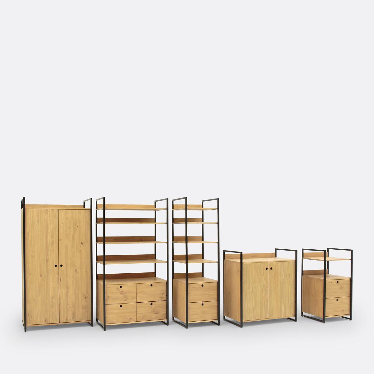 The Hiba 4-drawer, 4-shelf unit. Perfect for creating your own walk-in wardrobe. To be fixed to the wall or to be combined with other Hiba modules.Product Details • 4 drawers. • 4 external fixed shelves. • Black metal structure, matte finish. • Cabinet and shelves in solid pine, natural stained, nitrocellulose matt finish. Dimensions • Width: 100cm • Depth: 58cm • Height: 193cm • Drawer dimensions: 39 x 39 x 21cm. Delivery:Assembly required. Available for home delivery. Note! Please check that all access points are large enough to accommodate your delivery (doors, stairs, lifts).Dimensions and weight of parcel:2 parcels • 203 x 67.5 x 14.5 cm. 39kg • 109 x 62 x 17cm. 37kg