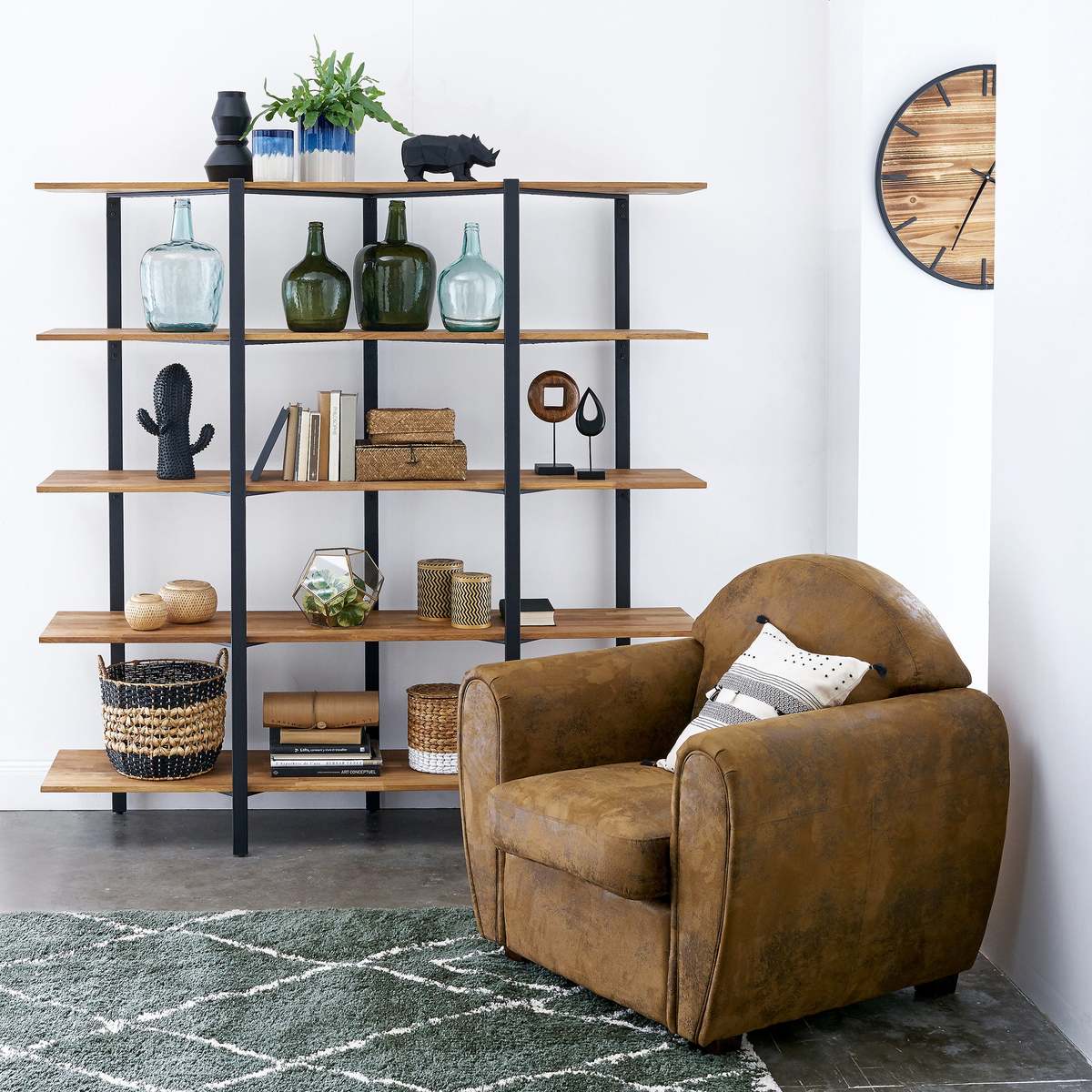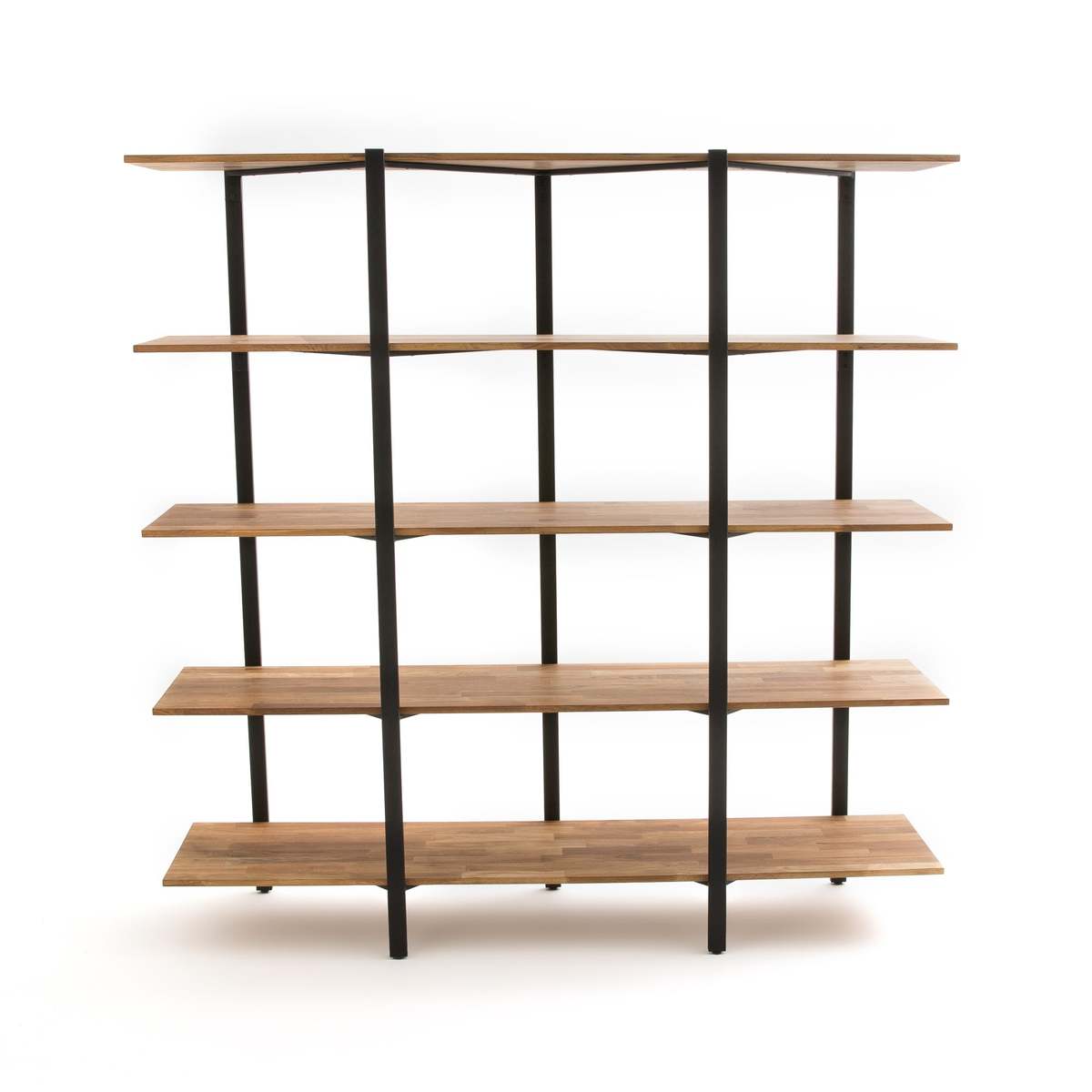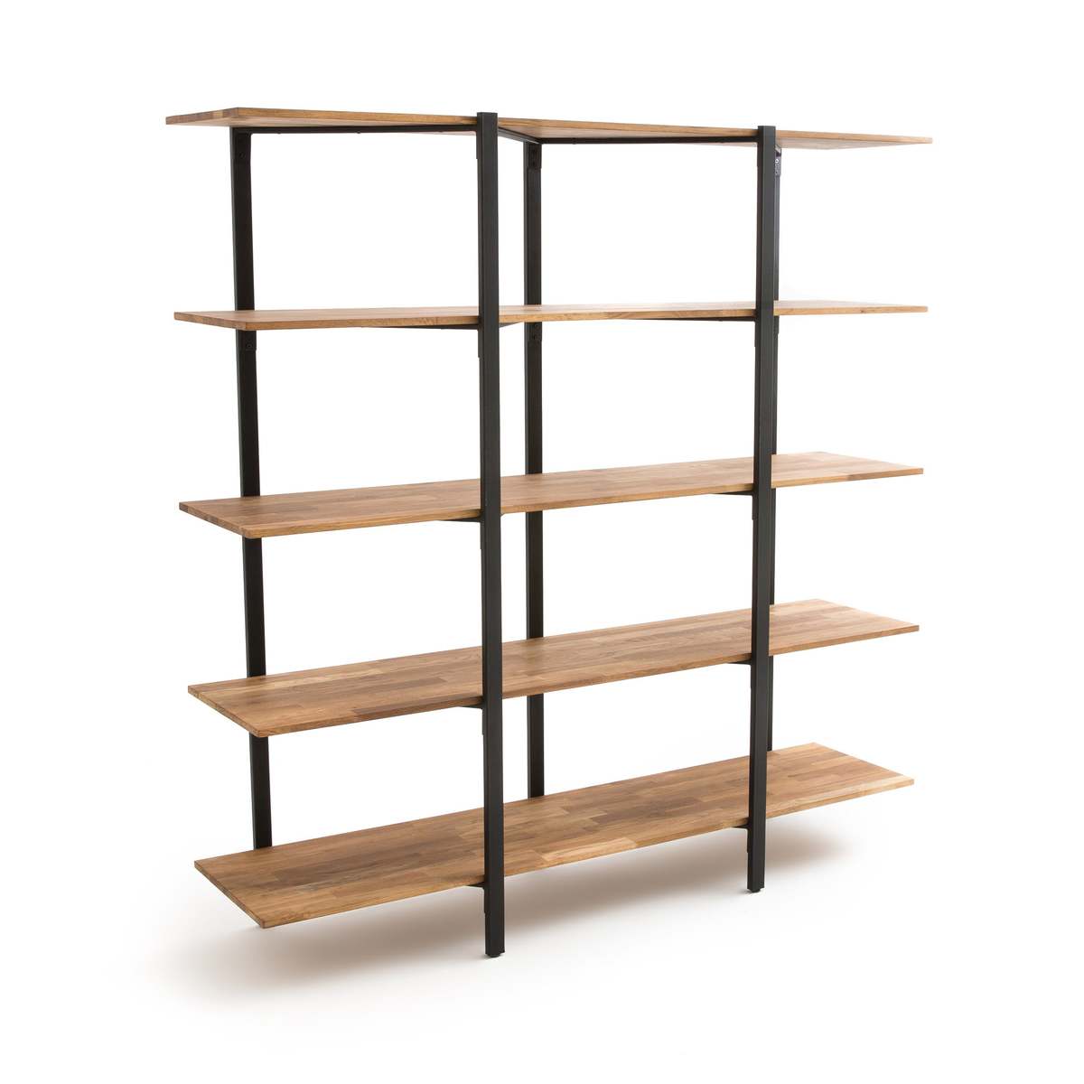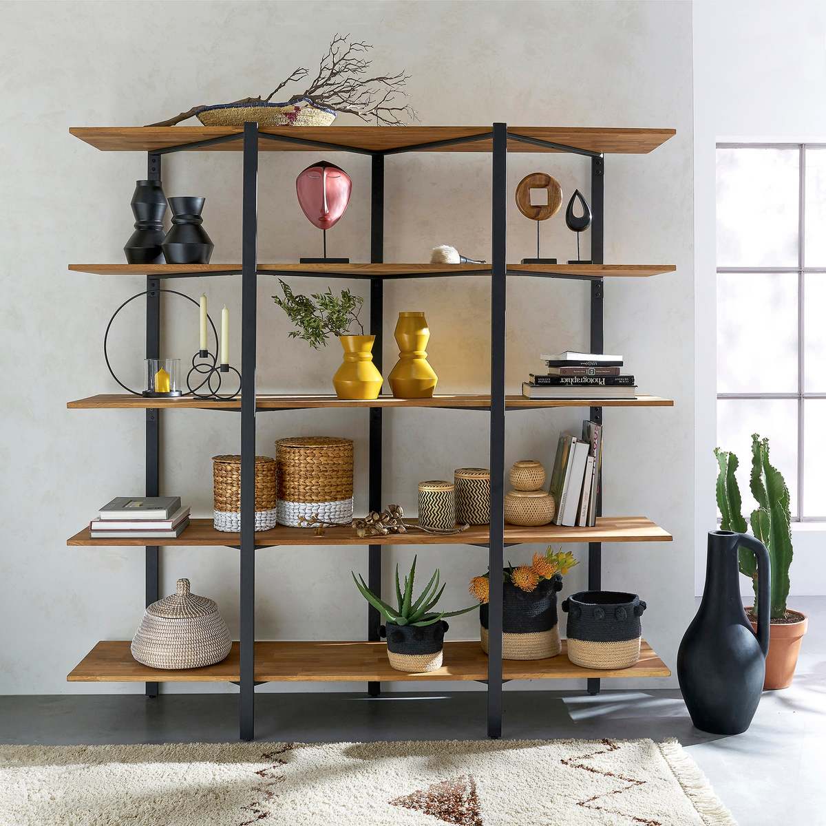 This large oak and metal shelf unit offers a sleek, industrial-modern look that works particularly well in contemporary and minimalist interiors. I love its versatility-pair it with neutral tones for a clean aesthetic or style it with colourful accessories and books for a lively, curated feel. It’s practical for organising everything from books and decorative objects to plants, and its open design encourages visual flow in a room. For styling tips, consider grouping similar items together and varying heights for visual interest, or add baskets on the lower shelves to keep clutter concealed. It’s a sturdy piece that adds warmth with the natural oak contrasted by the black metal, making it a functional yet stylish addition to living rooms, home offices, or dining areas.