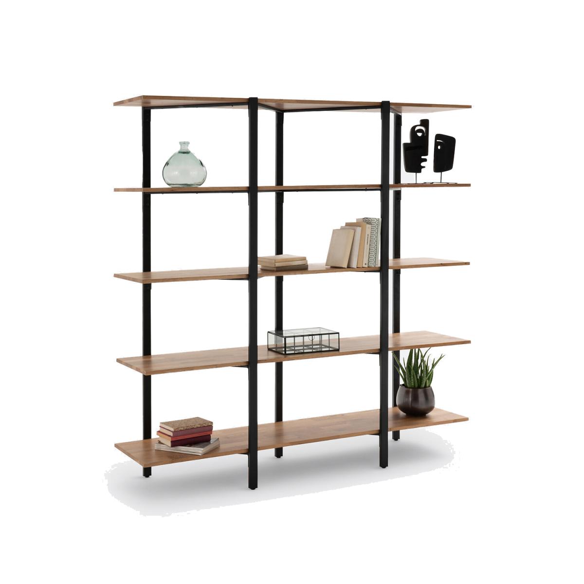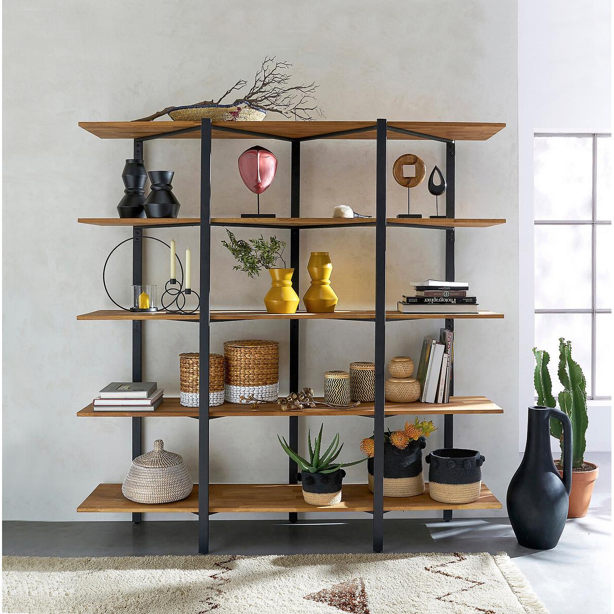 Sleek and modern. The Hiba collection plays with wood & metal. Enjoy its modern and graphic design. Perfect to reinvent your style!Product Details • Large size • 5 fixed shelves in solid oak jointed and varnished in nuanced colors • Matt black lacquered steel frame with an epoxy finish • 2 wall mounting brackets supplied (screws and wall plugs not supplied) • Plastic floor-protectorsDimensions. Total: • Width: 180cm • Height: 180cm • Depth: 44cm. Usable dimensions: • Height between the shelves: 38.5 to 39cmDelivery:. Assembly required. Available for home delivery. Note! Please check that all access points are large enough to accommodate your delivery (doors, stairs, lifts). Dimensions and weight of parcel2 parcels • L189 x H18 x D51 cm. 35kg. • L184 x H14.5 x D52 cm. 41.6 kg