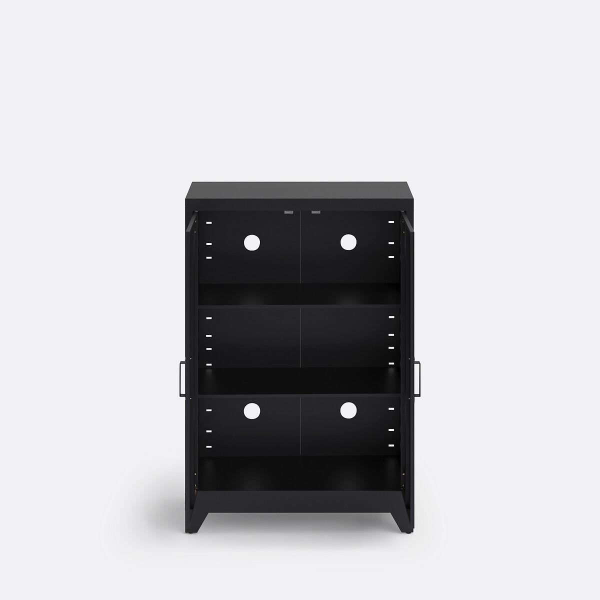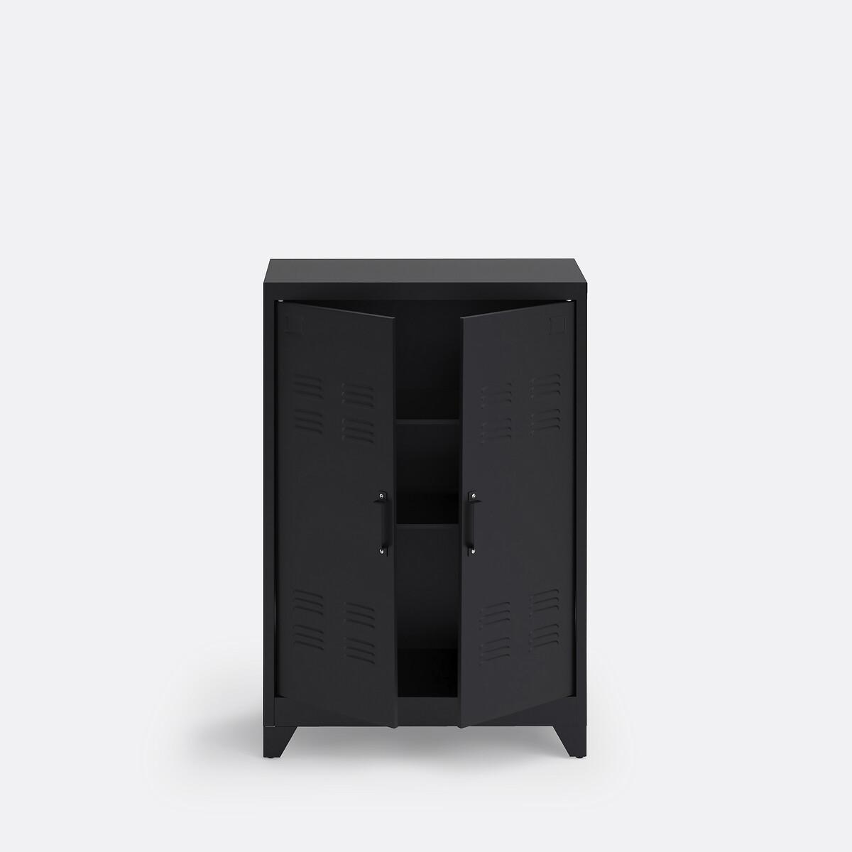 Add functional storage with industrial flair to your home using the Hiba Low Metal Cabinet. This sleek, durable unit includes two spacious, adjustable shelves and a magnetic door closure, making it ideal for organizing any room. Product Details • Epoxy-finish steel metal structure, base and handles • 2 doors • Inside: 2 large shelves, adjustable in height • Magnetic door closure • Adjustable legs: 4 plastic pads adjustable in heightDimensions. Total • Width: 75cm • Height: 110cm • Depth: 33cm. Usable dimensions: • Interior dimensions without shelves: L70 x H91.30 x D29cm • Height of legs: 8cm/3" • Weight: 21kgDelivery:. Assembly required. Available for home delivery. Note! Please check that all access points are large enough to accommodate your delivery (doors, stairs, lifts).Parcel dimensions and weight1 parcel • L116 x H22 x D47cm. 23kg.