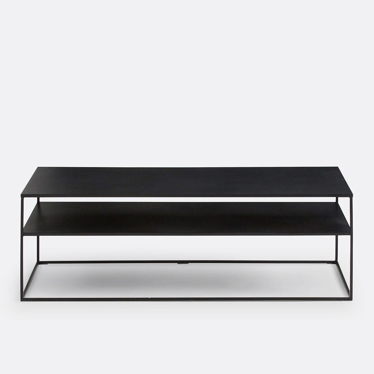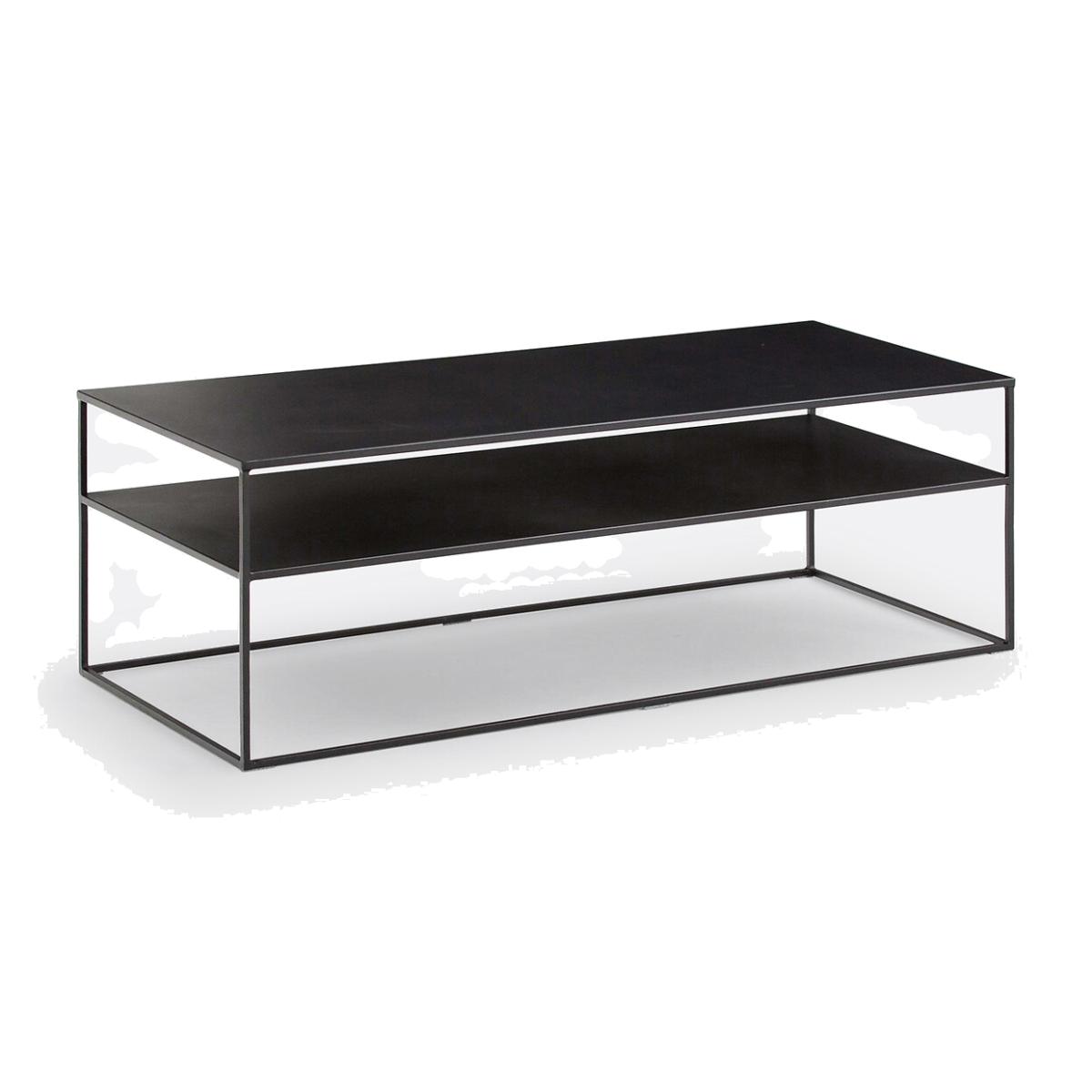 The Hiba coffee table. Practical, thanks to its double tabletop look for added storage, the Hiba coffee table boasts a bold industrial style. Product Details: • Double tabletop in steel with black epoxy finish • Sold pre-assembled. Dimensions • Overall:Width: 120cm x Height: 42cm x Depth: 50cm. • Useful space: Height between shelves: 14.5cm. See the full HIBA collection online. Dimensions and weight of parcel: • 1 box • L131 x H48 x D55cm. Home delivery :Your HIBA coffee table is sold pre-assembled. It will be delivered directly to your door!Note ! Please check that all access points are large enough to accommodate your delivery (doors, stairs, lifts).