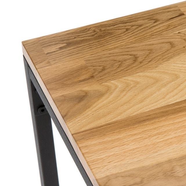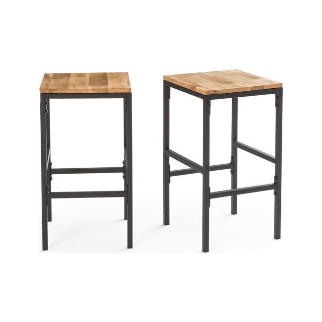 Two mid-height bar stools in solid oak. Inspired by industrial furniture, these solid oak and steel bar stools are ideal for use with tables or islands of approx 90cm high.