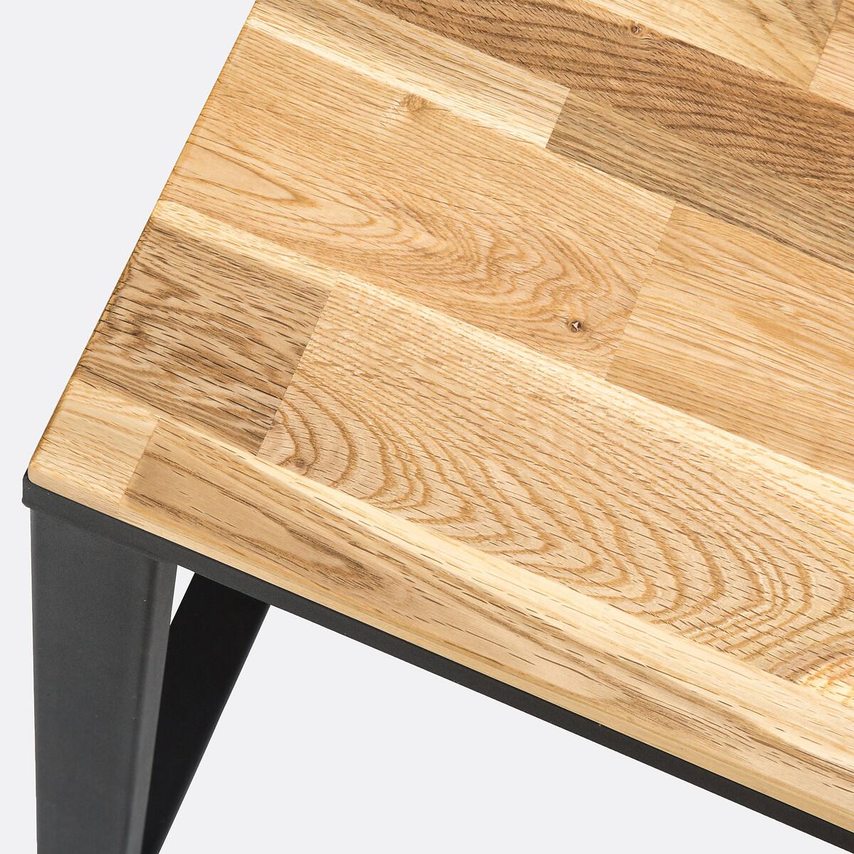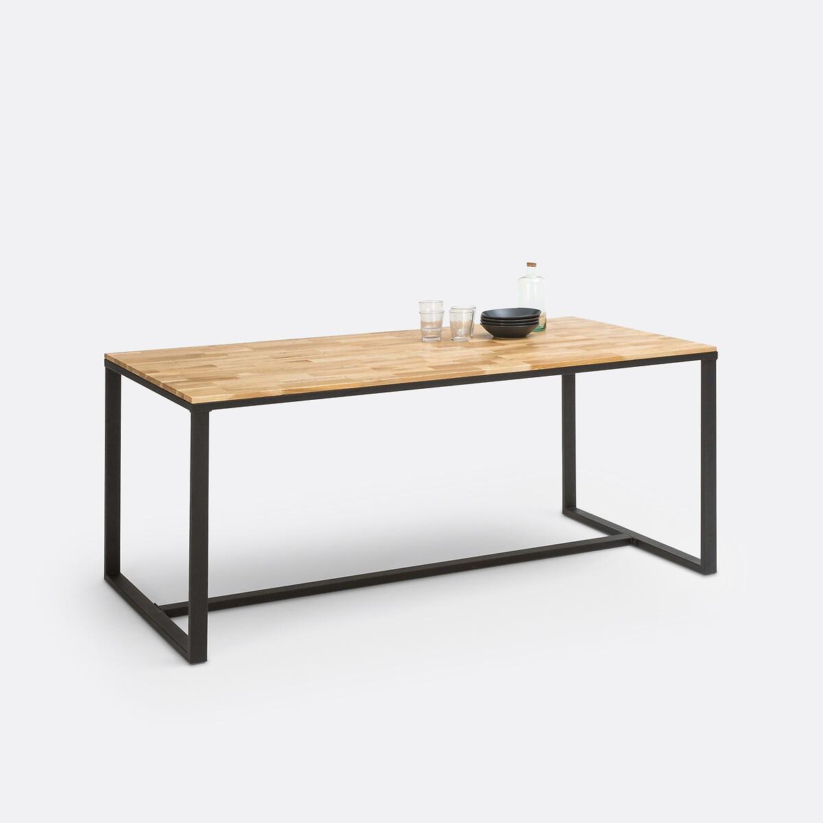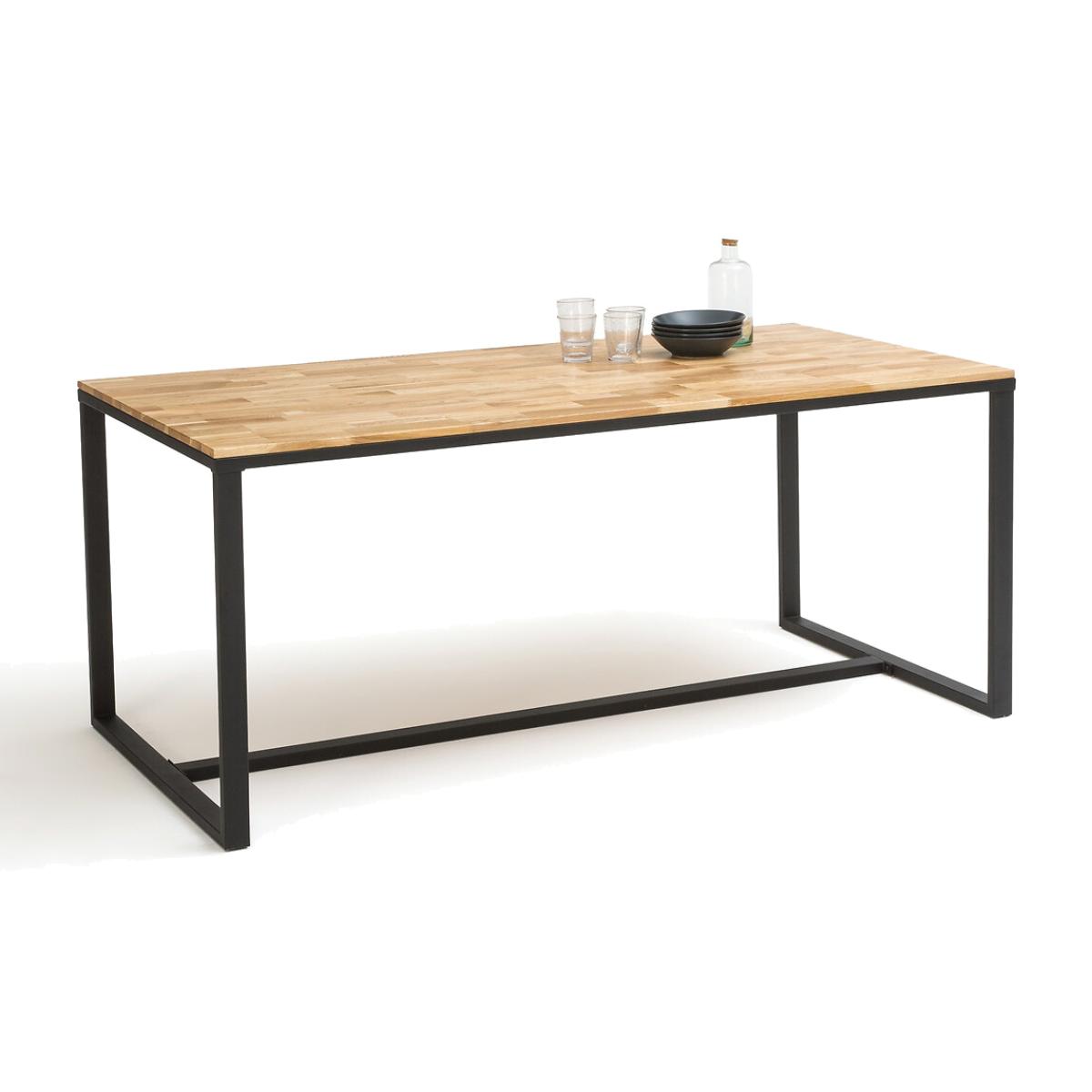 This contemporary dining table channels industrial design with its angular steel frame and solid oak top. Suitable for 4/6 diners, it's part of our Hiba collection: a range of coordinated furniture, directly inspired by old industrial furniture. Fans of Warehouse chic will love its sober and resolutely on-trend lines. Product Details • Seats up to 8. • Adjustable protective pads integrated into the base. • Jointed solid oak top with a nitrocellulose varnish finish. • Structure and sled base in matt black lacquered steel, epoxy finish, slightly raised finish. • Assembly: Approximately 1 hour, 2 people (minimum)Care instructions • To protect your table, consider trivets, coasters and placemats. Dimensions • L180 x H76 x L90cm. Delivery:This product is sold for self-assembly. Parcel dimensions and weight: • 1 parcel. • 190.5 x 101.5 x 17.5cm. 40kg.