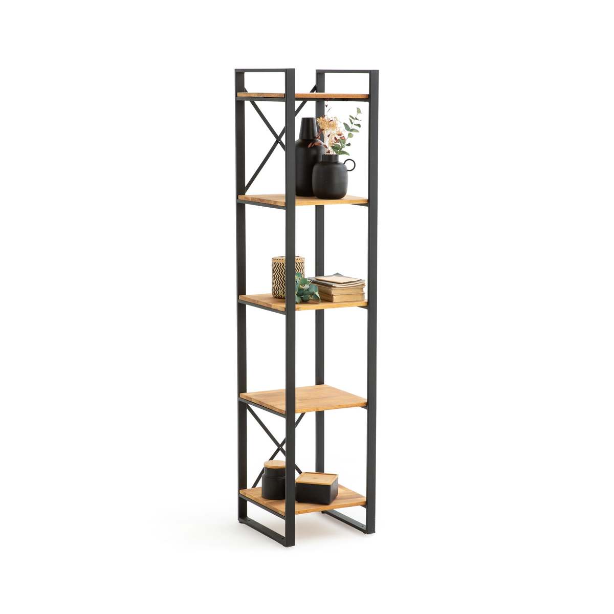 I really like this HIBA shelving unit because of its clean, industrial aesthetic with a warm touch from the walnut shelves. It works particularly well in contemporary or urban interiors, adding a functional yet stylish element to living rooms, home offices, or kitchens. When styling, consider balancing practical storage with decorative pieces-think ceramics, plants, or books to create visual interest. Its slim profile makes it ideal for smaller spaces or as a vertical statement without overwhelming the room. For a cohesive look, pair it with other dark metal or wood-toned furnishings to enhance its material palette and keep the overall vibe streamlined.