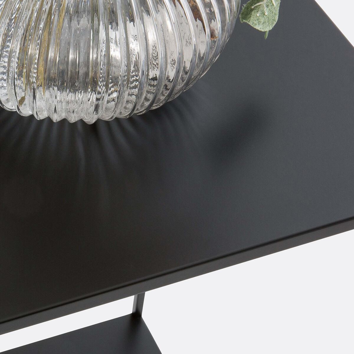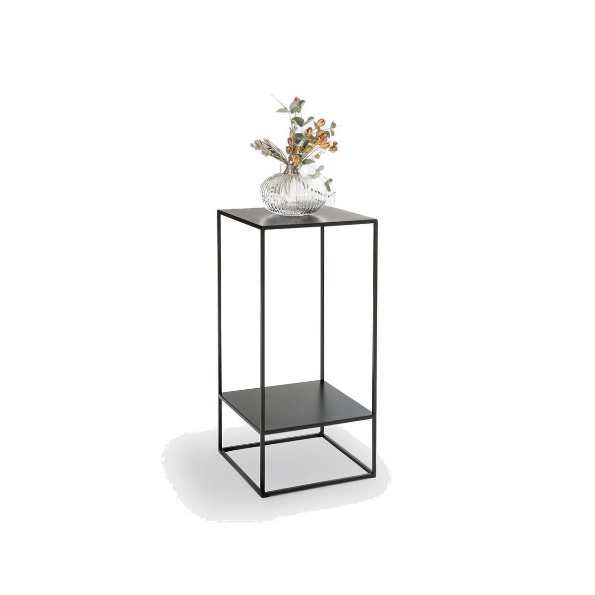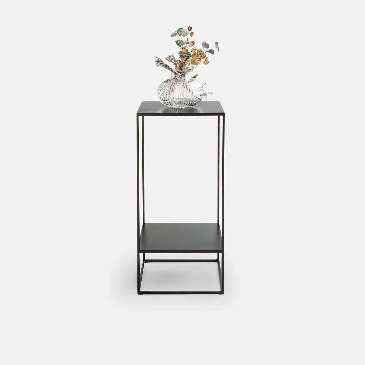 Hiba two tier metal side/pedestal table. Take a stand with Hiba: positioned at the end of a sofa or in a corner, its shallow depth allows for easy placement, even in smaller spaces. Product Details • Matt black lacquered steel with epoxy finish. • 2 tiers. Dimensions. Total: • L35 x H76 x D35cm. Usable dimensions: • Height between levels: 56cm. • Delivery:Sold pre-assembled. Available for home delivery. Parcel dimensions and weight:1 parcel. • L39.5 x H82 x D39.5cm. 7.2kg.