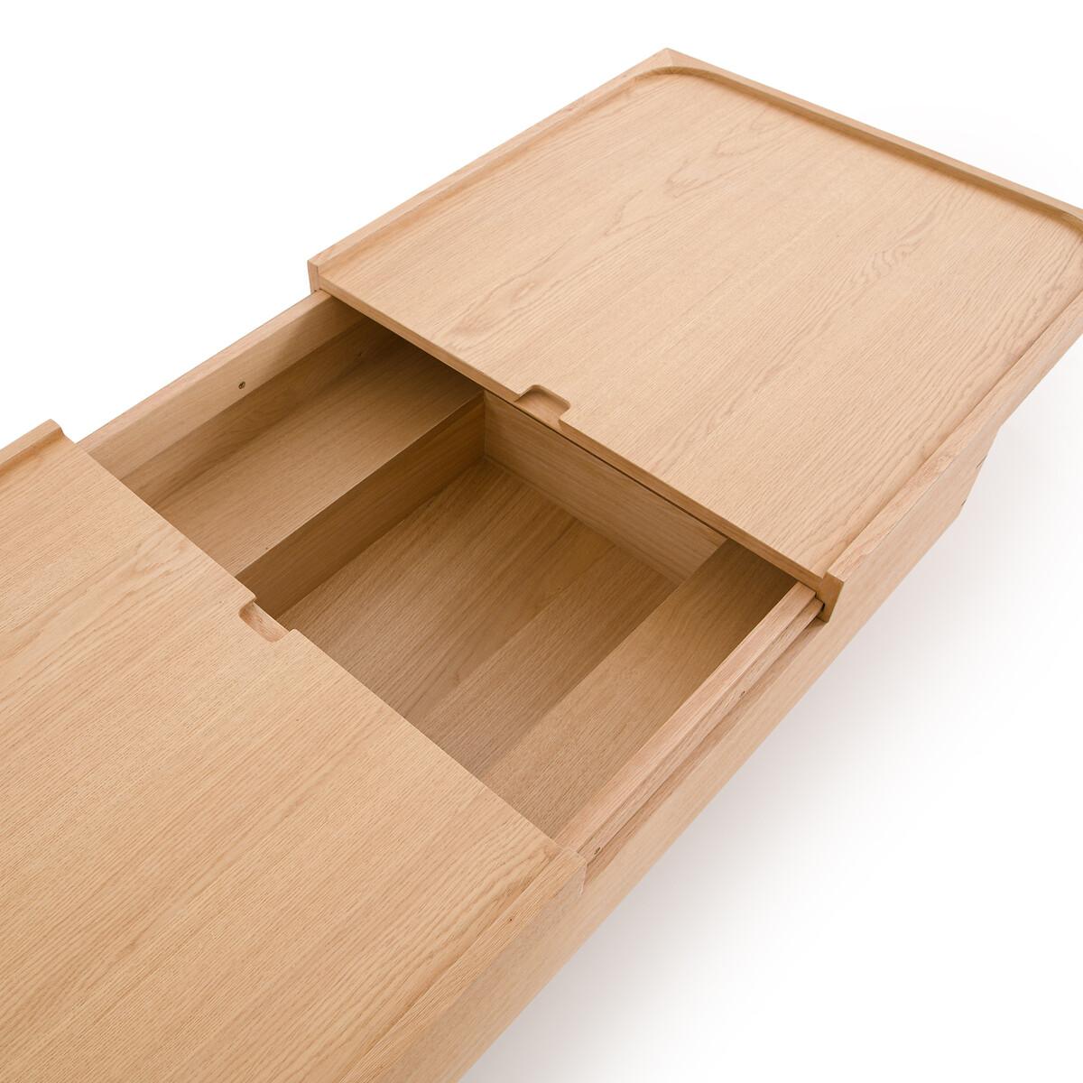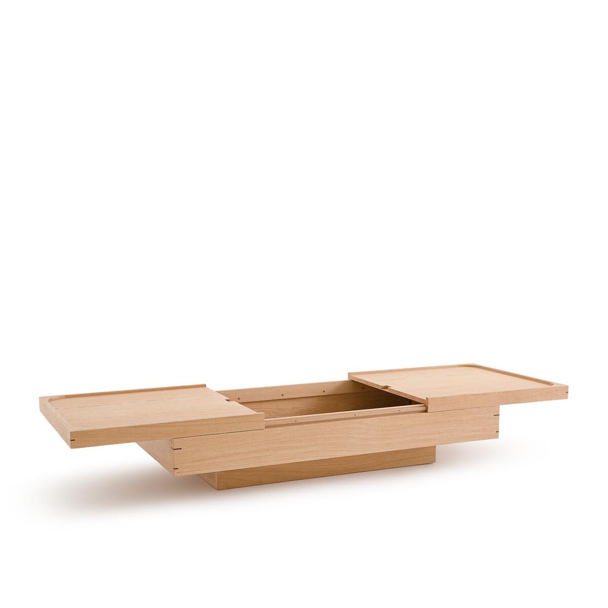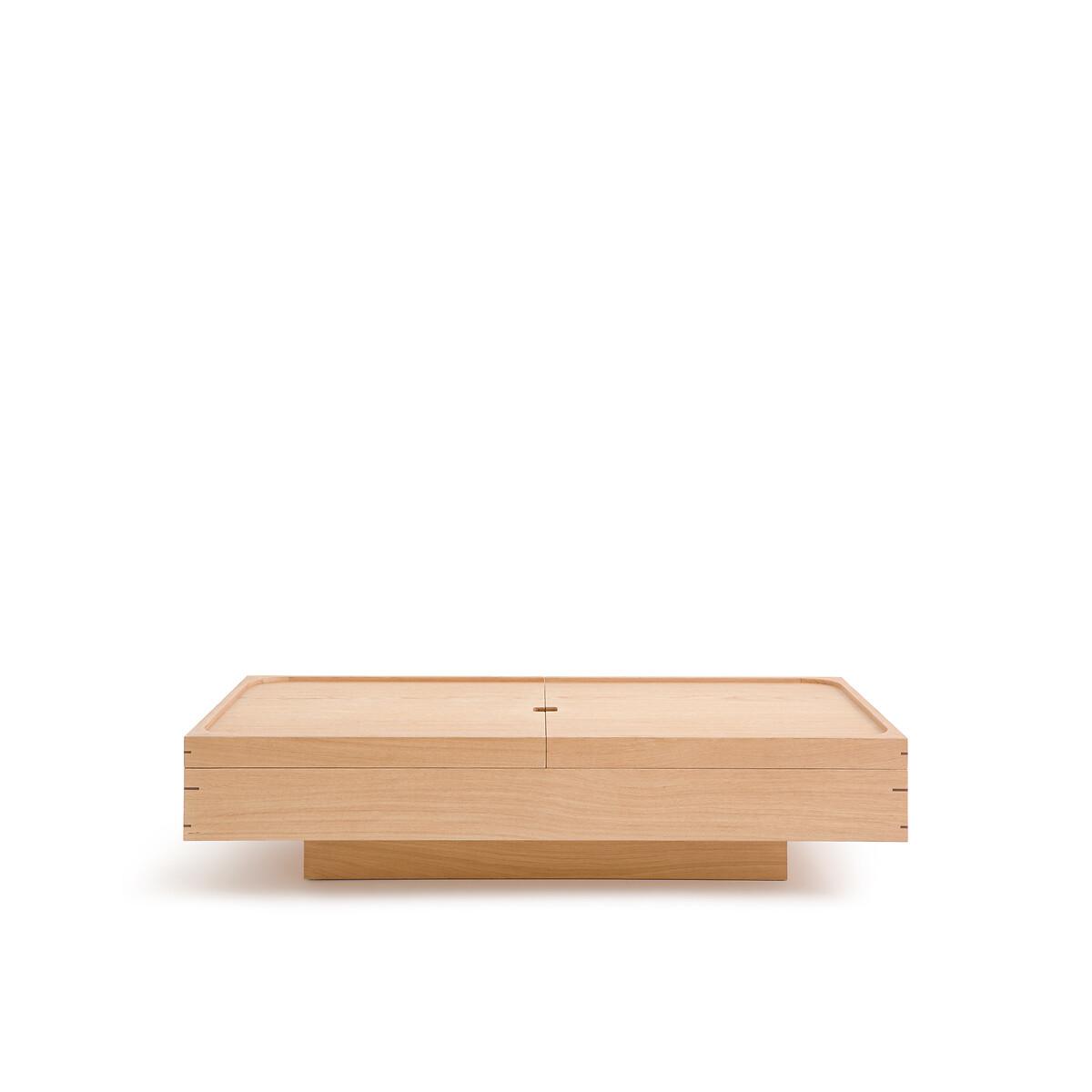 The seamless fusion of design and functionality. This coffee table was designed to optimise storage without showing anything. Like a cabinetmaker's box. Its top opens in two parts onto a space that can accommodate objects or blankets.. Its ingenious design and the care taken in its finishes are inspired by traditional Japanese art.. An AMPM creation. Product Details • Sliding top and central base in oak-veneered MDF, polyurethane varnish finish • Textured and FSC® certified sanded wood. Dimensions • Width: 140cm • Height: 32cm • Depth: 70cm • Open top dimension: 210cmDelivery:. Sold pre-assembled. Available for home delivery. • WOOD FROM SUSTAINABLY MANAGED FORESTS. FSC® certified wood comes from forests that are environmentally, socially and economically well managed. Parcel dimensions and weight • 1 parcel • L149 x H42 x D78cm. 49kg
