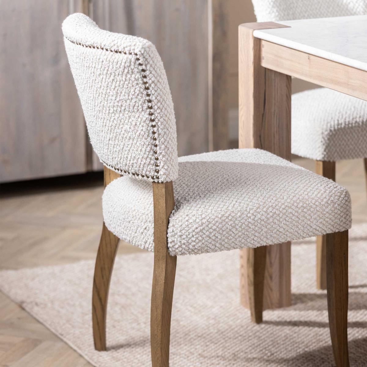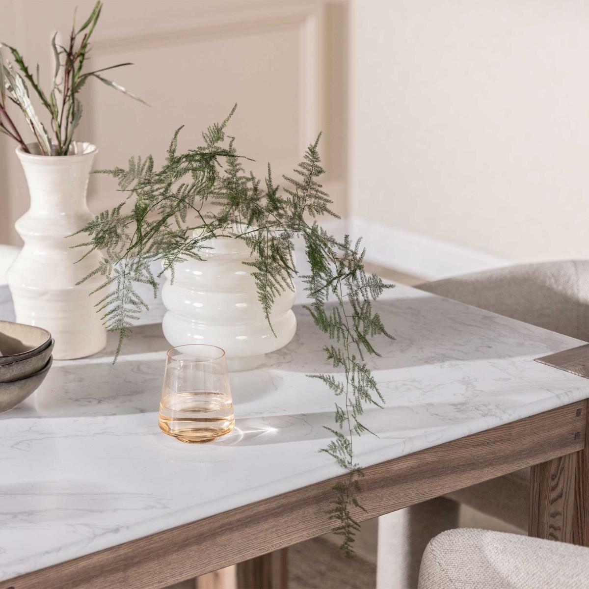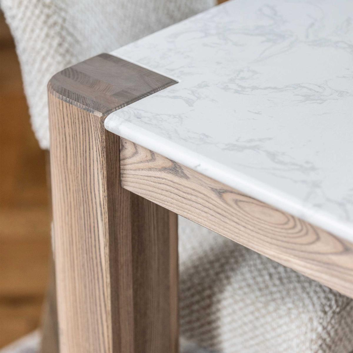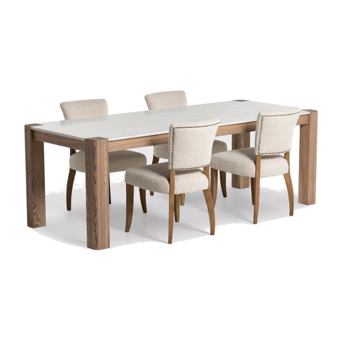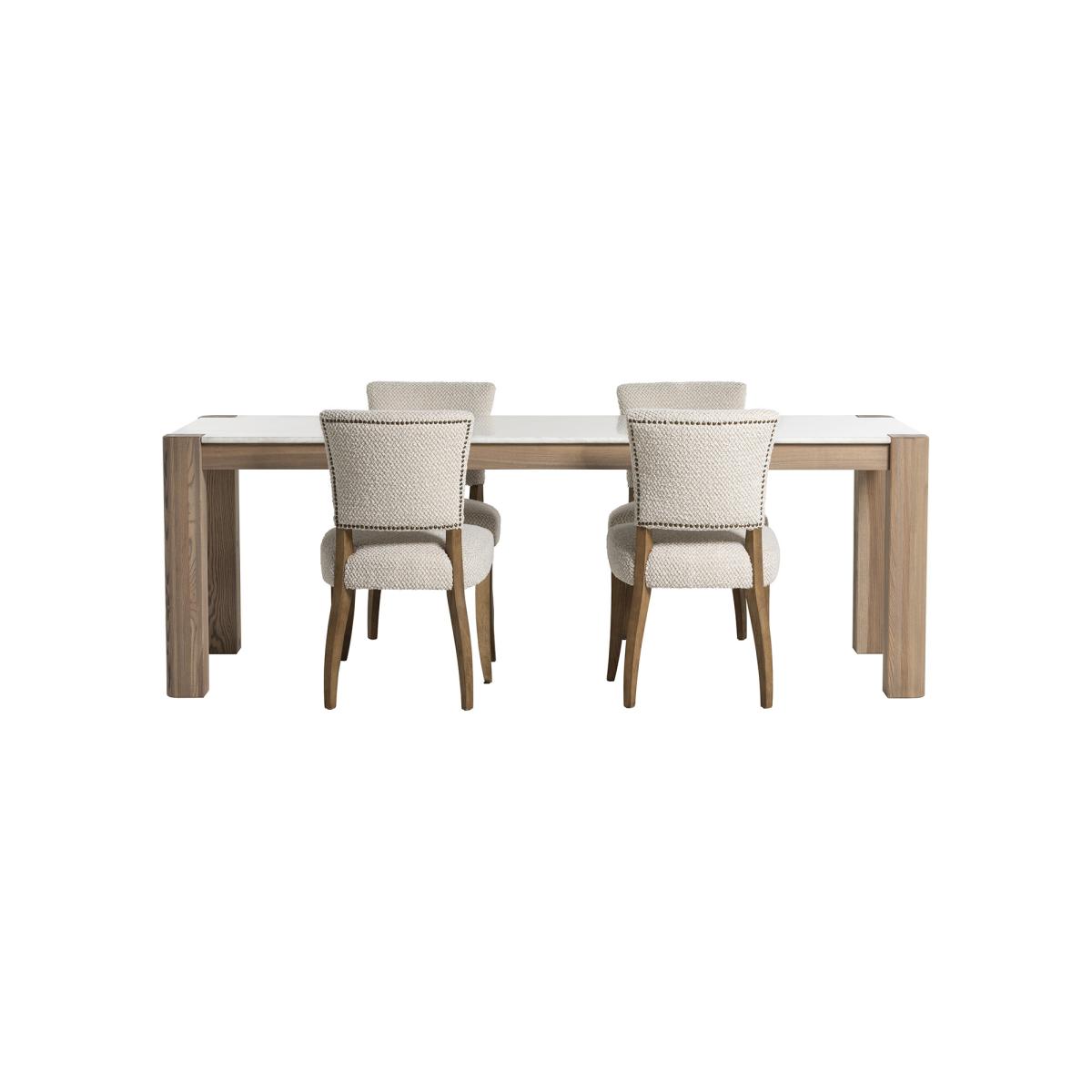 Make a refined statement in your dining space with the Hickory Ash Wood 230cm Dining Table With Stone Top and 4 Otto Textured Fabric Dining Chair with Antique Brass Studs. Featuring a bold blend of natural solid ash wood and a sleek stone top, the table balances rustic warmth with modern sophistication. Paired with four Otto dining chairs, upholstered in textured linen-look fabric and accented by elegant antique brass studs, the set exudes understated drama. Curved ash wood legs on the chairs echo the table's artisanal charm, while plush seating ensures comfort. A perfect mix of style and substance, this set elevates dining for four with effortless grace