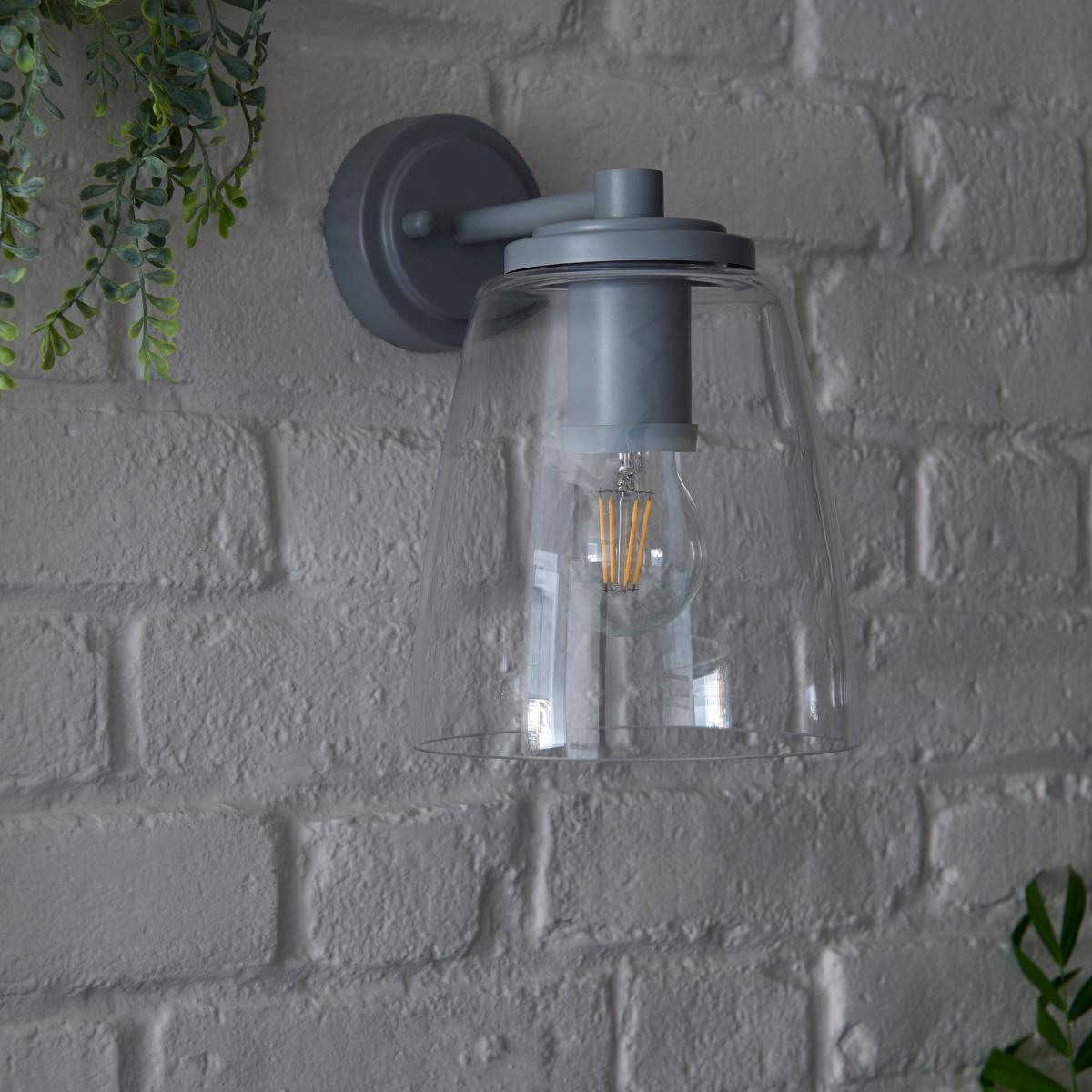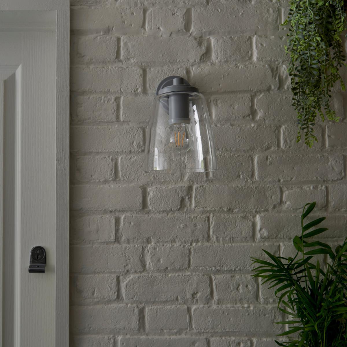 I love this wall light for its sleek, understated design and versatile grey finish, making it a great addition to both modern and rustic exteriors. It works particularly well in contemporary gardens or along pathways where you want a subtle, functional light that doesn’t overpower the overall aesthetic. Practical styling tips include pairing it with other outdoor grey or neutral-toned fixtures for a cohesive look, and installing it at eye level or slightly above doorways to create inviting ambiance while ensuring adequate illumination. Its clear glass shade also adds a hint of industrial charm, making it suitable for both minimalist and more traditional outdoor spaces.