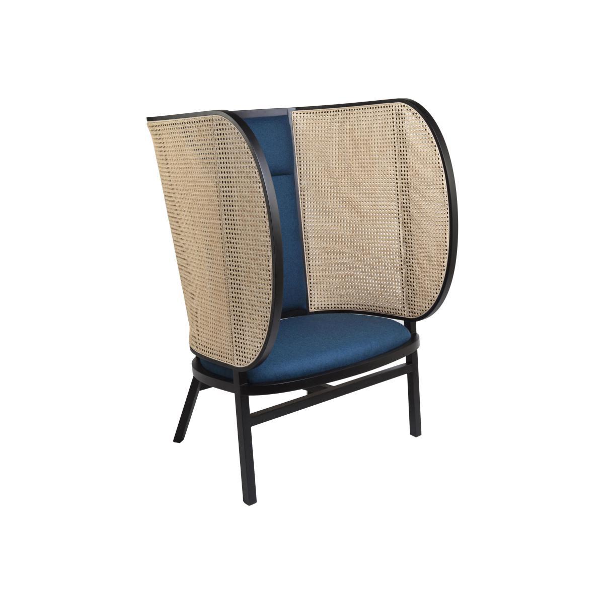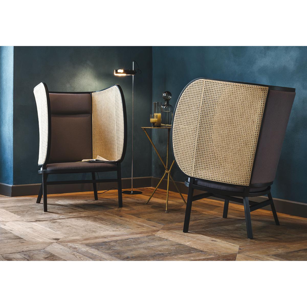 With Hideout, the trio of Swedish Front designers is offering a new take on the classic wing chair. This is a chair that breathes great modernity, combined with the timeless elegance of the first Thonet furniture. Its ample shapes and incredible mix of materials create a strong personality. The high, enveloping backrest forms an impressive bulwark, creating an area of privacy. The seat and central part of the backrest are padded and covered with a top-of-the-range pure virgin wool Kvadrat fabric. The backrest extends around the sides creating caned natural straw armrests. The openwork protects the seated person from view, for seeing without being seen. The perforations form a delicate, graphic pattern. The black square-section structure is in steam-bent natural beechwood. With its soft padding, generous dimensions and high reclining back which serves as a headrest, the Hideout chair is a super-comfortable cocoon, ideal for relaxing. Rich materials, high standards of quality, exceptional finishes and an original form, all wonderfully characteristic of the Wiener GTV Design spirit.