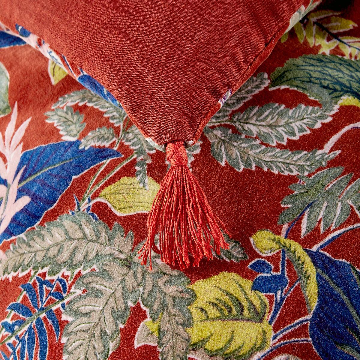 .Hiemala throw. Pretty leaf print with tassels at all 4 corners. 100% cotton velvet, plain back in 100% linen, trim in 100% polyester. Machine washable at 30°C. Size: 90 x 200cm.