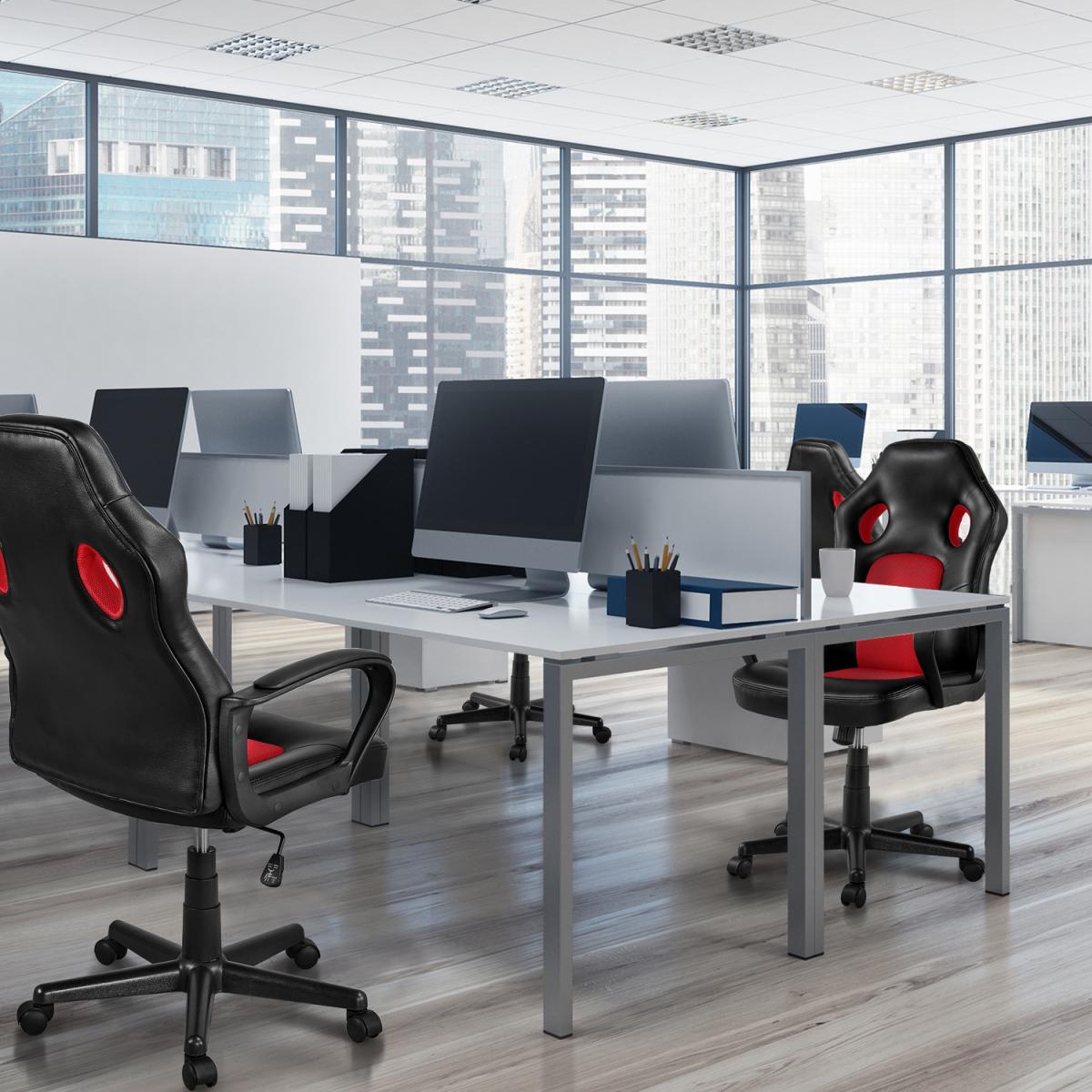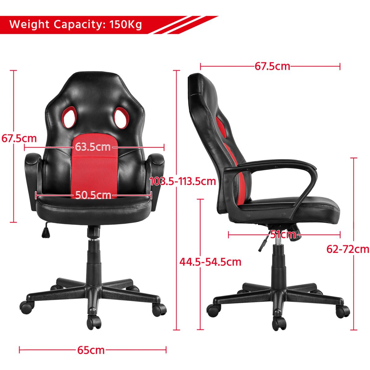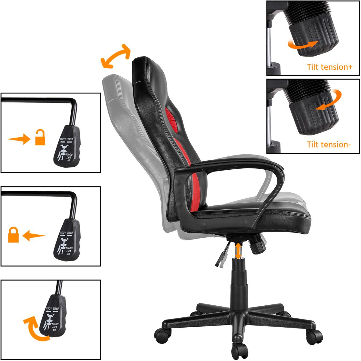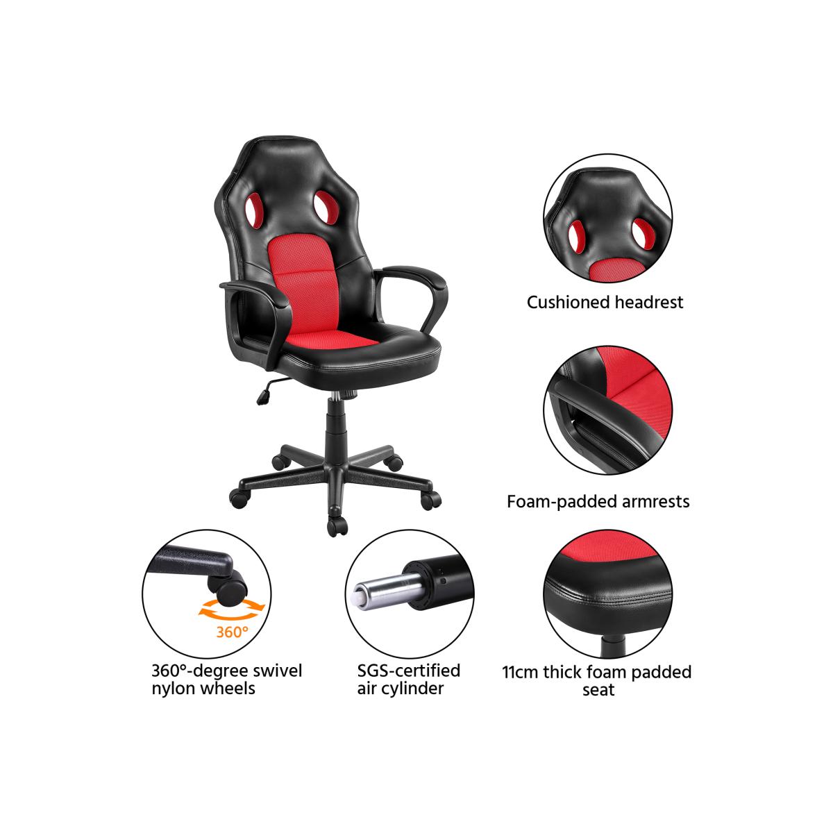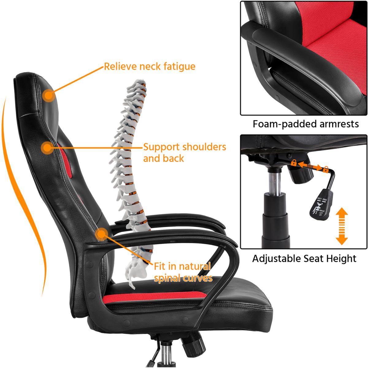 When working and gaming are getting intense, a nice featured racing-style swivel chair is ready to make your day. Combined with a mesh artificial leather cover, which breathable mesh allows the air to pass through, synthetic leather is both easy to clean and long-wearing Ergonomic design with S-shaped back optimizes the supporting feature to cuddle individuals back and lumbar Adjustable seat height and center-tilt tension leave users more space to customize their own sitting position Five mute castors create 360 degree smooth mobility, helping you move effortlessly from task to task Featuring sturdy metal frame padded with high-density sponge, our racing-style office chair is comfortable and built to last.