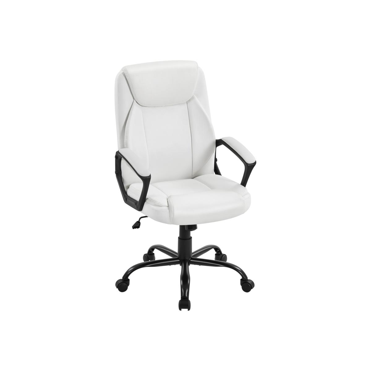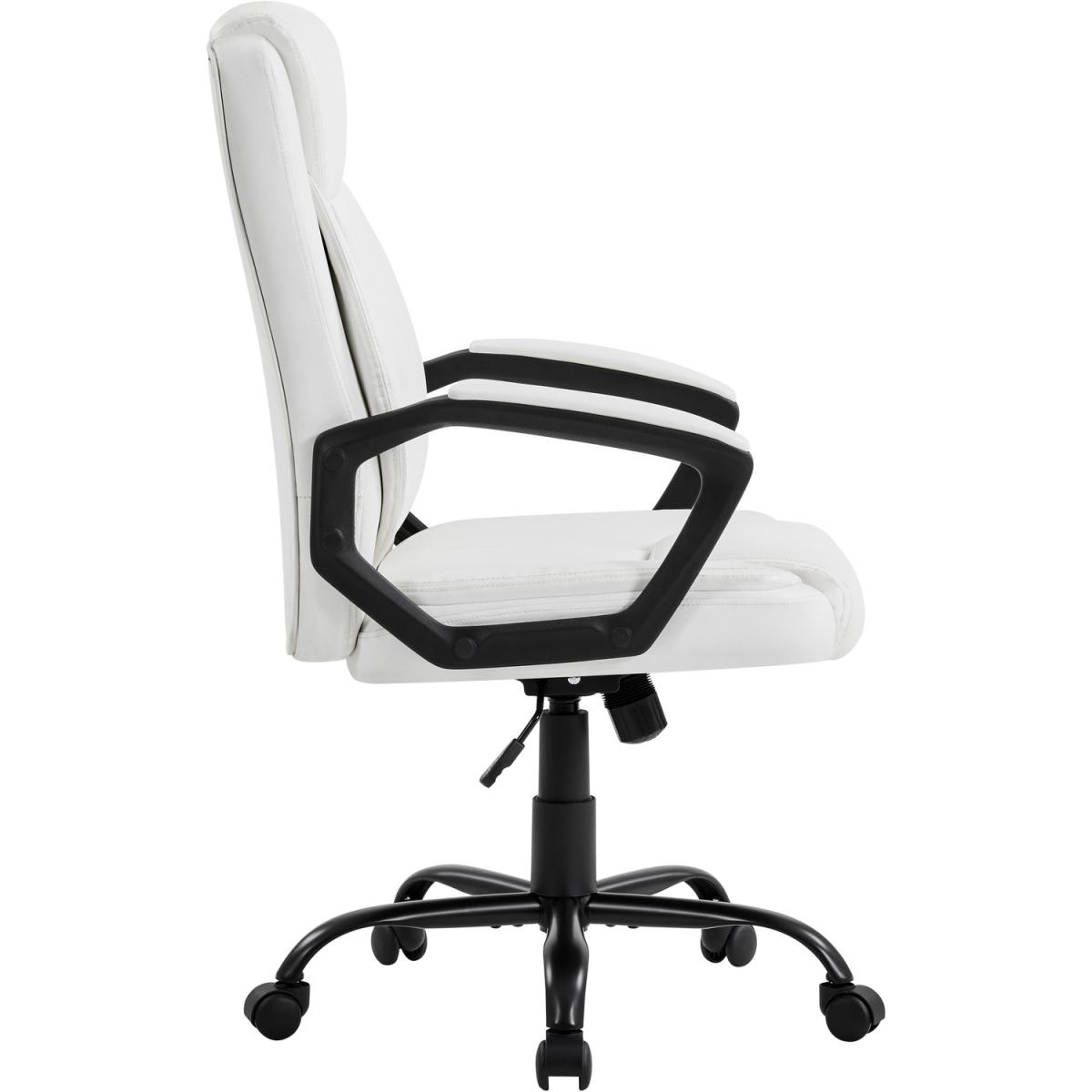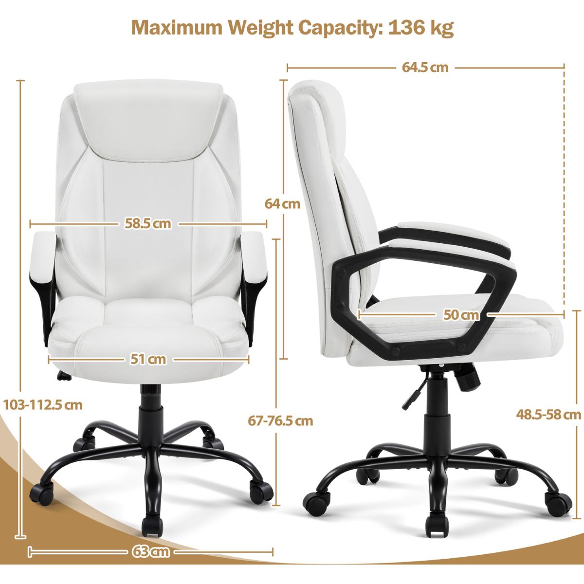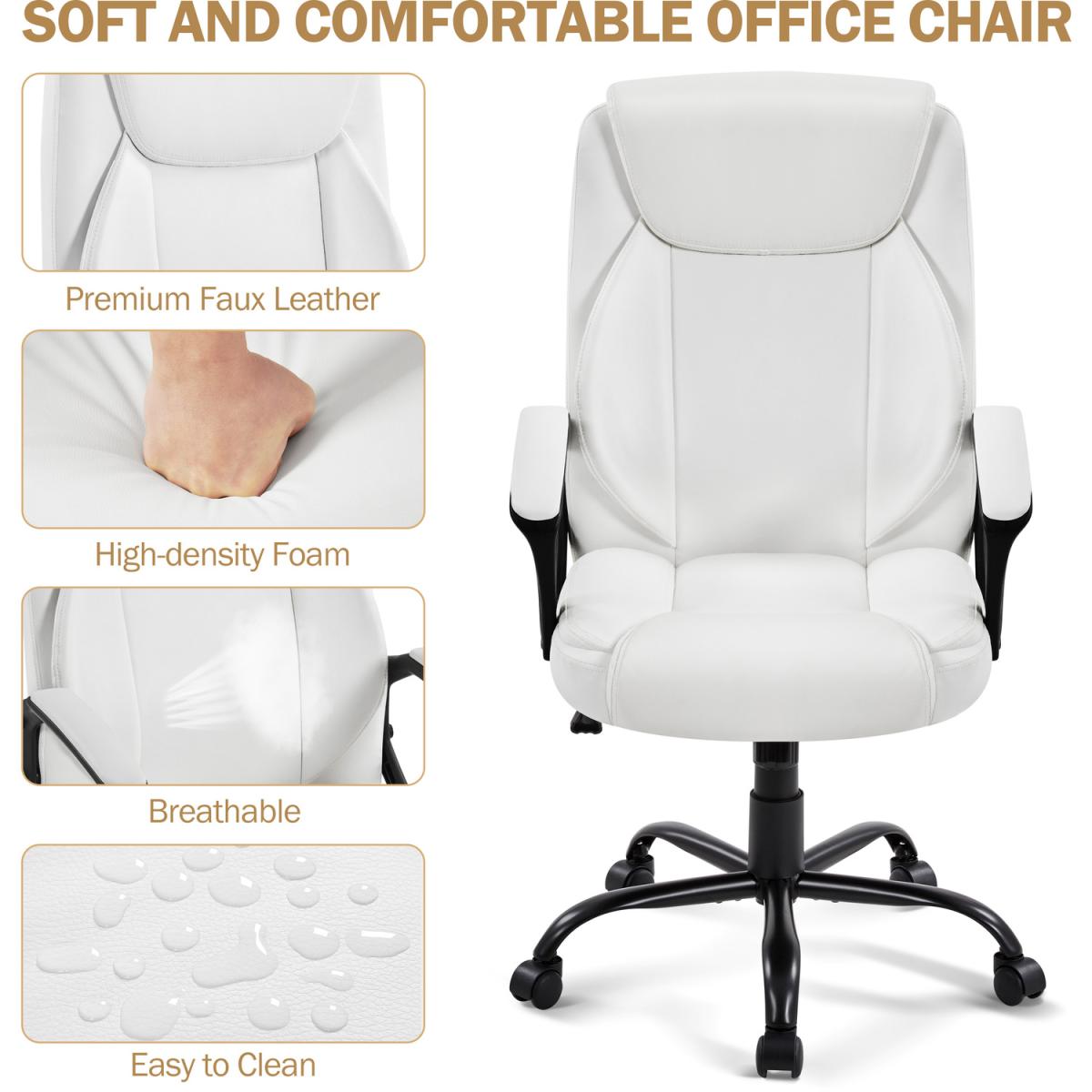 This appealing faux leather computer chair checks all the boxes. The combination of smooth faux leather texture and matte black base will give your workspace a more upscale appearance. A durable steady frame makes sure our customers enjoy comforts and relaxing sitting. The seat height is adjustable according to personal preference. The foam-padded seat and high back provide optimal body support and relieve muscle tension caused by long hours of working, meeting, or studying. It has a rocking feature as well. Mute castors allow 360 smooth mobility without scratching the floor. A versatile addition to study rooms, offices, home offices, reception areas and libraries.
