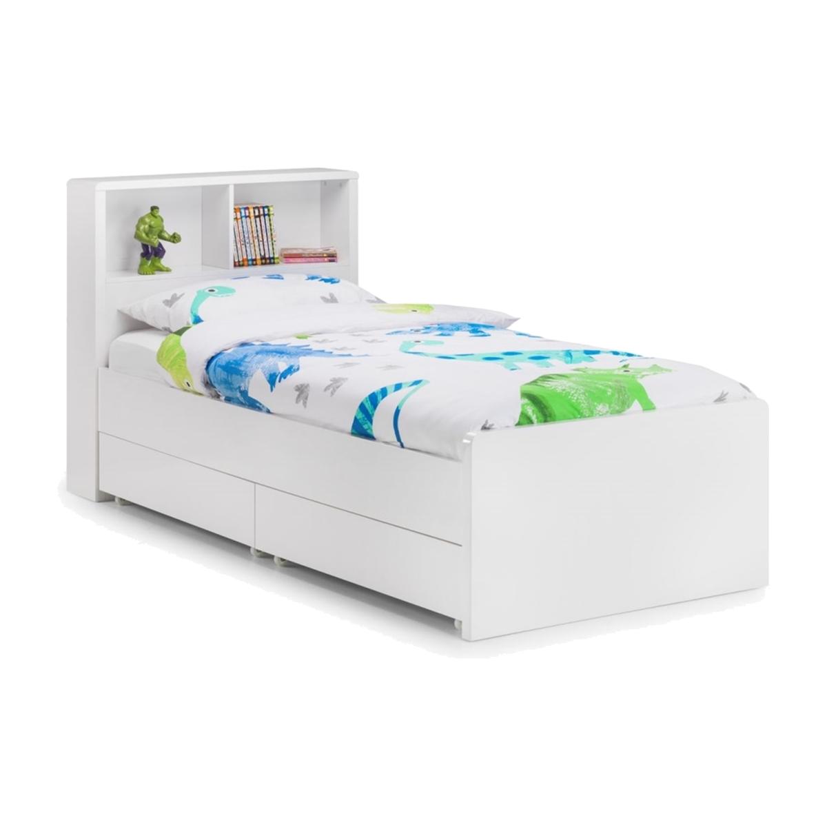 I love this white gloss bookcase bed frame for its sleek, modern aesthetic and versatility. Its clean lines work particularly well in contemporary interiors, especially those with minimal or monochrome palettes, but it can also add a crisp touch to a more eclectic space. To style it effectively, consider leaving the headboard shelf open for display items like favourite books or decorative toys, making it functional as well as decorative. For a balanced look, pair it with neutral bedding and add colour through accessories such as cushions and throws. Practical tip: utilise the shelf to keep bedtime essentials within easy reach, while keeping the bedside table clutter-free for a tidy, streamlined look.