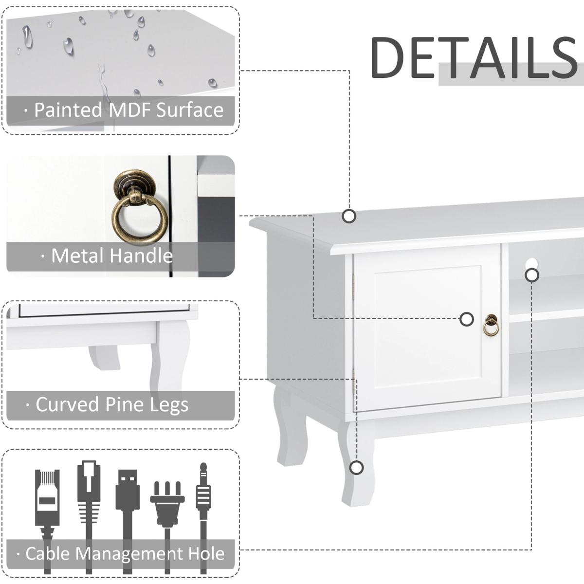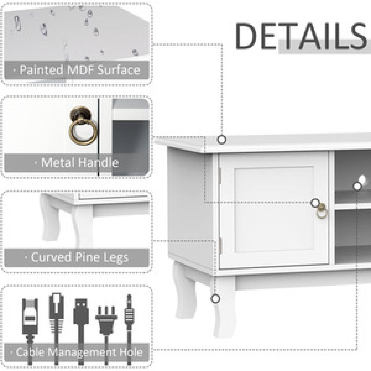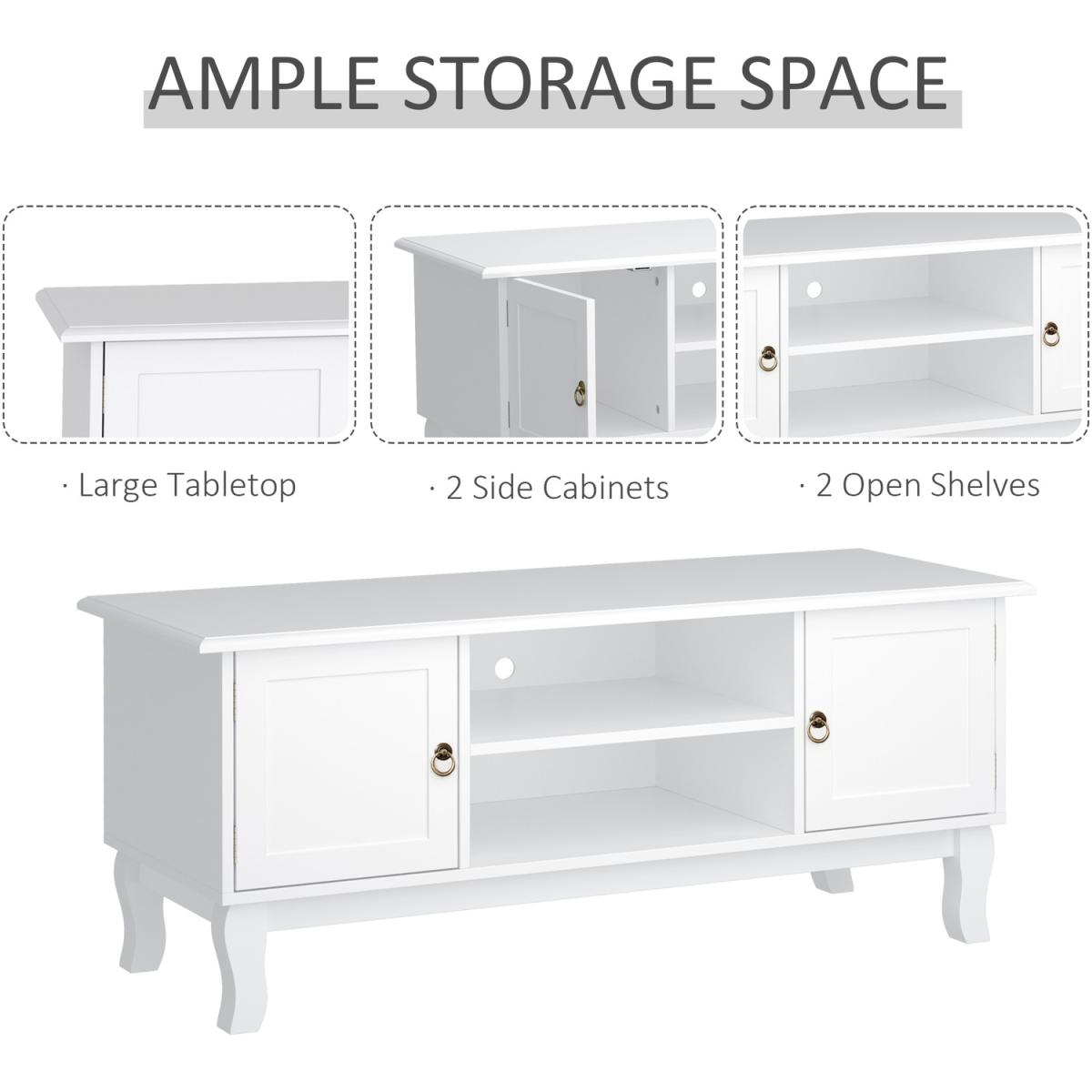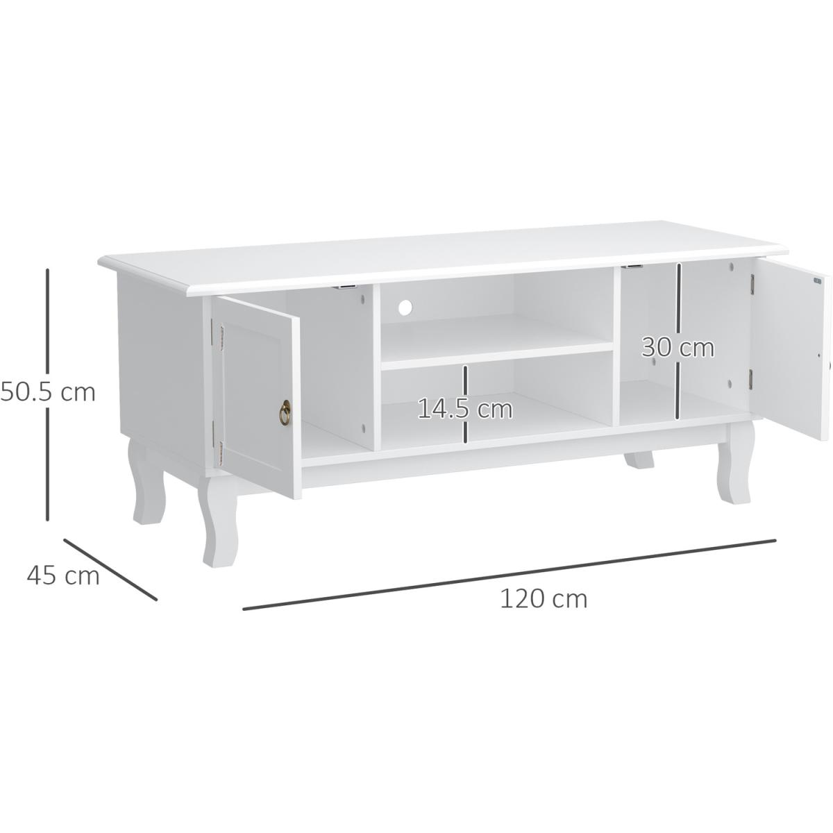 The stylish TV stand from HOMCOM features painted MDF and curved solid pine wooden legs, to create an inviting modern and classical atmosphere and also ensures reliable stability and durability. The smooth materials make it easy to clean with a soft cloth. The spacious design with 2 cabinets and 2 open shelves provides ample room for your DVDs, remotes, magazines and other small items. The cabinet doors with handles and stoppers are easy to open and close. You can organize the cables neatly in place, thanks to the hole on the backboard. Add the spacious stylish TV stand to your home and office, creating an ideal entertainment centre.