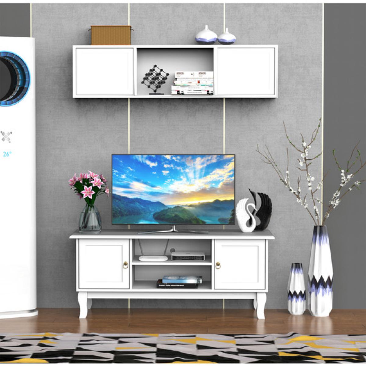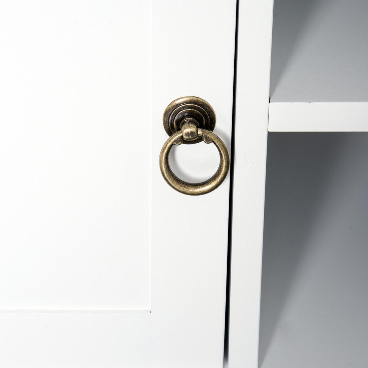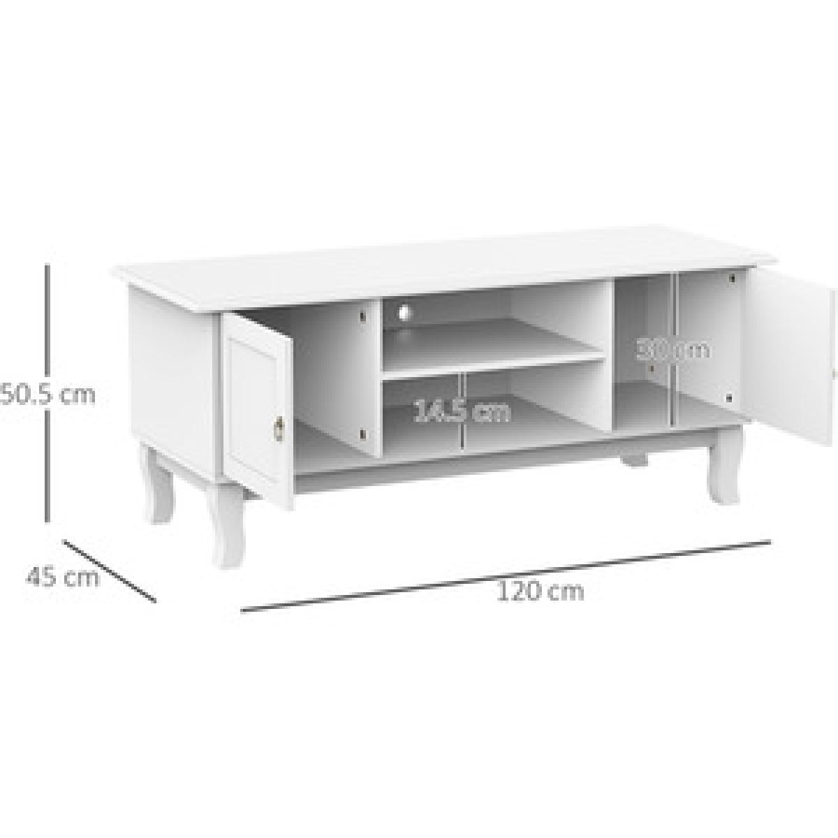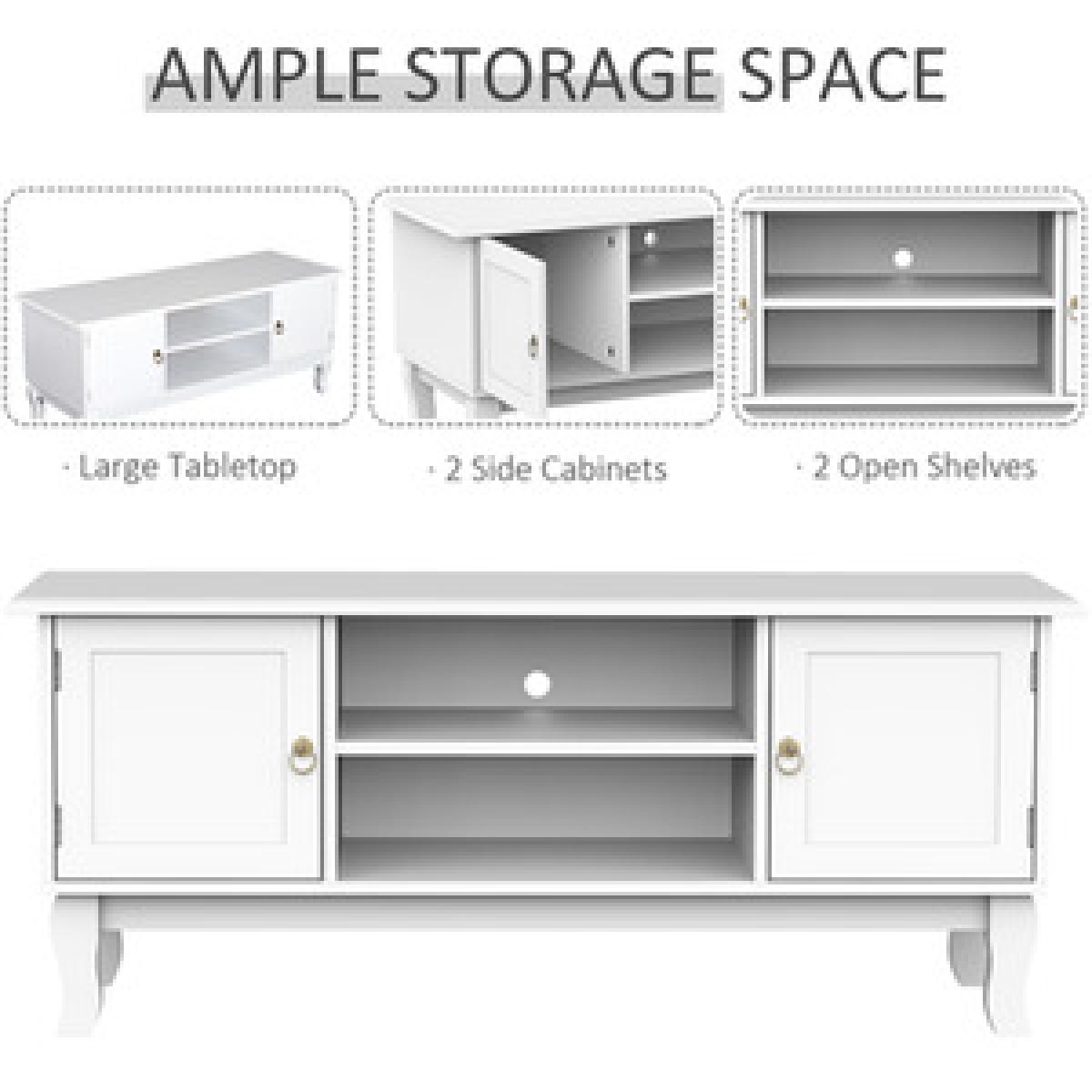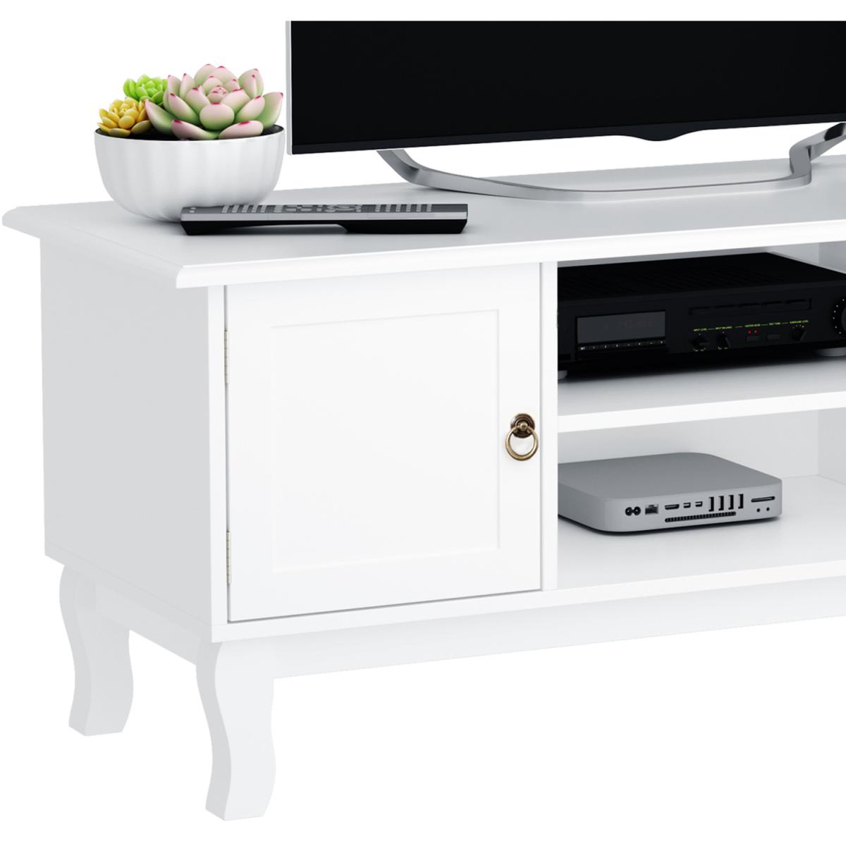 The stylish TV stand from HOMCOM features painted MDF and curved solid pine wooden legs, to create an inviting modern and classical atmosphere and also ensures reliable stability and durability. The smooth materials make it easy to clean with a soft cloth. The spacious design with 2 cabinets and 2 open shelves provides ample room for your DVDs, remotes, magazines and other small items. The cabinet doors with handles and stoppers are easy to open and close. You can organize the cables neatly in place, thanks to the hole on the backboard. Add the spacious stylish TV stand to your home and office, creating an ideal entertainment centre.