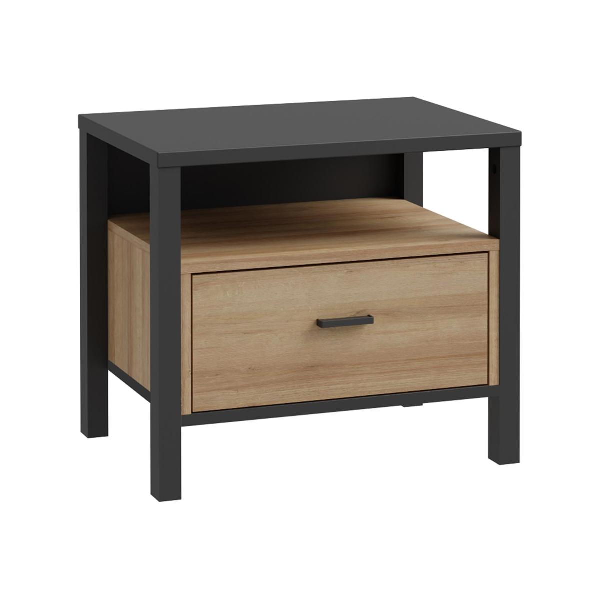 The High Rock Bedside Table is a captivating and contemporary piece with a perfect blend of the Riviera Oak decor with deep black accents. It immediately captivates attention with its originality. The sleek black metal handles add a touch of elegance, while the table boasts robust metal legs in a frame-like design, contributing to a distinct loft character within the space. Beyond its striking aesthetics, the High Rock Bedside Table prioritises functionality with its ingenious storage solutions, as the table includes a storage shelf and drawer for all your nighttime essentials.