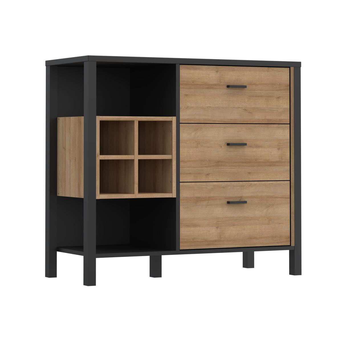 Elevate your interiors with the High Rock Display Chest in a striking matt black and oak finish. Its bold industrial design makes it a standout feature while blending seamlessly into modern living spaces. With three spacious drawers and open display sections, it offers both concealed storage and room to showcase your favourite decor pieces. The combination of sturdy board construction and ABS edging ensures long-lasting strength and resistance to daily wear.