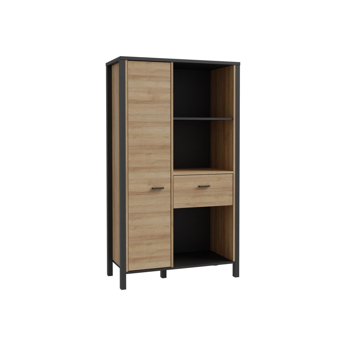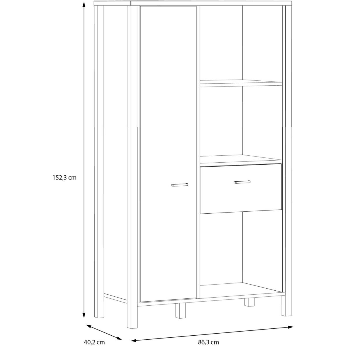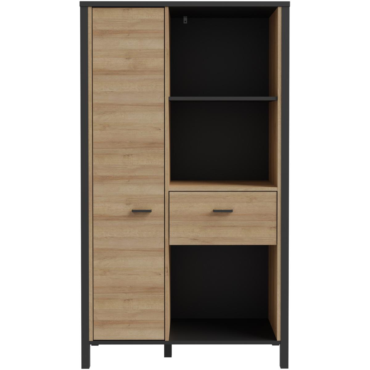 The High Rock Wide Shelf Unit is captivating and contemporary with a perfect blend of the Riviera Oak decor with deep black accents. The unit immediately captivates attention with its originality. The sleek black metal handles add a touch of elegance, while the cabinet boasts robust metal legs in a frame-like design, contributing to a distinct loft character within the space. Beyond its striking aesthetics, the High Rock shelving unit prioritises functionality with its ingenious storage solutions. It offers ample storage with shelves and a spacious drawer, helping to keep your space organised and looking its best.
