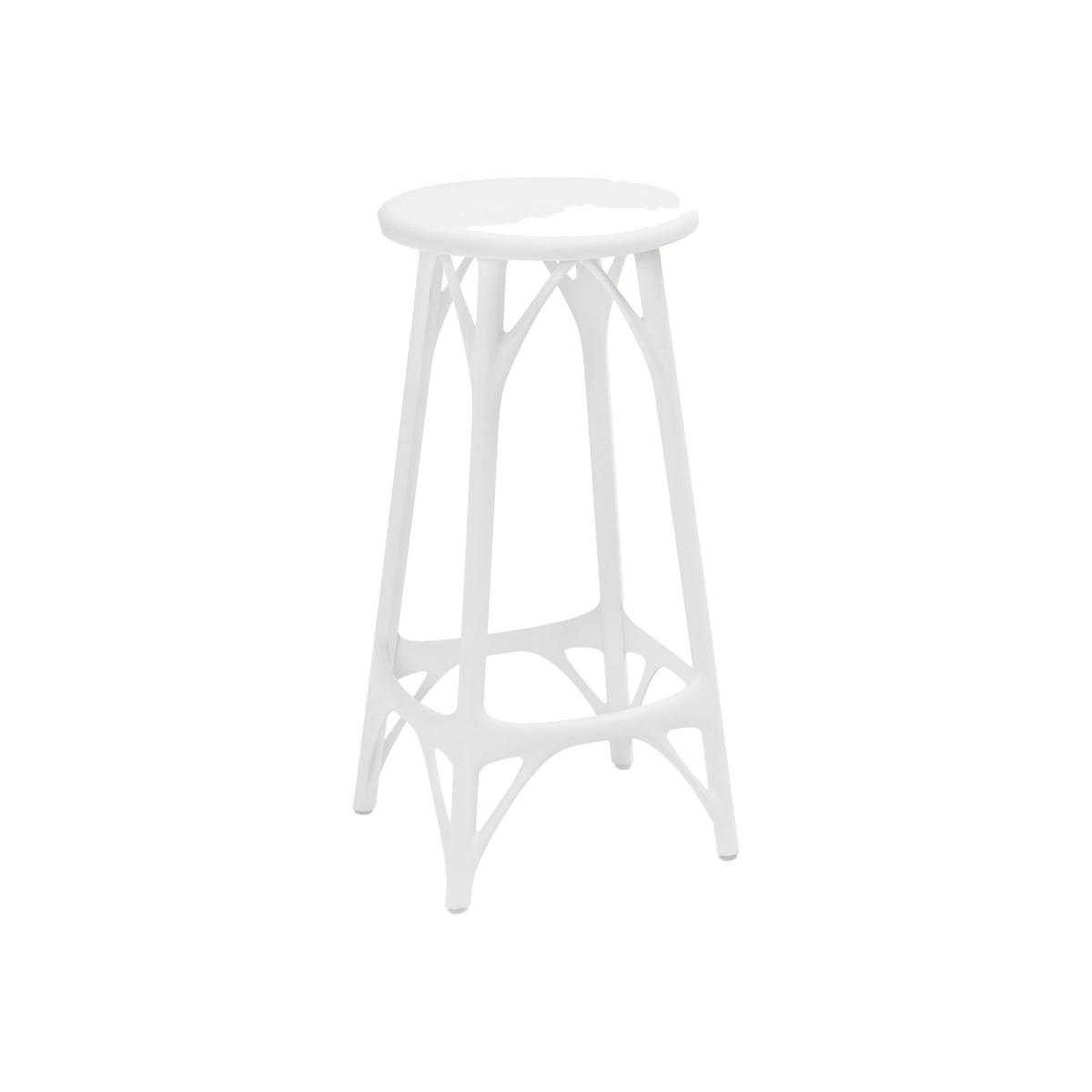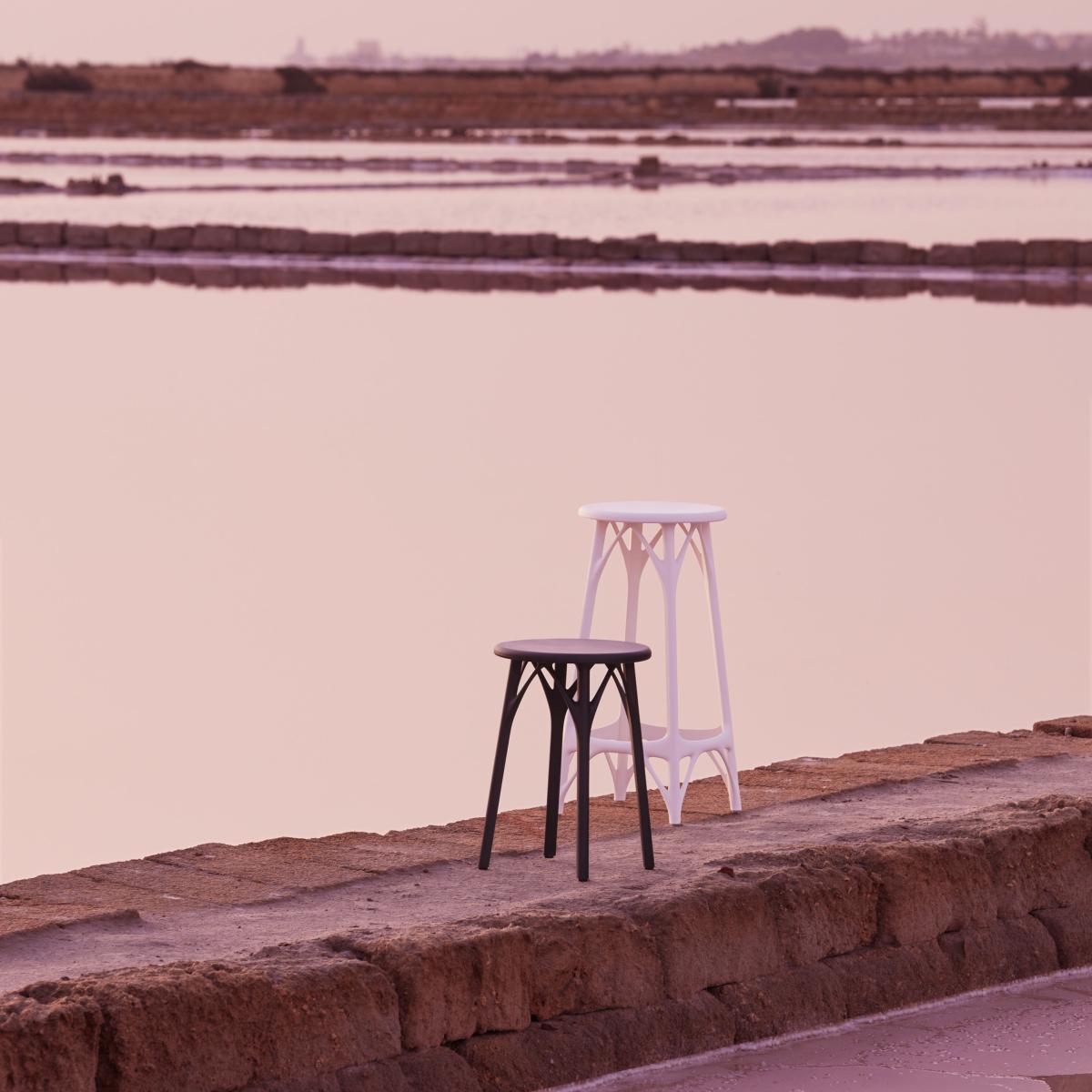 The A.I. family is growing with the arrival of the LIGHT stools: Made with recycled material, they focus on comfort thanks to the wide and welcoming seat. The future is taking shape at Kartell… A pioneer and visionary, famous designer Philippe Starck continues to innovate: he has created the first chair designed by artificial intelligence. To design it, Starck used Autodesk, an American company specialising in 3D design software. To design the A.I. (Artificial Intelligence) chair, Philippe Starck, Autodesk and Kartell asked a single yet crucial question of Dreamcatcher (the generative design software developed by Autodesk): "Would you be able to give our bodies somewhere to rest by using as little materials and energy as possible? With no culture, memories or influence, the software only responded with intelligence, its "artificial" intelligence." A.I. is the first chair designed outside of our brains, outside of our ways of thinking. Human creative thought and artificial intelligence therefore merged to design a chair made completely by an algorithm which meets the original requirements: creating a comfortable, study chair in line with the Kartell collections' aesthetics, with as little material and energy as possible. The A.I. collection is the result of joint work between artificial and human intelligence, defined by Starck himself as "Natural intelligence". Autodesk stated that the design process with the artificial intelligence software was reminiscent of "a child learning". Starck described this process as very similar to a conversation between two human beings. "Why do chairs all look like each other? How can you create a structurally different chair? At one point, I needed to open a new door…" explained Philippe Starck, on the creation of the A.I. chair project. This collaboration between human and artificial intelligence has shown that artificial intelligence can assist the work of a designer by calculating what the optimal responses are to a design idea. The A.I. collection is a symbol of the experimental approach of design and the ecological commitment of designer Philippe Starck. "Coming from elsewhere, a new world is now open to us. A world without limits…", as Starck concluded. No doubt the A.I. chair marks a turning point for the future of design.