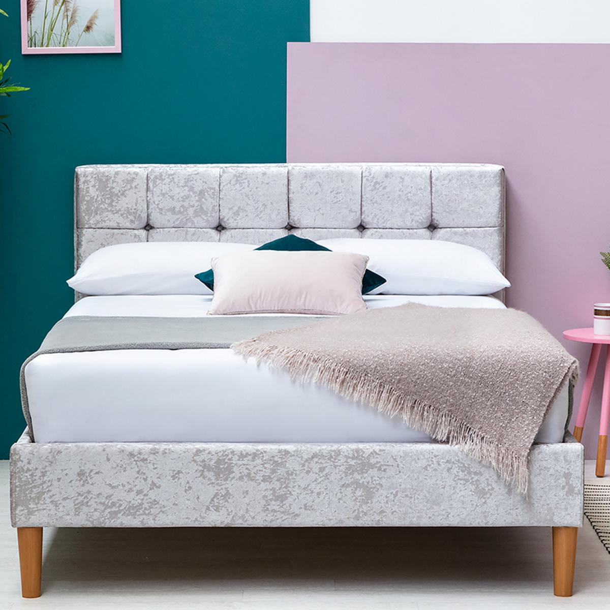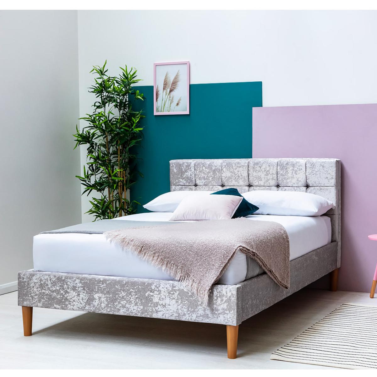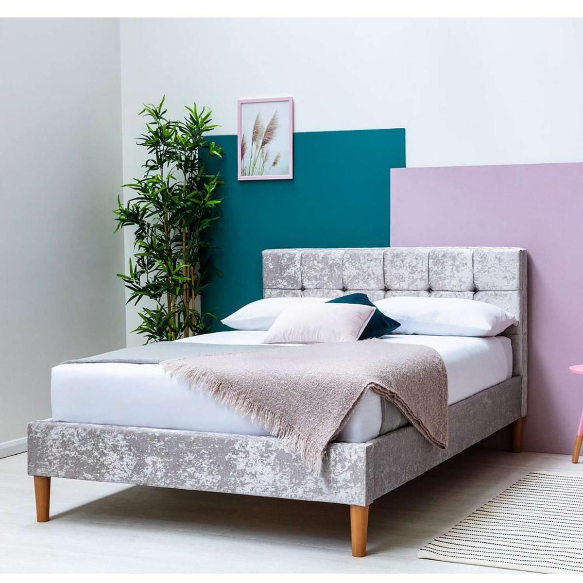 The Highclere is a beautiful yet simple bed frame upholstered in our shimmery sumptuous silver crushed velvet. The bed features a simple padded and tufted headboard design, and wood effect legs. The modern low footboard design helps make the room feel bigger and more spacious.