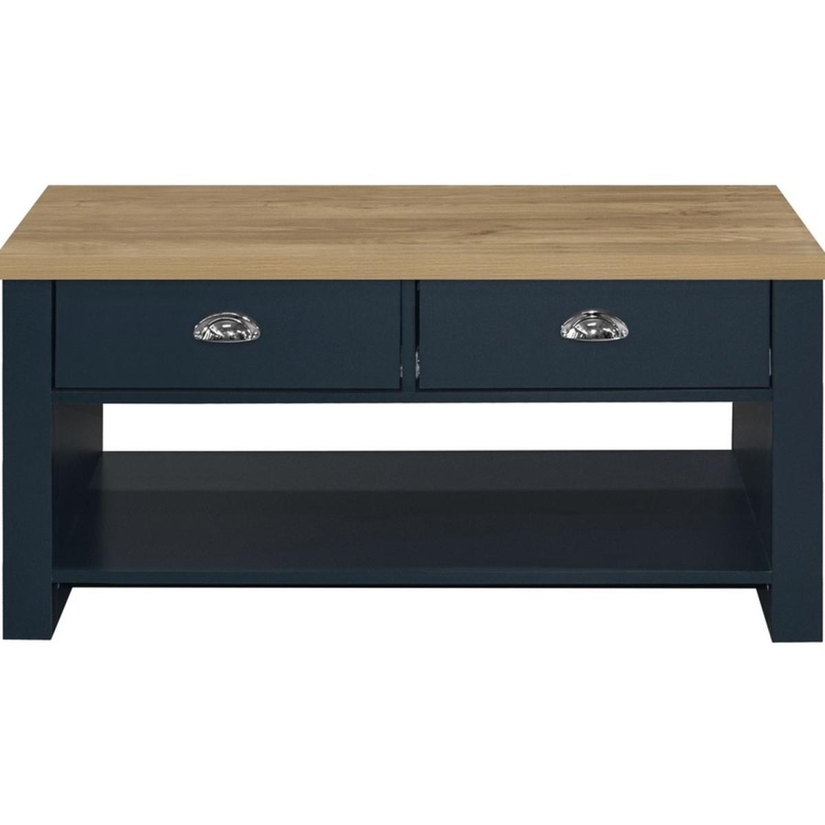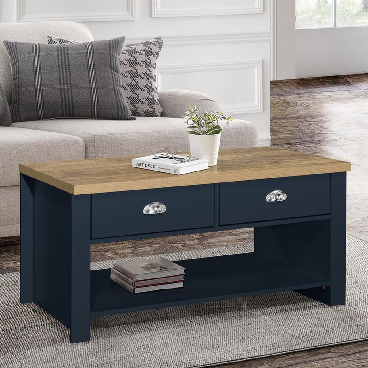 Inspired by classic farmhouse furniture the Highgate range has been designed to complement both modern and traditional homes. The Highgate range is modern, practical, affordable furniture and with stylish silver handles looks fantastic too. Available in cream oak, grey oak and navy oak this range will suite a wide array of interiors. An excellent addition to your living room, this Highgate 2 Drawer Coffee Table creates a stylish centerpiece great for relaxing with family and friends. Featuring two extremely convenient push and pull drawers with silver cup handles, this table also has a large lower shelf, great for storing books or other items. An easy way to keep your house looking neat and tidy, this table is a great addition to your home. Care instructions Wipe carefully with a soft, dry cloth.