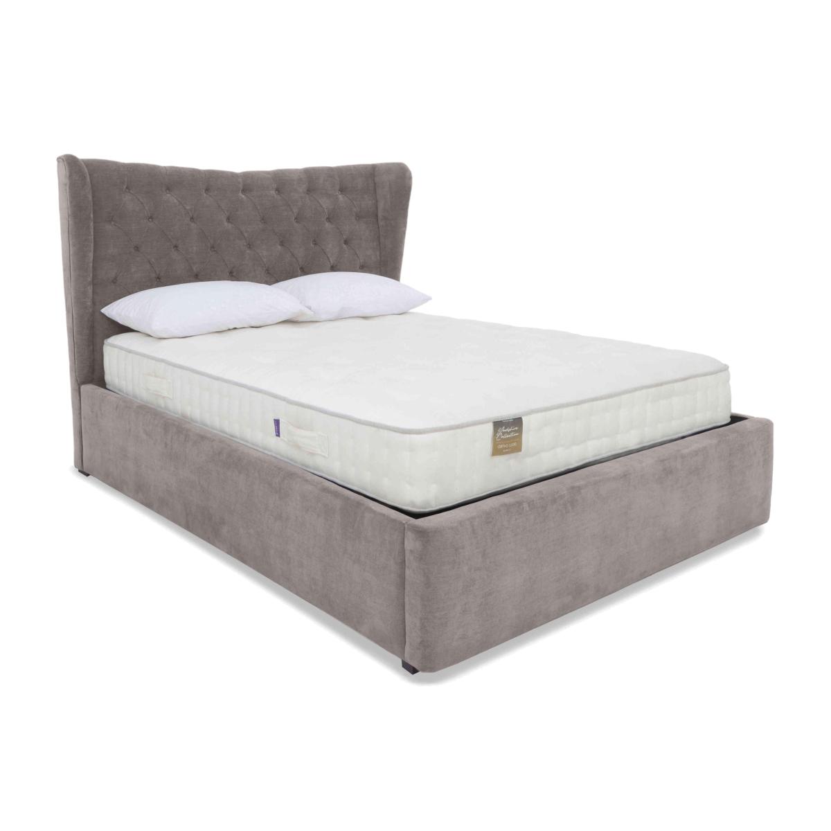 This beautiful ottoman bed frame brings together traditional elegance – in the form of that gorgeous winged headboard – and smooth electric- powered ottoman storage. Handcrafted. Why you'll love it Contemporary elegance with easy- access practical storage. The ottoman lift mechanism is electric powered. Beautiful winged headboard is sumptuously cushioned. Accentuated with lavish buttoning. Set on dark ebony wood feet. Deep base for maximum underbed storage. Breathable slatted wood base means a cooler night’s sleep. In a wide choice of upholstery fabrics. In small double, double, king and super king bed sizes. Handmade in the UK. This Highgrove electric ottoman bed frame is a Furniture Village exclusive. What you need to know Mattress sold separately. Mattress base is composed of 28 wood slats in king size. This ottoman bed frame opens at the end. Maximum mattress weight is 80 kg for all sizes. Please keep hands clear of the mechanism when opening and closing the ottoman. Do not sit on the foot end of this ottoman bed frame when opening. Clean regularly using a soft brush or vacuum with the curtain attachment. Deal with any spills promptly. Professional cleaning advised for oil- and grease- based stains. Some fabrics can show wear on areas of more use or in direct sunlight. Flattening and shading of heavy wear areas on pile fabrics like velvet is unavoidable. Be sure to brush pile fabrics only in the direction of the pile. Please read our upholstery care guide for more advice.