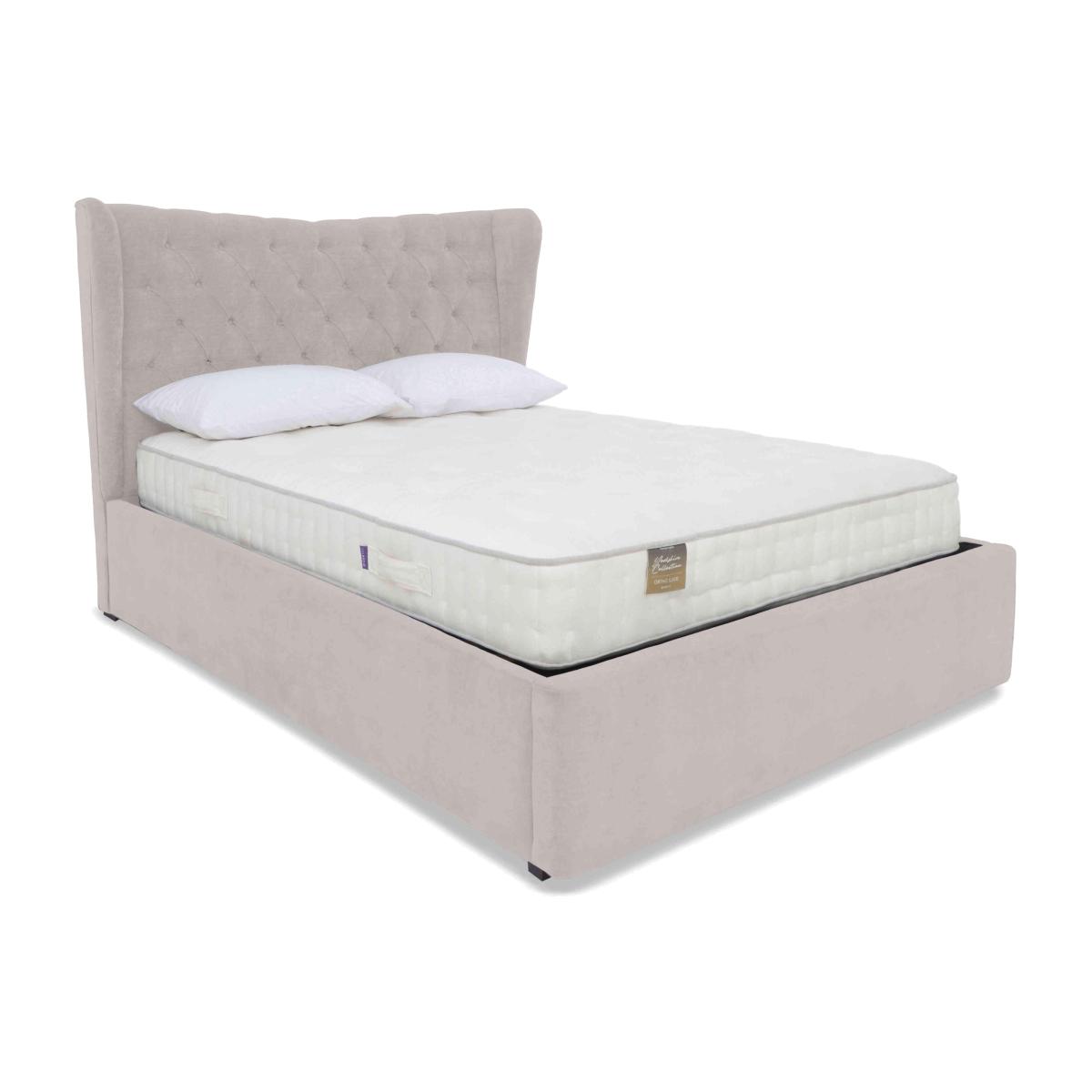 This beautiful ottoman bed frame brings together traditional elegance – in the form of that gorgeous winged headboard – and smooth electric- powered ottoman storage. Handcrafted. Why you'll love it Contemporary elegance with easy- access practical storage. The ottoman lift mechanism is electric powered. Beautiful winged headboard is sumptuously cushioned. Accentuated with lavish buttoning. Set on dark ebony wood feet. Deep base for maximum underbed storage. Breathable slatted wood base means a cooler night’s sleep. In a wide choice of upholstery fabrics. In small double, double, king and super king bed sizes. Handmade in the UK. This Highgrove electric ottoman bed frame is a Furniture Village exclusive. What you need to know Mattress sold separately. Mattress base is composed of 28 wood slats in king size. This ottoman bed frame opens at the end. Maximum mattress weight is 80 kg for all sizes. Please keep hands clear of the mechanism when opening and closing the ottoman. Do not sit on the foot end of this ottoman bed frame when opening. Clean regularly using a soft brush or vacuum with the curtain attachment. Deal with any spills promptly. Professional cleaning advised for oil- and grease- based stains. Some fabrics can show wear on areas of more use or in direct sunlight. Flattening and shading of heavy wear areas on pile fabrics like velvet is unavoidable. Be sure to brush pile fabrics only in the direction of the pile. Please read our upholstery care guide for more advice.