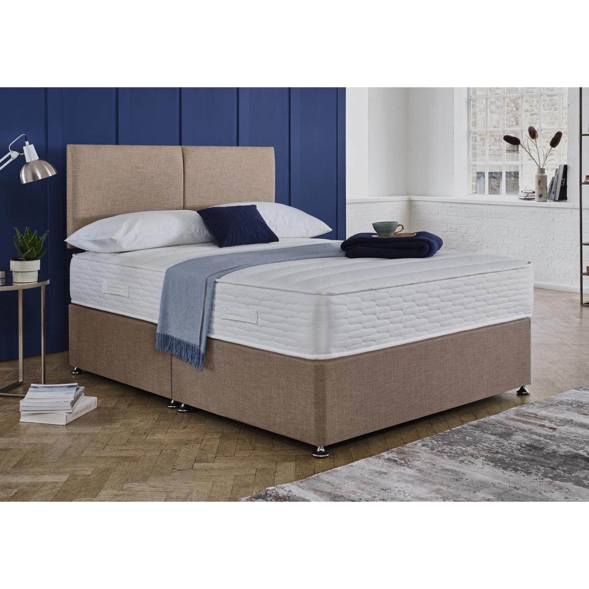 The Highgrove Essentials Dream collection makes it easy to find your dream bed, and at an amazing price. Simply choose the mattress feel you prefer – coil spring, pocket spring or memory foam – and then add a divan base with optional storage drawers and complete the look with one of three different styles of headboard. Already have a divan base and headboard? No problem. All Highgrove Essentials Dream mattresses can be purchased separately. Handcrafted in Britain, the Highgrove Essentials Dream collection has been created exclusively for Furniture Village and is only available online. A high-quality coil spring divan set at a fantastic price. Includes upholstered base with optional storage and stylish headboard. Exclusively available online at Furniture Village. The perfect divan set at a perfect price. The fantastic-value Highgrove Essentials Dream Coil divan set with Trance headboard includes everything you need for a superb night’s sleep – and a more stylish bedroom. The mattress in this set is the 24 cm deep hypoallergenic Highgrove Essentials Dream Coil mattress. It’s built for long life and features a traditional coil spring construction for extra firm support. Reinforced edges guarantee the widest possible sleeping surface. It’s finished with a cover made of Coolmax® stretch fabric, microquilted for softness, that helps regulate body temperature at night so you stay cool and comfortable as you sleep. The accompanying platform top divan base is beautifully upholstered and is offered with your choice of optional storage drawers. The strutted geometric Trance headboard with its minimal vertical stitching detail completes the look. Choose from three stylish fabrics for the divan base and headboard. Handcrafted in Britain, the Highgrove Essentials Dream Coil divan set with Trance headboard represents excellent value and a truly innovative way to bring home the perfect bed. It’s part of the Highgrove Essentials collection which is exclusively available online at Furniture Village. Product images are representative. Find out more. Please note. This mattress should be aired for four hours after delivery to freshen and remove any aroma from storage. It may take time for your mattress to attain its full size once the springs have settled to the correct position. This is due to the mattress being upright during transit. Settlement of fillings and indentations caused by body weight compressing the fillings are natural and not considered defects. This can be minimised by regular rotating. We recommend the use of a mattress protector.