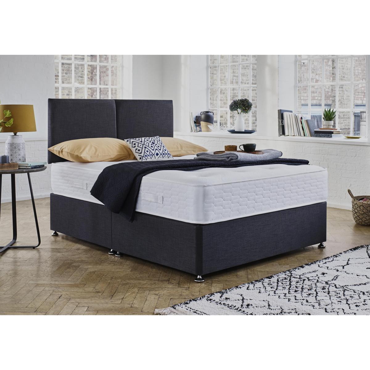 The Highgrove Essentials Dream collection makes it easy to find your dream bed, and at an amazing price. Simply choose the mattress feel you prefer – coil spring, pocket spring or memory foam – and then add a divan base with optional storage drawers and complete the look with one of three different styles of headboard. Already have a divan base and headboard? No problem. All Highgrove Essentials Dream mattresses can be purchased separately. Handcrafted in Britain, the Highgrove Essentials Dream collection has been created exclusively for Furniture Village and is only available online. A high-quality pocket spring divan set at an amazing price. Includes upholstered base with optional storage and stylish headboard. Exclusively available online at Furniture Village. Style, comfort and value – it’s all yours with the Highgrove Essentials Dream Pocket divan set with Trance headboard, curated by Highgrove exclusively for Furniture Village. This exceptional divan set with headboard comprises the 24 cm deep firm feel Highgrove Essentials Dream Pocket mattress with 1000 pocket springs in king size. Promising exceptional support and posture-correcting properties, this mattress is finished with a microquilted and breathable Coolmax® stretch fabric cover which provides a wonderfully soft sleeping surface. This cover is also designed to help regulate body temperature for cool and comfortable sleep. This two-sided turnable mattress is finished with hand tufting to secure the multiple layers of hypoallergenic fillings. It’s paired with a neatly upholstered platform top divan base and the strutted Trance headboard – minimal and geometric – available in a choice of three fabrics. You can also add optional storage drawers. Handcrafted in Britain, the Highgrove Essentials Dream Pocket divan set with Trance headboard is part of the Highgrove Essentials collection. Made by Highgrove for Furniture Village, this collection is only available online. Product images are representative. Find out more. Please note. This mattress should be aired for four hours after delivery to freshen and remove any aroma from storage. It may take time for your mattress to attain its full size once the springs have settled to the correct position. This is due to the mattress being upright during transit. Settlement of fillings and indentations caused by body weight compressing the fillings are natural and not considered defects. This can be minimised by regular rotating. We recommend the use of a mattress protector.