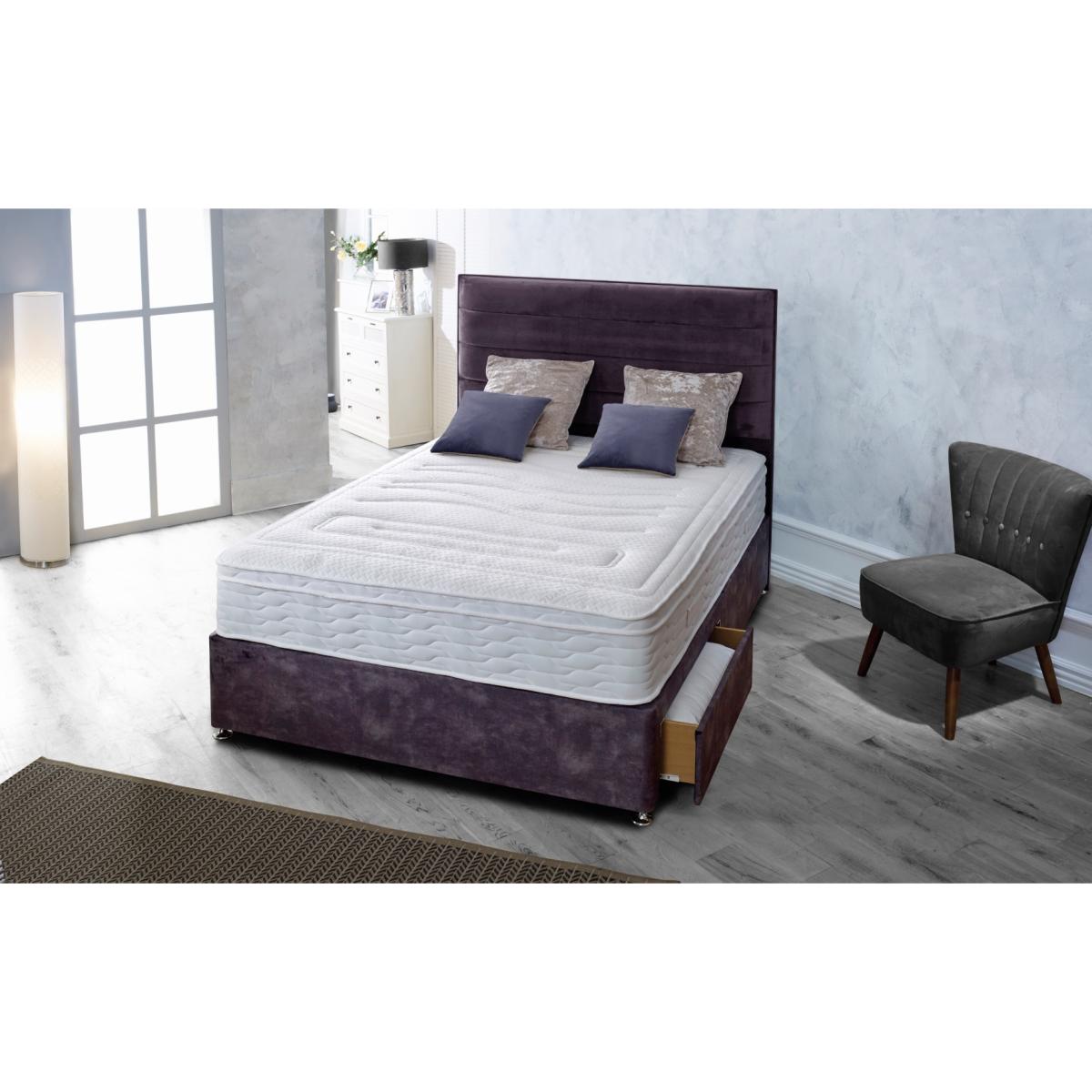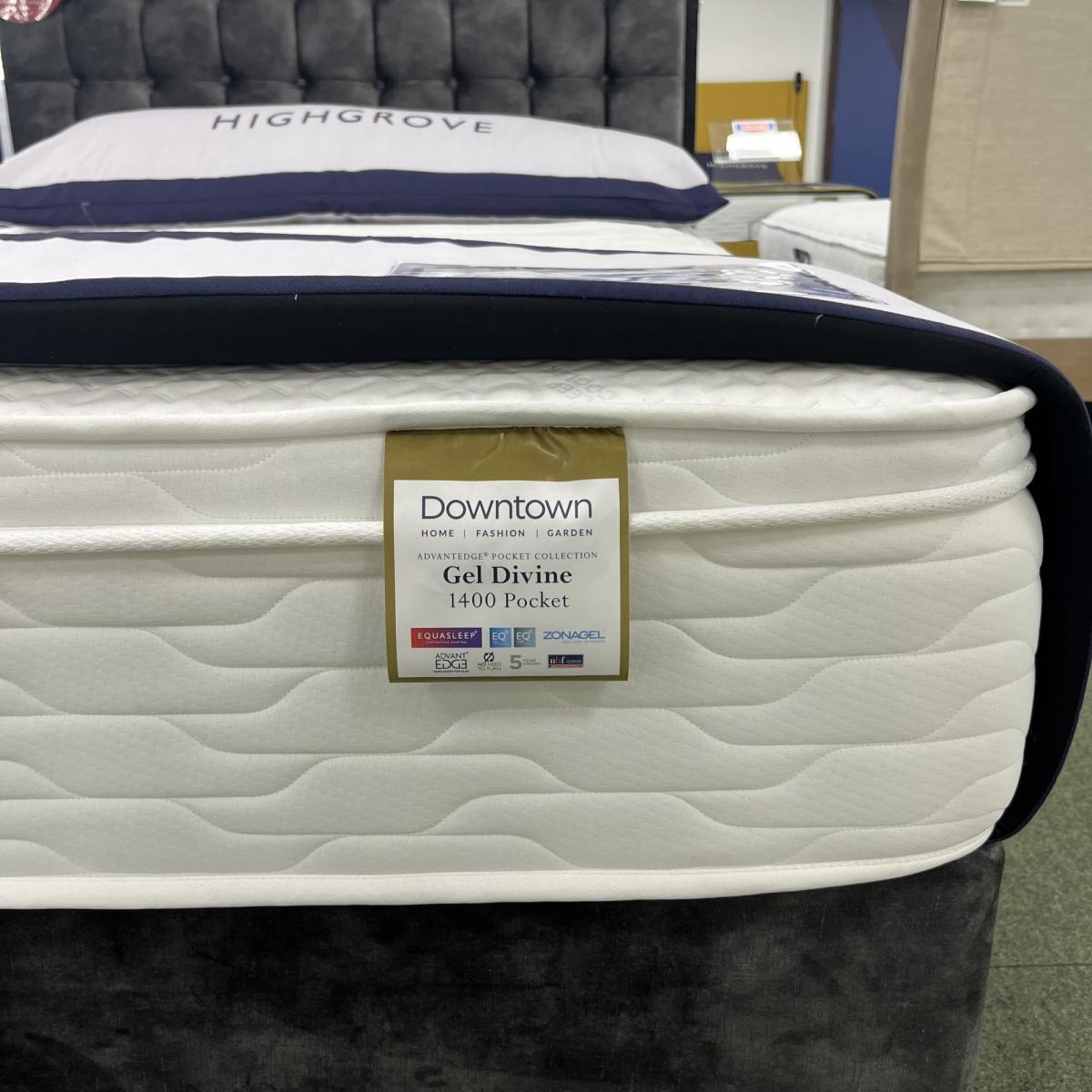 Highgrove39;s Gel Divine 1400 has an innovative gel infused system with targeted comfort zones of varied firmness, ergonomically designed to offer the right level of support for different areas of your body. Combined with 1400 pocket springs, it incorporates Highgrove39;s advanced Equasleep technology to regulate surface temperature, providing restful sleep all year round. How it Works. *Zonagel reduces body pressure points to improve blood circulation, prompting restful sleep. *Zonagel is not temperature sensitive and unlike memory foam, reacts immediately to body pressure to create a sense of weightlessness. *Zonagel is high performance and designed for long lasting comfort. *The open cell structure of Zonagel improves moisture dispersion and breath-ability. *For added convenience the deep layer of Zonagel is used effectively in single-sided mattresses so there is no need to flip, just rotate 180 degrees regularly. FEATURES:. *Divan Height - 36cm approx * Ottoman Height - 39cm approx *Mattress, Divan Base and Headboard included *Choose from a range of storage options *Upholstered in choice of stunning fabrics STORAGE OPTIONS:. *Non-storage *2 drawers at foot end *4 standard drawers *2 standard 2 continental drawers *Jumbo drawer large end drawer 135cm 150cm sizes only *Ottoman end opening side opening All screens vary in colour reproduction and whilst every effort has been made to display the colour as accurately as possible it is for guidance only..