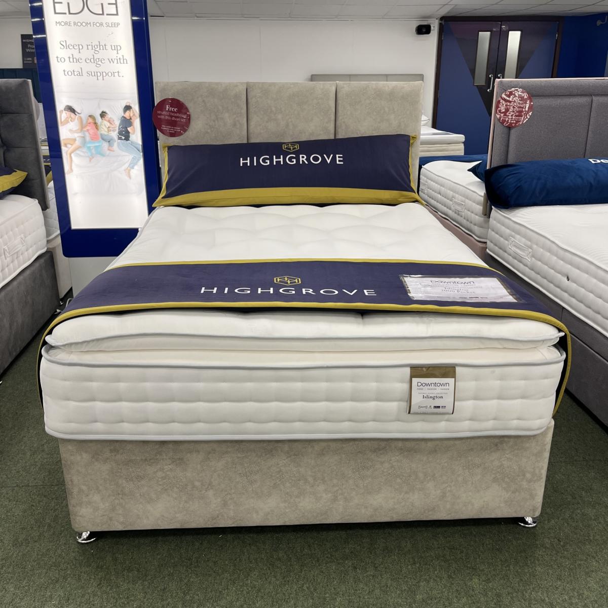 Special bundle price - mattress, divan base and headboard included. Just select your size, storage option, headboard and your fabric choice! The Highgrove Islington Mattress features a luxurious and lavish viscose damask warp and weft covered tufted mattress which allows the spine to rest in the comfort layer reducing pressure points. The mattress contains wool, cotton, cashmere and silk fillings for a natural body insulator feel providing opulent surface comfort-warm in winter, cool in summer. Incorporating 2000 advanced pocket springs and the Eco AdvantEdge spring system where the pockets on the outside edge are firmer than the inner core to prevent 'roll-off' or 'roll-together' giving total mattress support right to the very edge ensuring correct spinal alignment to enhance sleep quality. This is a Non turn mattress and only requires rotating. Features: Firm - Good for people who change sleeping position. Approved by the National Bed Federation (NBF) ensuring it has been manufactured to the highest UK standards A luxurious Pillow- Top Surface with a viscose damask cover for sumptuous natural deep comfort. Eco AdvantEdge Pocket Sprung System, Fully Encased springs to provide a wider sleep surface Individually encased pocket springs ensures support and prvrnts 'Roll Together' Designed as a no turn mattress- regulary rotate 180° To extend mattress life. Free 5 year Warranty for total peace of mind Choice of storage options Choice of base fabrics Dimensions: Mattress depth - 28cm Single - 90cm (w) x 190cm (l) Double - 135cm (w) x 190cm (l) King - 150cm (w) x 200cm (l) Superking - 180cm (w) x 200cm (l) All screens vary in colour reproduction and whilst every effort has been made to display the colour as accurately as possible it is for guidance only.