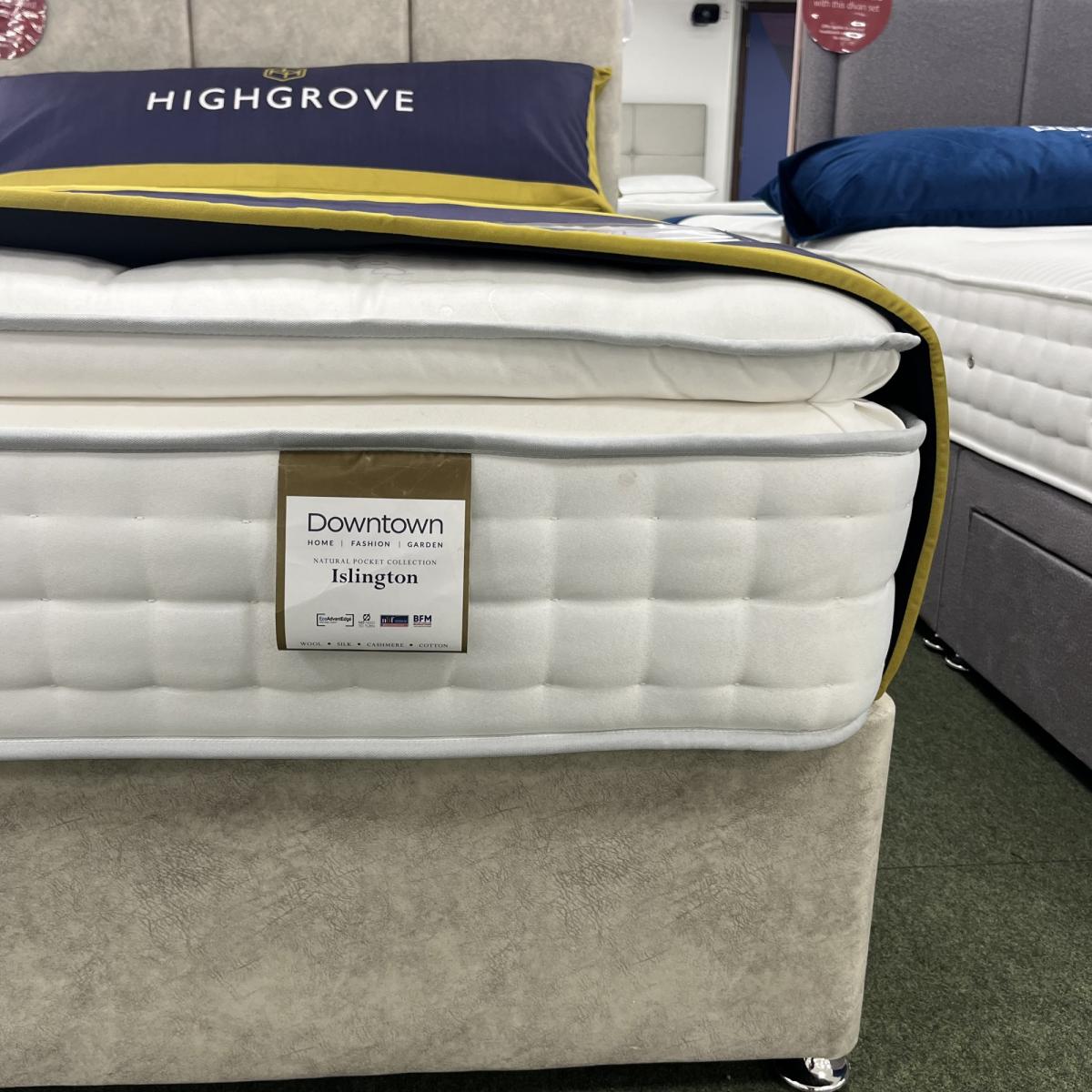 Special bundle price - mattress, divan base and headboard included. Just select your size, storage option, headboard and your fabric choice! The Highgrove Islington Mattress features a luxurious and lavish viscose damask warp and weft covered tufted mattress which allows the spine to rest in the comfort layer reducing pressure points. The mattress contains wool, cotton, cashmere and silk fillings for a natural body insulator feel providing opulent surface comfort-warm in winter, cool in summer. Incorporating 2000 advanced pocket springs and the Eco AdvantEdge spring system where the pockets on the outside edge are firmer than the inner core to prevent 'roll-off' or 'roll-together' giving total mattress support right to the very edge ensuring correct spinal alignment to enhance sleep quality. This is a Non turn mattress and only requires rotating. Features: Firm - Good for people who change sleeping position. Approved by the National Bed Federation (NBF) ensuring it has been manufactured to the highest UK standards A luxurious Pillow- Top Surface with a viscose damask cover for sumptuous natural deep comfort. Eco AdvantEdge Pocket Sprung System, Fully Encased springs to provide a wider sleep surface Individually encased pocket springs ensures support and prvrnts 'Roll Together' Designed as a no turn mattress- regulary rotate 180° To extend mattress life. Free 5 year Warranty for total peace of mind Choice of storage options Choice of base fabrics Dimensions: Mattress depth - 28cm Single - 90cm (w) x 190cm (l) Double - 135cm (w) x 190cm (l) King - 150cm (w) x 200cm (l) Superking - 180cm (w) x 200cm (l) All screens vary in colour reproduction and whilst every effort has been made to display the colour as accurately as possible it is for guidance only.