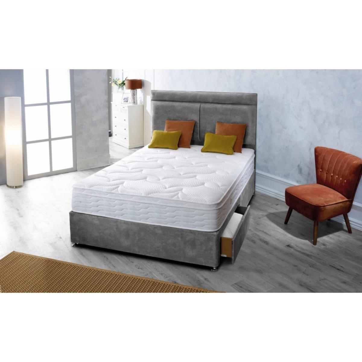 Please note, the headboard pictured is not included but is available to purchase separately. The Highgrove Memory Divine 1400 mattress makes use of Highgrove's advanced Equasleep technology. Combining Memory technology with unique fabric fibres to regulate surface temperature and promote a healthier night's sleep Highgrove's Advanced Pocket Spring System with individually encased pocket springs provides proper underlying support with this mattress. Fully encapsulated with Highgrove AdvantEdge to provide a wider sleep surface with total comfort and support. Designed as a no-turn mattress - please regularly rotate 180° to extend mattress life and performance. FEATURES: Mattress firmness rating - Medium/Firm 1400 pocket springs (150cm size) individually adjust and support you as you sleep. Memory foam layer Luxurious stretch fabric cover Fully encapsulated to provide a wider sleep surface with total comfort and support No turn mattress 5 Year Warranty Choose from a selection of fabrics and colours Choose from a range storage and non-storage divan options SIZES: Mattress depth - 26cm Small Single - W 75cm x L 190cm Single - W 90cm x L 190cm Small Double - W 120cm x L 190cm Double - W 135cm x L 190cm King - W 150cm x L 200cm Super King - W 180cm x L 200cm All screens vary in colour reproduction and whilst every effort has been made to display the colour as accurately as possible it is for guidance only.