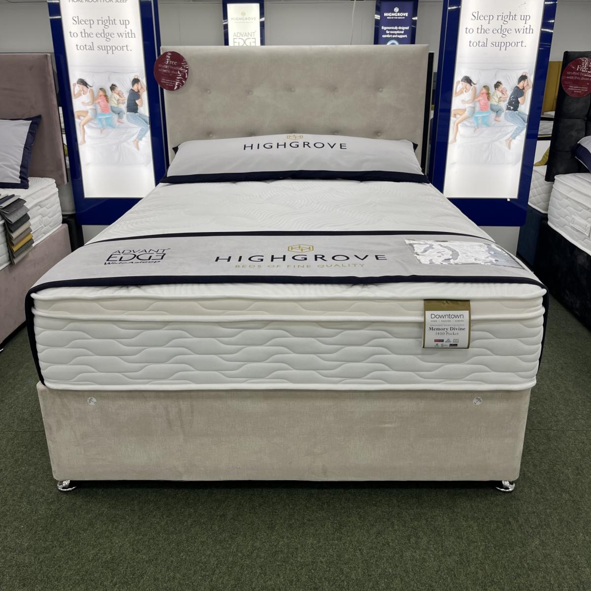 Special bundle price - mattress, divan base and headboard included. Just select your size, storage option, headboard and your fabric choice. The Highgrove Memory Divine 1400 mattress makes use of Highgrove39;s advanced Equasleep technology. Combining Memory technology with unique fabric fibres to regulate surface temperature and promote a healthier night39;s sleep. Highgrove39;s Advanced Pocket Spring System with individually encased pocket springs provides proper underlying support with this mattress. Fully encapsulated with Highgrove AdvantEdge to provide a wider sleep surface with total comfort and support. Designed as a no-turn mattress - please regularly rotate 180 to extend mattress life and performance. FEATURES:. *Mattress firmness rating - Medium/Firm *1400 pocket springs 150cm size individually adjust and support you as you sleep. *Memory foam layer *Luxurious stretch fabric cover *Fully encapsulated to provide a wider sleep surface with total comfort and support * No turn mattress *5 Year Warranty * Choose from a selection of fabrics and colours *Choose from a range storage and non-storage divan options *Choose from a large selection of floor-standing and strutted headboards SIZES:. *Mattress depth - 26cm *Small Single - W 75cm x L 190cm *Single - W 90cm x L 190cm *Small Double - W 120cm x L 190cm *Double - W 135cm x L 190cm *King - W 150cm x L 200cm *Super King - W 180cm x L 200cm All screens vary in colour reproduction and whilst every effort has been made to display the colour as accurately as possible it is for guidance only..