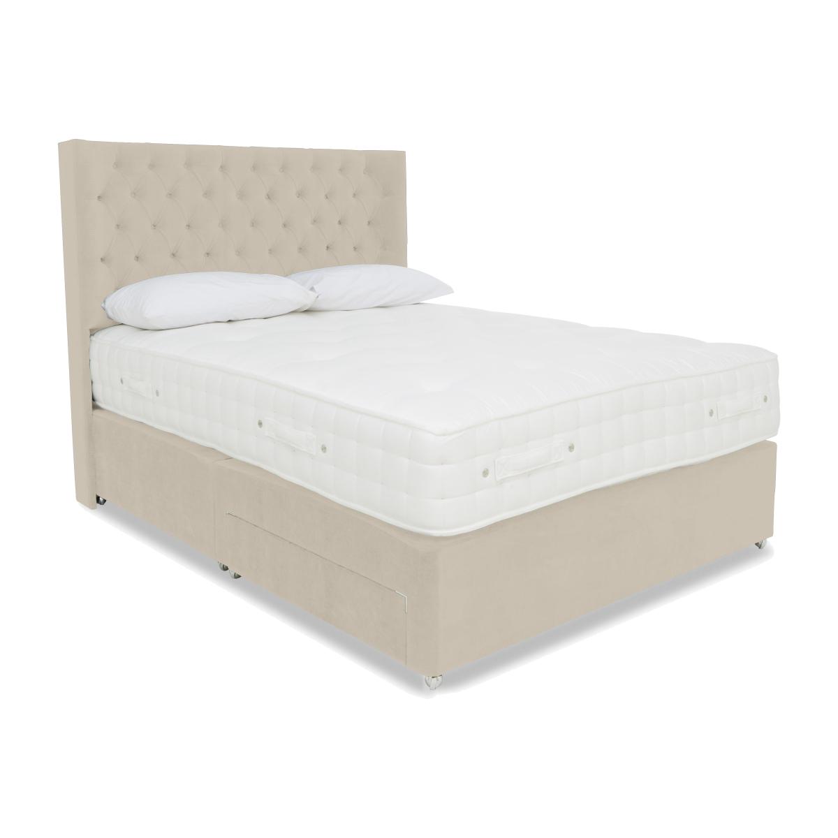 The Sanctum Nature 2000 collection range epitomises luxury, from top to bottom and side to side. Pocket sprung mattresses with optional pillow tops feature all-natural fillings that include cooling British wool, cotton, silk and cashmere, and have sturdy side-stitched and ventilated borders. Upholstered divan bases have sprung edges for enhanced mattress support, and a choice of storage drawers. The collection also includes ready-made divan sets that include a mattress, storage base and stylish floor standing headboard. They're the easiest way to transform both the quality of your sleep and the look of your bedroom. The Sanctum Nature 2000 range is handcrafted by Highgrove. This two-drawer divan set is the complete package – luxurious sprung mattress with natural fillings, sprung edge divan base with storage drawers, and fabulous buttoned headboard with winged sides. Why you'll love it This beautiful 2-drawer divan set includes a mattress, divan base and statement headboard. Exceptionally luxurious, exceptionally comfortable. Mattress has layers of all-natural fillings include cotton, cashmere, silk and British wool. Wool helps keep you cool in summer and warm in winter. 2000 pocket springs in king size for wonderful support. Border has 2 rows of side-stitching for edge support, and vents for cooling airflow. Superior sprung-edge divan base provides full-width mattress support. Enjoy extra bedroom storage with 2 roomy and versatile built-in drawers. This divan set includes an elegant floor standing headboard. Sumptuously cushioned headboard has winged sides with traditional buttoning. Choose from a wide range of on-trend upholstery fabrics and colours. Handmade in the UK by Highgrove. This 2-drawer divan set with mattress and headboard is part of the Sanctum Nature 2000 range. What you need to know Mattress type: Hybrid. Depth: 28 cm. Firmness: Medium. Springs: 2000 pocket springs in king size. Pillow top: No. Fillings: British wool, poly cotton, cashmere, silk. Cover: 100% polyester. Requires turning: Yes. Base type: Sprung edge with optional storage drawers. Sizes: Small double, double, king and super king. Mattress care:Air for 4 hours before using to remove any odour. Indentations caused by settlement of fillings or body weight are normal and are not considered defects. If used on a slatted bed frame, the space between slats must be no wider than 7.5 cm. Spaces wider than this may cause excess dipping of the mattress and invalidate the guarantee. Always use a mattress protector. Turn and rotate regularly. Headboard and divan base care: Clean upholstery weekly using a soft brush or vacuum with the curtain attachment. Professional cleaning advised for oil- and grease-based stains. Divan bases are supplied in two halves for easier access.