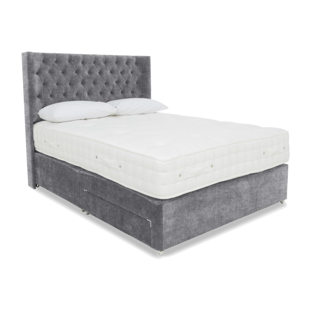 The Sanctum Nature 2000 collection range epitomises luxury, from top to bottom and side to side. Pocket sprung mattresses with optional pillow tops feature all-natural fillings that include cooling British wool, cotton, silk and cashmere, and have sturdy side-stitched and ventilated borders. Upholstered divan bases have sprung edges for enhanced mattress support, and a choice of storage drawers. The collection also includes ready-made divan sets that include a mattress, storage base and stylish floor standing headboard. They're the easiest way to transform both the quality of your sleep and the look of your bedroom. The Sanctum Nature 2000 range is handcrafted by Highgrove. This luxury divan set comprises a wonderful pocket sprung mattress with natural fillings and a superb sprung-edge divan base with optional storage drawers. Handcrafted. Why you'll love it This storage divan set has a pocket sprung mattress with natural fillings. Exceptionally luxurious, exceptionally comfortable. Mattress has layers of all-natural fillings including cotton, cashmere, silk and British wool. Wool helps keep you cool in summer and warm in winter. 2000 pocket springs in king size for wonderful support. Border has 2 rows of side-stitching for edge support, and vents for cooling airflow. Superior sprung-edge divan base provides full-width mattress support. With optional built-in storage drawers in a choice of configurations. Upholstered in a wide range of on-trend fabric colours. Available in all bed sizes from small double to super king. Handmade in the UK by Highgrove. This divan set is part of the Sanctum Nature 2000 range. What you need to know Headboard is an optional extra. Mattress type: Hybrid. Depth: 28 cm. Firmness: Medium. Springs: 2000 pocket springs in king size. Pillow top: No. Fillings: British wool, poly cotton, cashmere, silk. Cover: 100% polyester. Requires turning: Yes. Base type: Sprung edge with optional storage drawers. Sizes: Small double, double, king and super king. Mattress care:Air for 4 hours before using to remove any odour. Indentations caused by settlement of fillings or body weight are normal and are not considered defects. If used on a slatted bed frame, the space between slats must be no wider than 7.5 cm. Spaces wider than this may cause excess dipping of the mattress and invalidate the guarantee. Always use a mattress protector. Turn and rotate regularly. Divan base care: Clean upholstery weekly using a soft brush or vacuum with the curtain attachment. Professional cleaning advised for oil- and grease-based stains. Divan bases are supplied in two halves for easier access.