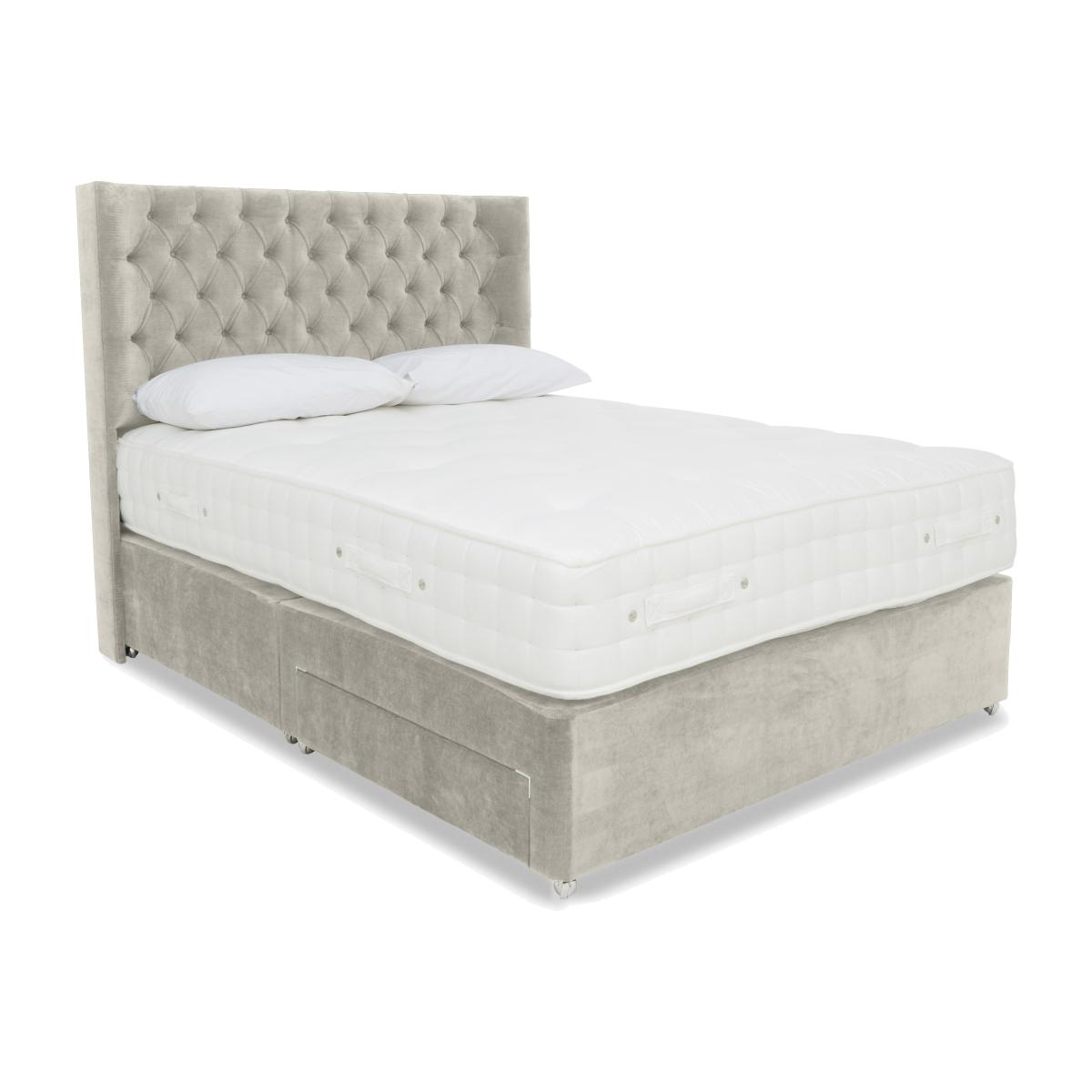 The Sanctum Nature 2000 collection range epitomises luxury, from top to bottom and side to side. Pocket sprung mattresses with optional pillow tops feature all-natural fillings that include cooling British wool, cotton, silk and cashmere, and have sturdy side-stitched and ventilated borders. Upholstered divan bases have sprung edges for enhanced mattress support, and a choice of storage drawers. The collection also includes ready-made divan sets that include a mattress, storage base and stylish floor standing headboard. They're the easiest way to transform both the quality of your sleep and the look of your bedroom. The Sanctum Nature 2000 range is handcrafted by Highgrove. This luxury divan set comprises a wonderful pocket sprung mattress with natural fillings and a superb sprung-edge divan base with optional storage drawers. Handcrafted. Why you'll love it This storage divan set has a pocket sprung mattress with natural fillings. Exceptionally luxurious, exceptionally comfortable. Mattress has layers of all-natural fillings including cotton, cashmere, silk and British wool. Wool helps keep you cool in summer and warm in winter. 2000 pocket springs in king size for wonderful support. Border has 2 rows of side-stitching for edge support, and vents for cooling airflow. Superior sprung-edge divan base provides full-width mattress support. With optional built-in storage drawers in a choice of configurations. Upholstered in a wide range of on-trend fabric colours. Available in all bed sizes from small double to super king. Handmade in the UK by Highgrove. This divan set is part of the Sanctum Nature 2000 range. What you need to know Headboard is an optional extra. Mattress type: Hybrid. Depth: 28 cm. Firmness: Medium. Springs: 2000 pocket springs in king size. Pillow top: No. Fillings: British wool, poly cotton, cashmere, silk. Cover: 100% polyester. Requires turning: Yes. Base type: Sprung edge with optional storage drawers. Sizes: Small double, double, king and super king. Mattress care:Air for 4 hours before using to remove any odour. Indentations caused by settlement of fillings or body weight are normal and are not considered defects. If used on a slatted bed frame, the space between slats must be no wider than 7.5 cm. Spaces wider than this may cause excess dipping of the mattress and invalidate the guarantee. Always use a mattress protector. Turn and rotate regularly. Divan base care: Clean upholstery weekly using a soft brush or vacuum with the curtain attachment. Professional cleaning advised for oil- and grease-based stains. Divan bases are supplied in two halves for easier access.