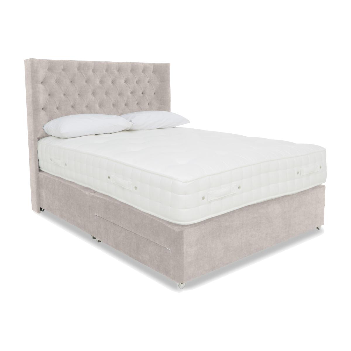 The Sanctum Nature 2000 collection range epitomises luxury, from top to bottom and side to side. Pocket sprung mattresses with optional pillow tops feature all-natural fillings that include cooling British wool, cotton, silk and cashmere, and have sturdy side-stitched and ventilated borders. Upholstered divan bases have sprung edges for enhanced mattress support, and a choice of storage drawers. The collection also includes ready-made divan sets that include a mattress, storage base and stylish floor standing headboard. They're the easiest way to transform both the quality of your sleep and the look of your bedroom. The Sanctum Nature 2000 range is handcrafted by Highgrove. This luxury divan set comprises a wonderful pocket sprung mattress with natural fillings and a superb sprung-edge divan base with optional storage drawers. Handcrafted. Why you'll love it This storage divan set has a pocket sprung mattress with natural fillings. Exceptionally luxurious, exceptionally comfortable. Mattress has layers of all-natural fillings including cotton, cashmere, silk and British wool. Wool helps keep you cool in summer and warm in winter. 2000 pocket springs in king size for wonderful support. Border has 2 rows of side-stitching for edge support, and vents for cooling airflow. Superior sprung-edge divan base provides full-width mattress support. With optional built-in storage drawers in a choice of configurations. Upholstered in a wide range of on-trend fabric colours. Available in all bed sizes from small double to super king. Handmade in the UK by Highgrove. This divan set is part of the Sanctum Nature 2000 range. What you need to know Headboard is an optional extra. Mattress type: Hybrid. Depth: 28 cm. Firmness: Medium. Springs: 2000 pocket springs in king size. Pillow top: No. Fillings: British wool, poly cotton, cashmere, silk. Cover: 100% polyester. Requires turning: Yes. Base type: Sprung edge with optional storage drawers. Sizes: Small double, double, king and super king. Mattress care:Air for 4 hours before using to remove any odour. Indentations caused by settlement of fillings or body weight are normal and are not considered defects. If used on a slatted bed frame, the space between slats must be no wider than 7.5 cm. Spaces wider than this may cause excess dipping of the mattress and invalidate the guarantee. Always use a mattress protector. Turn and rotate regularly. Divan base care: Clean upholstery weekly using a soft brush or vacuum with the curtain attachment. Professional cleaning advised for oil- and grease-based stains. Divan bases are supplied in two halves for easier access.