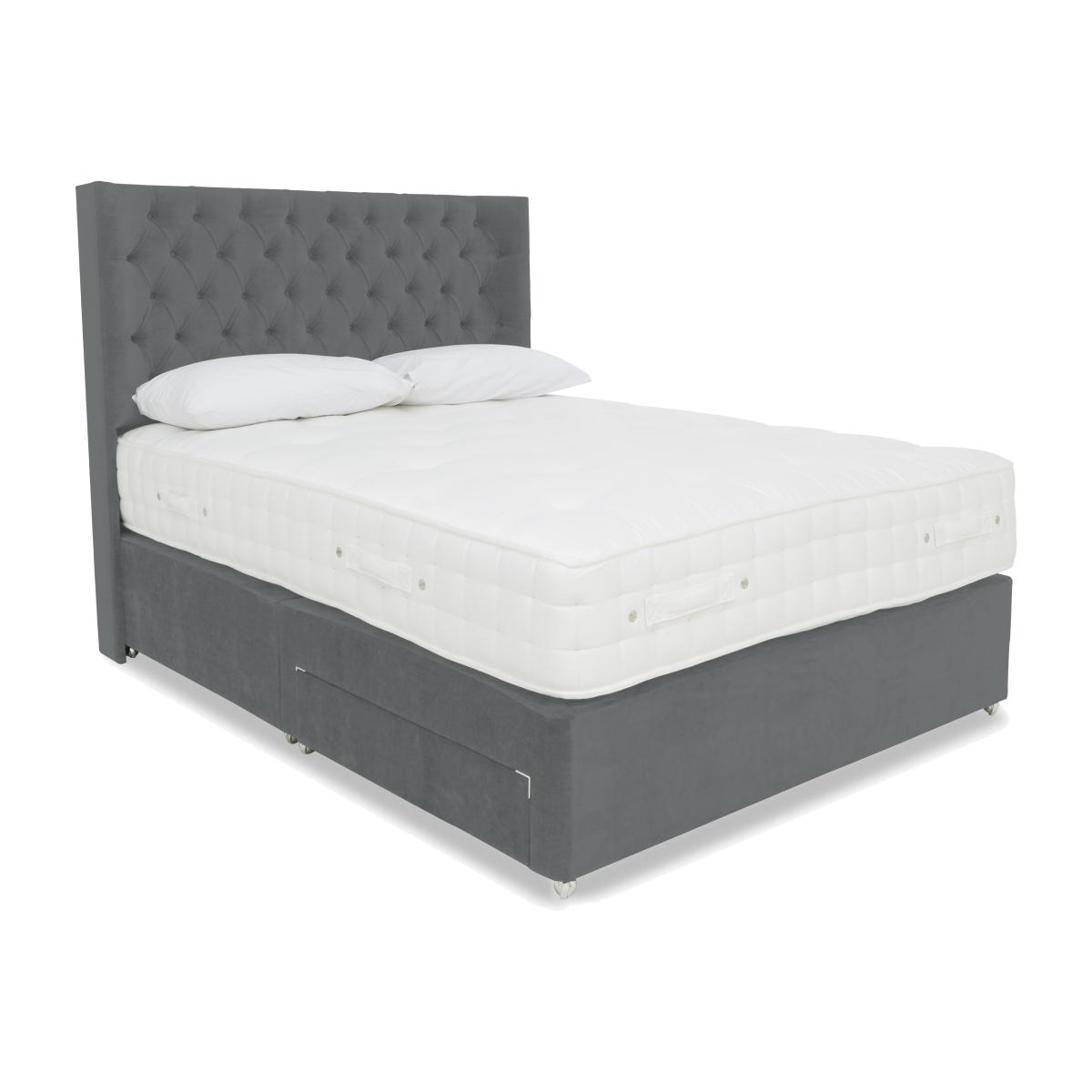 The Sanctum Nature 2000 collection range epitomises luxury, from top to bottom and side to side. Pocket sprung mattresses with optional pillow tops feature all-natural fillings that include cooling British wool, cotton, silk and cashmere, and have sturdy side-stitched and ventilated borders. Upholstered divan bases have sprung edges for enhanced mattress support, and a choice of storage drawers. The collection also includes ready-made divan sets that include a mattress, storage base and stylish floor standing headboard. They're the easiest way to transform both the quality of your sleep and the look of your bedroom. The Sanctum Nature 2000 range is handcrafted by Highgrove. This luxury divan set comprises a wonderful pocket sprung mattress with natural fillings and a superb sprung-edge divan base with optional storage drawers. Handcrafted. Why you'll love it This storage divan set has a pocket sprung mattress with natural fillings. Exceptionally luxurious, exceptionally comfortable. Mattress has layers of all-natural fillings including cotton, cashmere, silk and British wool. Wool helps keep you cool in summer and warm in winter. 2000 pocket springs in king size for wonderful support. Border has 2 rows of side-stitching for edge support, and vents for cooling airflow. Superior sprung-edge divan base provides full-width mattress support. With optional built-in storage drawers in a choice of configurations. Upholstered in a wide range of on-trend fabric colours. Available in all bed sizes from small double to super king. Handmade in the UK by Highgrove. This divan set is part of the Sanctum Nature 2000 range. What you need to know Headboard is an optional extra. Mattress type: Hybrid. Depth: 28 cm. Firmness: Medium. Springs: 2000 pocket springs in king size. Pillow top: No. Fillings: British wool, poly cotton, cashmere, silk. Cover: 100% polyester. Requires turning: Yes. Base type: Sprung edge with optional storage drawers. Sizes: Small double, double, king and super king. Mattress care:Air for 4 hours before using to remove any odour. Indentations caused by settlement of fillings or body weight are normal and are not considered defects. If used on a slatted bed frame, the space between slats must be no wider than 7.5 cm. Spaces wider than this may cause excess dipping of the mattress and invalidate the guarantee. Always use a mattress protector. Turn and rotate regularly. Divan base care: Clean upholstery weekly using a soft brush or vacuum with the curtain attachment. Professional cleaning advised for oil- and grease-based stains. Divan bases are supplied in two halves for easier access.