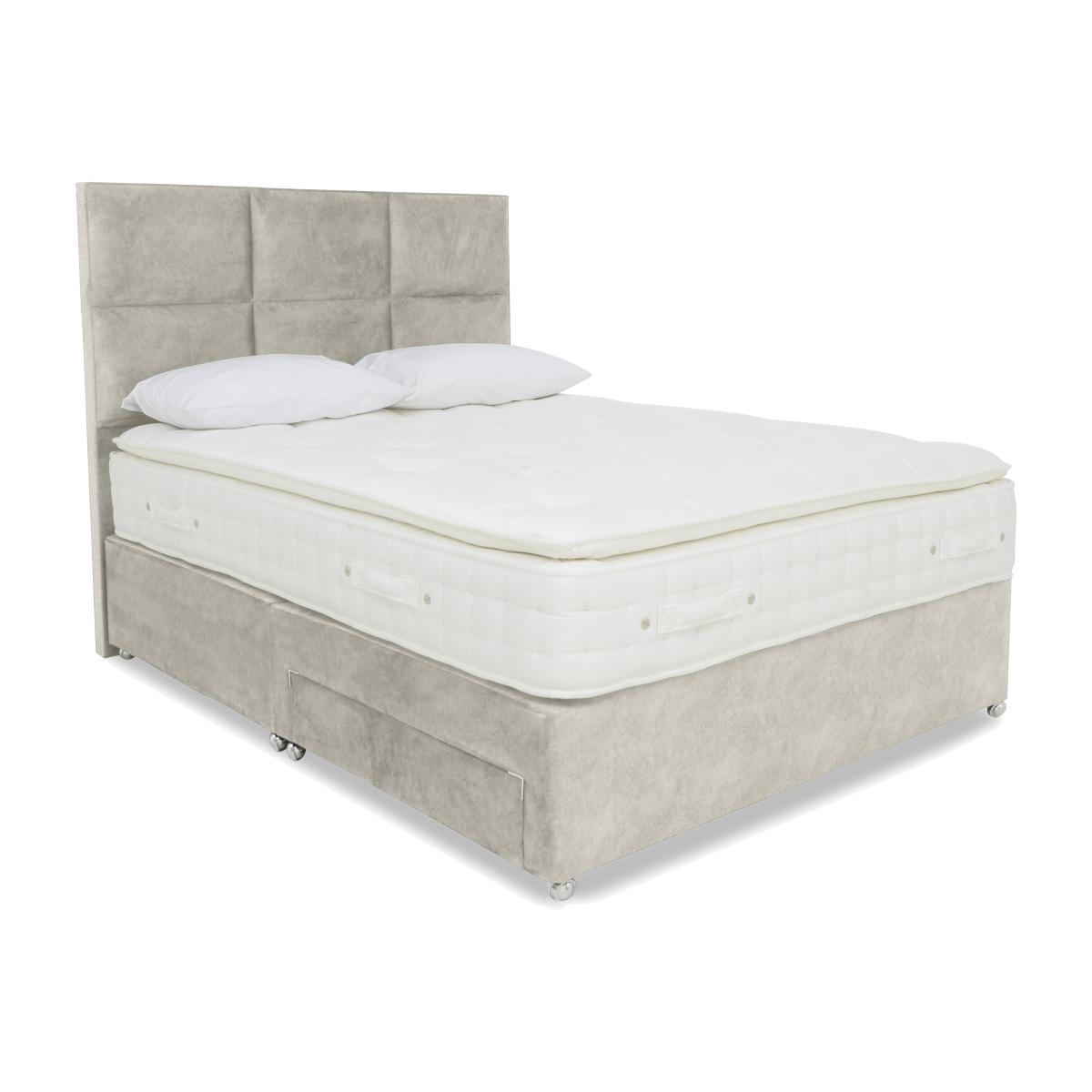The Sanctum Nature 2000 collection range epitomises luxury, from top to bottom and side to side. Pocket sprung mattresses with optional pillow tops feature all-natural fillings that include cooling British wool, cotton, silk and cashmere, and have sturdy side-stitched and ventilated borders. Upholstered divan bases have sprung edges for enhanced mattress support, and a choice of storage drawers. The collection also includes ready-made divan sets that include a mattress, storage base and stylish floor standing headboard. They're the easiest way to transform both the quality of your sleep and the look of your bedroom. The Sanctum Nature 2000 range is handcrafted by Highgrove. Bring chic contemporary style to your bedroom with this divan set. It includes a floor standing headboard, divan base with two drawers and a luxurious pillowtop mattress with natural fillings. Why you'll love it On-trend divan set with storage base, pillowtop mattress and chic headboard. Sleep in sumptuous luxury. Mattress has layers of all-natural fillings including cotton, cashmere, silk and British wool. Wool helps keep you cool in summer and warm in winter. 2000 pocket springs in king size for wonderful support. Integrated pillowtop provides an extra layer of cushioning comfort. Border has 2 rows of side-stitching for edge support, and vents for cooling airflow. Superior sprung-edge divan base provides full-width mattress support. Enjoy extra bedroom storage with 2 roomy and versatile built-in drawers. This divan set includes a contemporary floor standing headboard. Well-cushioned modern design with understated geometric stitching. Choose from a wide range of on-trend upholstery fabrics and colours. Handmade in the UK by Highgrove. This 2-drawer divan set with mattress and headboard is part of the Sanctum Nature 2000 Pillowtop range. What you need to know Mattress type: Hybrid. Depth: 35 cm. Firmness: Medium. Springs: 2000 pocket springs in king size. Pillow top:Yes. Fillings: British wool, poly cotton, cashmere, silk. Cover: 100% polyester. Requires turning: No. Base type: Sprung edge with optional storage drawers. Sizes: Small double, double, king and super king. Mattress care:Air for 4 hours before using to remove any odour. Indentations caused by settlement of fillings or body weight are normal and are not considered defects. If used on a slatted bed frame, the space between slats must be no wider than 7.5 cm. Spaces wider than this may cause excess dipping of the mattress and invalidate the guarantee. Always use a mattress protector. Rotate regularly. Headboard and divan base care: Clean upholstery weekly using a soft brush or vacuum with the curtain attachment. Professional cleaning advised for oil- and grease-based stains. Divan bases are supplied in two halves for easier access.