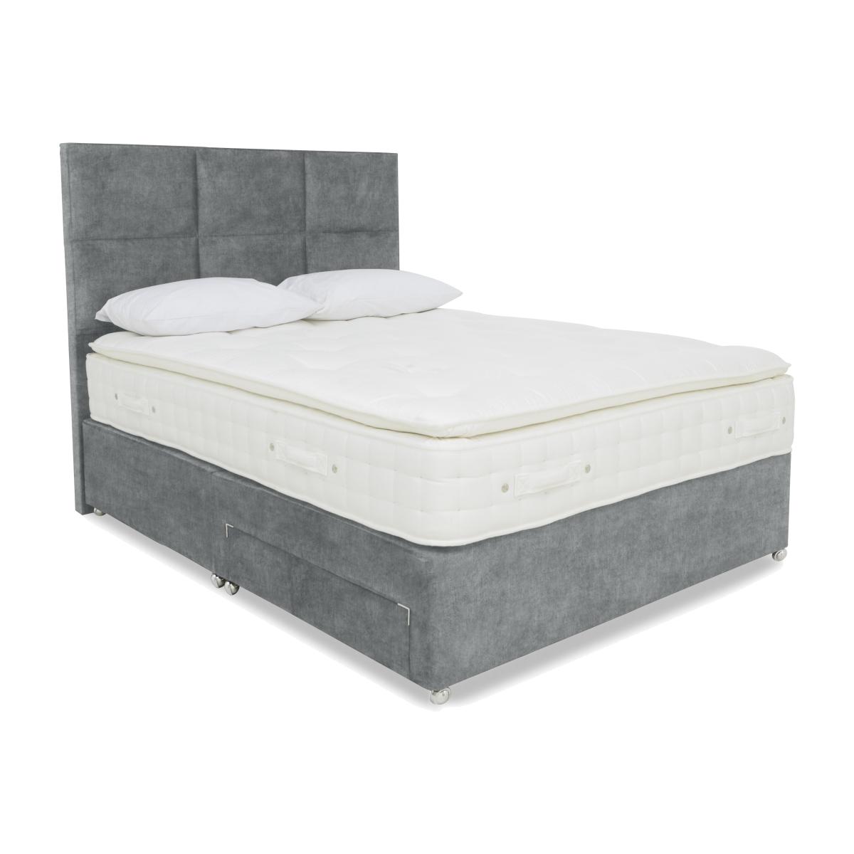 The Sanctum Nature 2000 collection range epitomises luxury, from top to bottom and side to side. Pocket sprung mattresses with optional pillow tops feature all-natural fillings that include cooling British wool, cotton, silk and cashmere, and have sturdy side-stitched and ventilated borders. Upholstered divan bases have sprung edges for enhanced mattress support, and a choice of storage drawers. The collection also includes ready-made divan sets that include a mattress, storage base and stylish floor standing headboard. They're the easiest way to transform both the quality of your sleep and the look of your bedroom. The Sanctum Nature 2000 range is handcrafted by Highgrove. Bring chic contemporary style to your bedroom with this divan set. It includes a floor standing headboard, divan base with two drawers and a luxurious pillowtop mattress with natural fillings. Why you'll love it On-trend divan set with storage base, pillowtop mattress and chic headboard. Sleep in sumptuous luxury. Mattress has layers of all-natural fillings including cotton, cashmere, silk and British wool. Wool helps keep you cool in summer and warm in winter. 2000 pocket springs in king size for wonderful support. Integrated pillowtop provides an extra layer of cushioning comfort. Border has 2 rows of side-stitching for edge support, and vents for cooling airflow. Superior sprung-edge divan base provides full-width mattress support. Enjoy extra bedroom storage with 2 roomy and versatile built-in drawers. This divan set includes a contemporary floor standing headboard. Well-cushioned modern design with understated geometric stitching. Choose from a wide range of on-trend upholstery fabrics and colours. Handmade in the UK by Highgrove. This 2-drawer divan set with mattress and headboard is part of the Sanctum Nature 2000 Pillowtop range. What you need to know Mattress type: Hybrid. Depth: 35 cm. Firmness: Medium. Springs: 2000 pocket springs in king size. Pillow top:Yes. Fillings: British wool, poly cotton, cashmere, silk. Cover: 100% polyester. Requires turning: No. Base type: Sprung edge with optional storage drawers. Sizes: Small double, double, king and super king. Mattress care:Air for 4 hours before using to remove any odour. Indentations caused by settlement of fillings or body weight are normal and are not considered defects. If used on a slatted bed frame, the space between slats must be no wider than 7.5 cm. Spaces wider than this may cause excess dipping of the mattress and invalidate the guarantee. Always use a mattress protector. Rotate regularly. Headboard and divan base care: Clean upholstery weekly using a soft brush or vacuum with the curtain attachment. Professional cleaning advised for oil- and grease-based stains. Divan bases are supplied in two halves for easier access.