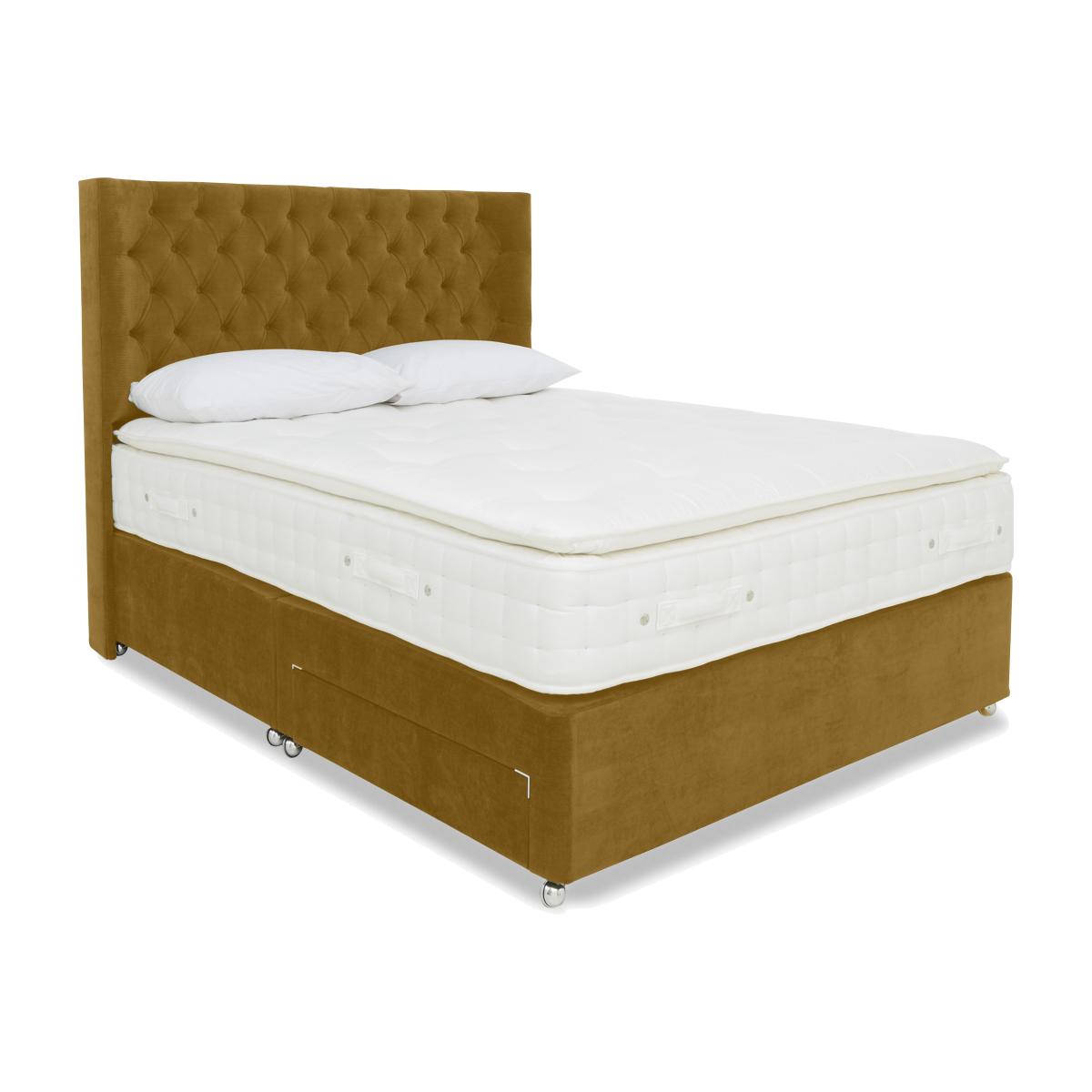 The Sanctum Nature 2000 collection range epitomises luxury, from top to bottom and side to side. Pocket sprung mattresses with optional pillow tops feature all-natural fillings that include cooling British wool, cotton, silk and cashmere, and have sturdy side-stitched and ventilated borders. Upholstered divan bases have sprung edges for enhanced mattress support, and a choice of storage drawers. The collection also includes ready-made divan sets that include a mattress, storage base and stylish floor standing headboard. They're the easiest way to transform both the quality of your sleep and the look of your bedroom. The Sanctum Nature 2000 range is handcrafted by Highgrove. Here’s everything you need for better sleep. This three-in-one divan set includes a sprung-edge divan base with two drawers, a sumptuous pillow top mattress and a statement winged headboard. Why you'll love it Stunning 2-drawer divan set with pillowtop mattress, storage base and winged headboard. Sleep in sumptuous luxury. Mattress has layers of all-natural fillings including cotton, cashmere, silk and British wool. Wool helps keep you cool in summer and warm in winter. 2000 pocket springs in king size for wonderful support. Integrated pillowtop provides an extra layer of cushioning comfort. Border has 2 rows of side-stitching for edge support, and vents for cooling airflow. Superior sprung-edge divan base provides full-width mattress support. Enjoy extra bedroom storage with 2 roomy and versatile built-in drawers. This divan set includes an elegant floor standing headboard. Sumptuously cushioned headboard has winged sides with traditional buttoning. Choose from a wide range of on-trend upholstery fabrics and colours. Handmade in the UK by Highgrove. This 2-drawer divan set with mattress and headboard is part of the Sanctum Nature 2000 Pillowtop range. What you need to know Mattress type: Hybrid. Depth: 35 cm. Firmness: Medium. Springs: 2000 pocket springs in king size. Pillow top:Yes. Fillings: British wool, poly cotton, cashmere, silk. Cover: 100% polyester. Requires turning: No. Base type: Sprung edge with optional storage drawers. Sizes: Small double, double, king and super king. Mattress care:Air for 4 hours before using to remove any odour. Indentations caused by settlement of fillings or body weight are normal and are not considered defects. If used on a slatted bed frame, the space between slats must be no wider than 7.5 cm. Spaces wider than this may cause excess dipping of the mattress and invalidate the guarantee. Always use a mattress protector. Rotate regularly. Headboard and divan base care: Clean upholstery weekly using a soft brush or vacuum with the curtain attachment. Professional cleaning advised for oil- and grease-based stains. Divan bases are supplied in two halves for easier access.