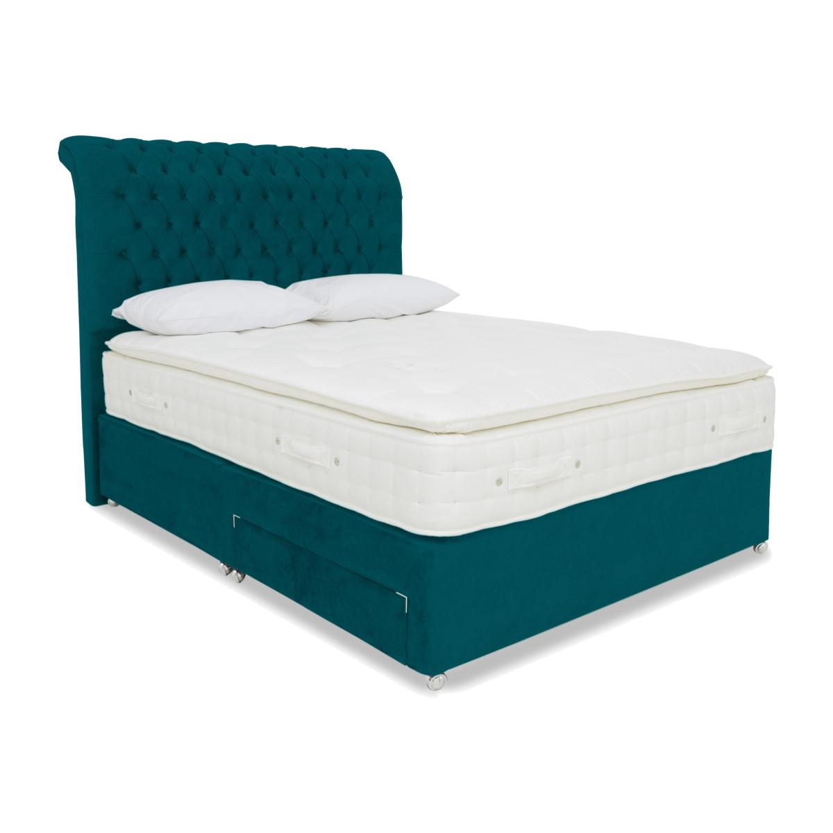 The Sanctum Nature 2000 collection range epitomises luxury, from top to bottom and side to side. Pocket sprung mattresses with optional pillow tops feature all-natural fillings that include cooling British wool, cotton, silk and cashmere, and have sturdy side-stitched and ventilated borders. Upholstered divan bases have sprung edges for enhanced mattress support, and a choice of storage drawers. The collection also includes ready-made divan sets that include a mattress, storage base and stylish floor standing headboard. They're the easiest way to transform both the quality of your sleep and the look of your bedroom. The Sanctum Nature 2000 range is handcrafted by Highgrove. Comfort, style and storage – this divan set includes a sprung-edge storage divan base, luxury pillowtop pocket spring mattress and even a tall, Chesterfield-style headboard. Why you'll love it This 2-drawer divan set with pillowtop mattress includes a headboard. Sleep in sumptuous luxury. Mattress has layers of all-natural fillings including cotton, cashmere, silk and British wool. Wool helps keep you cool in summer and warm in winter. 2000 pocket springs in king size for wonderful support. Integrated pillowtop provides an extra layer of cushioning comfort. Border has 2 rows of side-stitching for edge support, and vents for cooling airflow. Superior sprung-edge divan base provides full-width mattress support. Enjoy extra bedroom storage with 2 roomy and versatile built-in drawers. This divan set includes a sumptuous floor standing headboard. Roll top Chesterfield-inspired design with deep cushioning and beautiful buttoning. Choose from a wide range of on-trend upholstery fabrics and colours. Handmade in the UK by Highgrove. This 2-drawer divan set with mattress and headboard is part of the Sanctum Nature 2000 Pillowtop range. What you need to know Mattress type: Hybrid. Depth: 35 cm. Firmness: Medium. Springs: 2000 pocket springs in king size. Pillow top:Yes. Fillings: British wool, poly cotton, cashmere, silk. Cover: 100% polyester. Requires turning: No. Base type: Sprung edge with optional storage drawers. Sizes: Small double, double, king and super king. Mattress care:Air for 4 hours before using to remove any odour. Indentations caused by settlement of fillings or body weight are normal and are not considered defects. If used on a slatted bed frame, the space between slats must be no wider than 7.5 cm. Spaces wider than this may cause excess dipping of the mattress and invalidate the guarantee. Always use a mattress protector. Rotate regularly. Headboard and divan base care: Clean upholstery weekly using a soft brush or vacuum with the curtain attachment. Professional cleaning advised for oil- and grease-based stains. Divan bases are supplied in two halves for easier access.