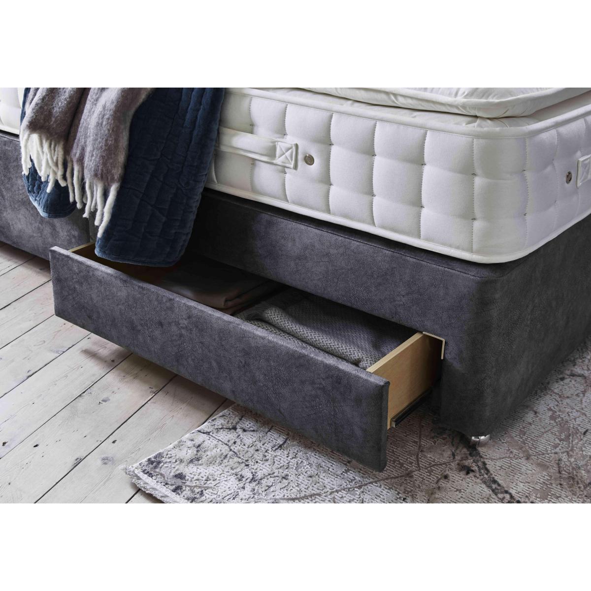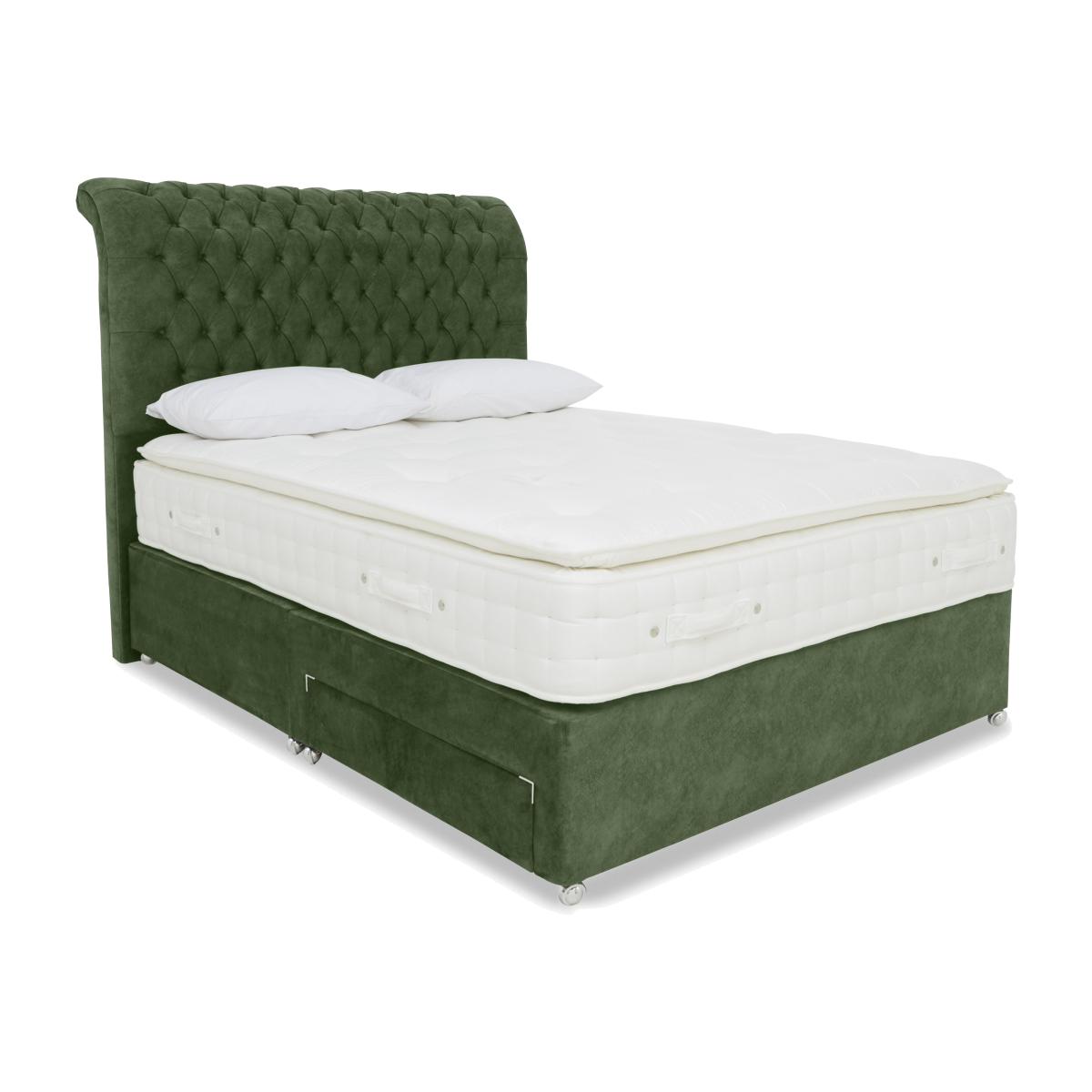 The Sanctum Nature 2000 collection range epitomises luxury, from top to bottom and side to side. Pocket sprung mattresses with optional pillow tops feature all-natural fillings that include cooling British wool, cotton, silk and cashmere, and have sturdy side-stitched and ventilated borders. Upholstered divan bases have sprung edges for enhanced mattress support, and a choice of storage drawers. The collection also includes ready-made divan sets that include a mattress, storage base and stylish floor standing headboard. They're the easiest way to transform both the quality of your sleep and the look of your bedroom. The Sanctum Nature 2000 range is handcrafted by Highgrove. Comfort, style and storage – this divan set includes a sprung-edge storage divan base, luxury pillowtop pocket spring mattress and even a tall, Chesterfield-style headboard. Why you'll love it This 2-drawer divan set with pillowtop mattress includes a headboard. Sleep in sumptuous luxury. Mattress has layers of all-natural fillings including cotton, cashmere, silk and British wool. Wool helps keep you cool in summer and warm in winter. 2000 pocket springs in king size for wonderful support. Integrated pillowtop provides an extra layer of cushioning comfort. Border has 2 rows of side-stitching for edge support, and vents for cooling airflow. Superior sprung-edge divan base provides full-width mattress support. Enjoy extra bedroom storage with 2 roomy and versatile built-in drawers. This divan set includes a sumptuous floor standing headboard. Roll top Chesterfield-inspired design with deep cushioning and beautiful buttoning. Choose from a wide range of on-trend upholstery fabrics and colours. Handmade in the UK by Highgrove. This 2-drawer divan set with mattress and headboard is part of the Sanctum Nature 2000 Pillowtop range. What you need to know Mattress type: Hybrid. Depth: 35 cm. Firmness: Medium. Springs: 2000 pocket springs in king size. Pillow top:Yes. Fillings: British wool, poly cotton, cashmere, silk. Cover: 100% polyester. Requires turning: No. Base type: Sprung edge with optional storage drawers. Sizes: Small double, double, king and super king. Mattress care:Air for 4 hours before using to remove any odour. Indentations caused by settlement of fillings or body weight are normal and are not considered defects. If used on a slatted bed frame, the space between slats must be no wider than 7.5 cm. Spaces wider than this may cause excess dipping of the mattress and invalidate the guarantee. Always use a mattress protector. Rotate regularly. Headboard and divan base care: Clean upholstery weekly using a soft brush or vacuum with the curtain attachment. Professional cleaning advised for oil- and grease-based stains. Divan bases are supplied in two halves for easier access.