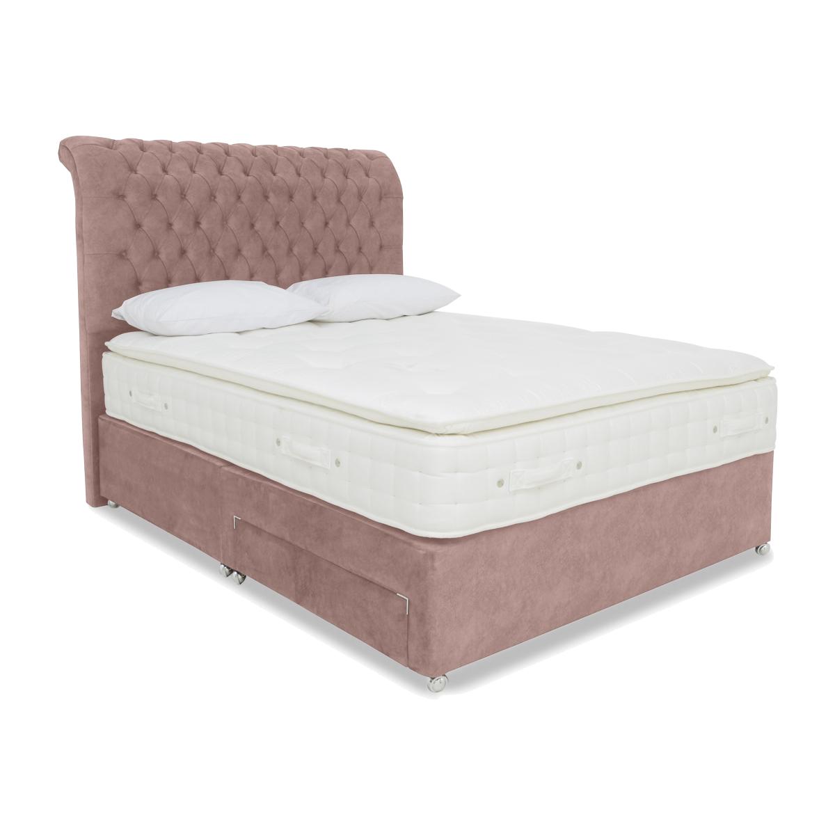 The Sanctum Nature 2000 collection range epitomises luxury, from top to bottom and side to side. Pocket sprung mattresses with optional pillow tops feature all-natural fillings that include cooling British wool, cotton, silk and cashmere, and have sturdy side-stitched and ventilated borders. Upholstered divan bases have sprung edges for enhanced mattress support, and a choice of storage drawers. The collection also includes ready-made divan sets that include a mattress, storage base and stylish floor standing headboard. They're the easiest way to transform both the quality of your sleep and the look of your bedroom. The Sanctum Nature 2000 range is handcrafted by Highgrove. Comfort, style and storage – this divan set includes a sprung-edge storage divan base, luxury pillowtop pocket spring mattress and even a tall, Chesterfield-style headboard. Why you'll love it This 2-drawer divan set with pillowtop mattress includes a headboard. Sleep in sumptuous luxury. Mattress has layers of all-natural fillings including cotton, cashmere, silk and British wool. Wool helps keep you cool in summer and warm in winter. 2000 pocket springs in king size for wonderful support. Integrated pillowtop provides an extra layer of cushioning comfort. Border has 2 rows of side-stitching for edge support, and vents for cooling airflow. Superior sprung-edge divan base provides full-width mattress support. Enjoy extra bedroom storage with 2 roomy and versatile built-in drawers. This divan set includes a sumptuous floor standing headboard. Roll top Chesterfield-inspired design with deep cushioning and beautiful buttoning. Choose from a wide range of on-trend upholstery fabrics and colours. Handmade in the UK by Highgrove. This 2-drawer divan set with mattress and headboard is part of the Sanctum Nature 2000 Pillowtop range. What you need to know Mattress type: Hybrid. Depth: 35 cm. Firmness: Medium. Springs: 2000 pocket springs in king size. Pillow top:Yes. Fillings: British wool, poly cotton, cashmere, silk. Cover: 100% polyester. Requires turning: No. Base type: Sprung edge with optional storage drawers. Sizes: Small double, double, king and super king. Mattress care:Air for 4 hours before using to remove any odour. Indentations caused by settlement of fillings or body weight are normal and are not considered defects. If used on a slatted bed frame, the space between slats must be no wider than 7.5 cm. Spaces wider than this may cause excess dipping of the mattress and invalidate the guarantee. Always use a mattress protector. Rotate regularly. Headboard and divan base care: Clean upholstery weekly using a soft brush or vacuum with the curtain attachment. Professional cleaning advised for oil- and grease-based stains. Divan bases are supplied in two halves for easier access.