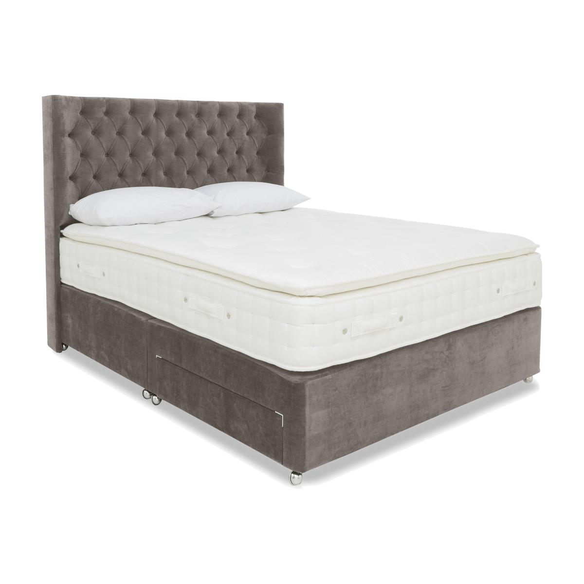 The Sanctum Nature 2000 collection range epitomises luxury, from top to bottom and side to side. Pocket sprung mattresses with optional pillow tops feature all-natural fillings that include cooling British wool, cotton, silk and cashmere, and have sturdy side-stitched and ventilated borders. Upholstered divan bases have sprung edges for enhanced mattress support, and a choice of storage drawers. The collection also includes ready-made divan sets that include a mattress, storage base and stylish floor standing headboard. They're the easiest way to transform both the quality of your sleep and the look of your bedroom. The Sanctum Nature 2000 range is handcrafted by Highgrove. For head to toe luxury, take a look at this fabulous divan set with superb pocket spring pillowtop mattress. The sprung-edge base has optional storage drawers. Handcrafted. Why you'll love it This elegant divan set comes with a wonderful pocket spring pillowtop mattress. Sleep in sumptuous luxury. Mattress has layers of all-natural fillings including cotton, cashmere, silk and British wool. Wool helps keep you cool in summer and warm in winter. 2000 pocket springs in king size for wonderful support. Integrated pillowtop provides an extra layer of cushioning comfort. Border has 2 rows of side-stitching for edge support, and vents for cooling airflow. Superior sprung-edge divan base provides full-width mattress support. With optional built-in storage drawers in a choice of configurations. Upholstered in a wide range of on-trend fabric colours. Available in all bed sizes from small double to super king. Handmade in the UK by Highgrove. This divan set is part of the Sanctum Nature 2000 Pillowtop range. What you need to know Headboard is an optional extra. Mattress type: Hybrid. Depth: 35 cm. Firmness: Medium. Springs: 2000 pocket springs in king size. Pillow top:Yes. Fillings: British wool, poly cotton, cashmere, silk. Cover: 100% polyester. Requires turning: No. Base type: Sprung edge with optional storage drawers. Sizes: Small double, double, king and super king. Mattress care:Air for 4 hours before using to remove any odour. Indentations caused by settlement of fillings or body weight are normal and are not considered defects. If used on a slatted bed frame, the space between slats must be no wider than 7.5 cm. Spaces wider than this may cause excess dipping of the mattress and invalidate the guarantee. Always use a mattress protector. Rotate regularly. Divan base care: Clean upholstery weekly using a soft brush or vacuum with the curtain attachment. Professional cleaning advised for oil- and grease-based stains. Divan bases are supplied in two halves for easier access.