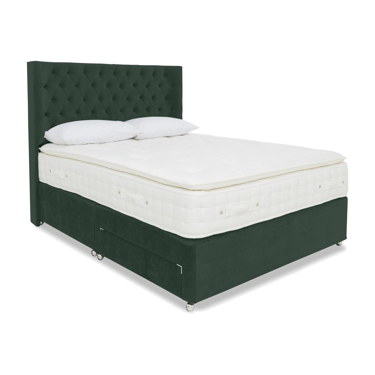 The Sanctum Nature 2000 collection range epitomises luxury, from top to bottom and side to side. Pocket sprung mattresses with optional pillow tops feature all-natural fillings that include cooling British wool, cotton, silk and cashmere, and have sturdy side-stitched and ventilated borders. Upholstered divan bases have sprung edges for enhanced mattress support, and a choice of storage drawers. The collection also includes ready-made divan sets that include a mattress, storage base and stylish floor standing headboard. They're the easiest way to transform both the quality of your sleep and the look of your bedroom. The Sanctum Nature 2000 range is handcrafted by Highgrove. For head to toe luxury, take a look at this fabulous divan set with superb pocket spring pillowtop mattress. The sprung-edge base has optional storage drawers. Handcrafted. Why you'll love it This elegant divan set comes with a wonderful pocket spring pillowtop mattress. Sleep in sumptuous luxury. Mattress has layers of all-natural fillings including cotton, cashmere, silk and British wool. Wool helps keep you cool in summer and warm in winter. 2000 pocket springs in king size for wonderful support. Integrated pillowtop provides an extra layer of cushioning comfort. Border has 2 rows of side-stitching for edge support, and vents for cooling airflow. Superior sprung-edge divan base provides full-width mattress support. With optional built-in storage drawers in a choice of configurations. Upholstered in a wide range of on-trend fabric colours. Available in all bed sizes from small double to super king. Handmade in the UK by Highgrove. This divan set is part of the Sanctum Nature 2000 Pillowtop range. What you need to know Headboard is an optional extra. Mattress type: Hybrid. Depth: 35 cm. Firmness: Medium. Springs: 2000 pocket springs in king size. Pillow top:Yes. Fillings: British wool, poly cotton, cashmere, silk. Cover: 100% polyester. Requires turning: No. Base type: Sprung edge with optional storage drawers. Sizes: Small double, double, king and super king. Mattress care:Air for 4 hours before using to remove any odour. Indentations caused by settlement of fillings or body weight are normal and are not considered defects. If used on a slatted bed frame, the space between slats must be no wider than 7.5 cm. Spaces wider than this may cause excess dipping of the mattress and invalidate the guarantee. Always use a mattress protector. Rotate regularly. Divan base care: Clean upholstery weekly using a soft brush or vacuum with the curtain attachment. Professional cleaning advised for oil- and grease-based stains. Divan bases are supplied in two halves for easier access.