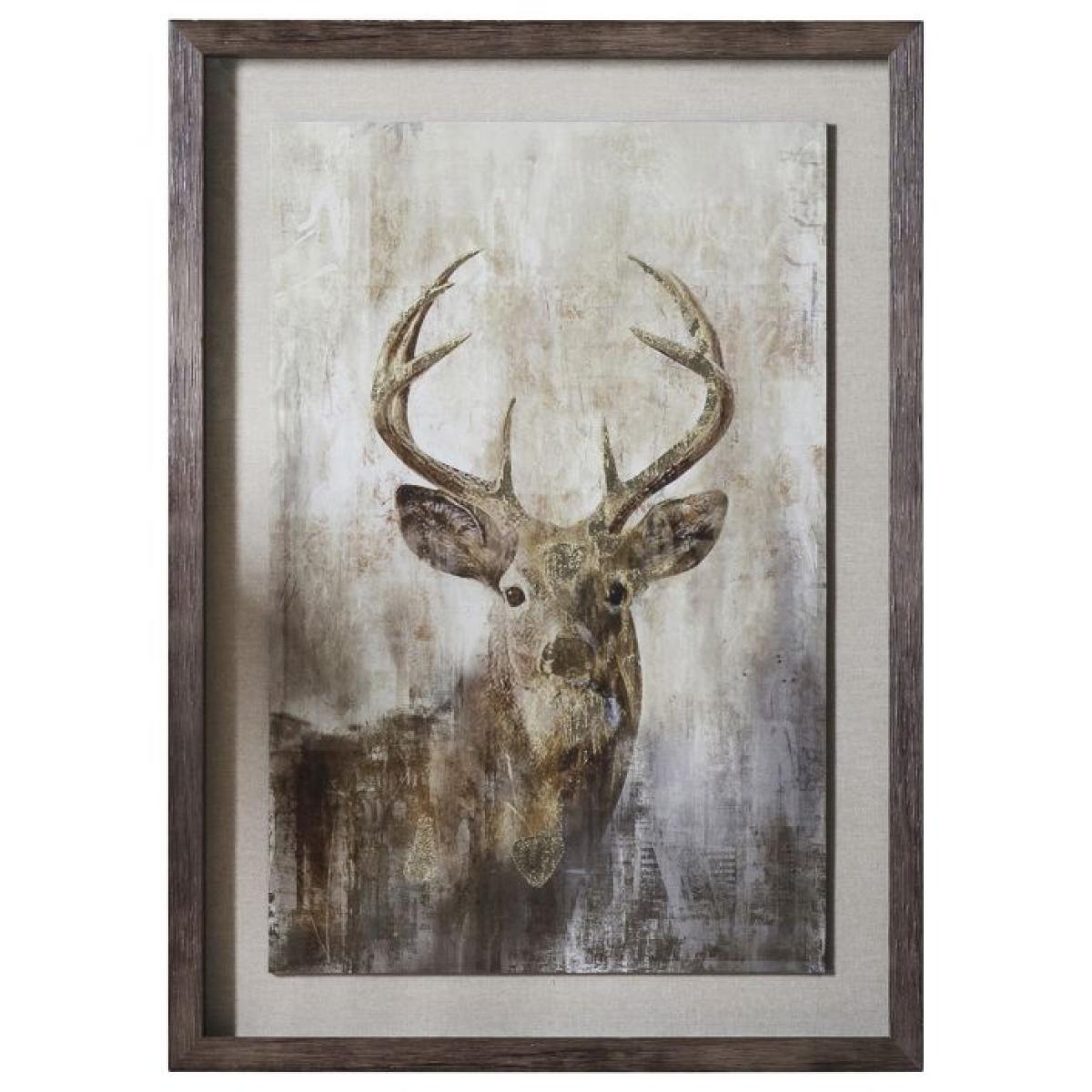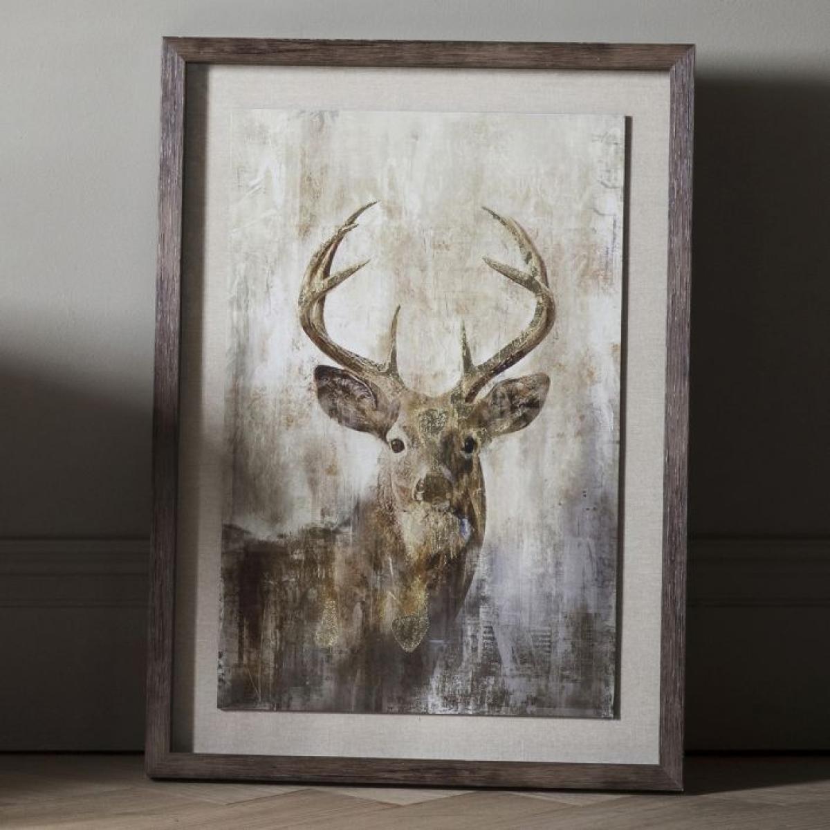 Majestic vintage Stag print with gold foil highlights, float mounted on a natural linen background in an open grain wood effect frame. Orientation: Portrait. Fixing Type: D-Ring. Framed:Yes. Colour: Brown.