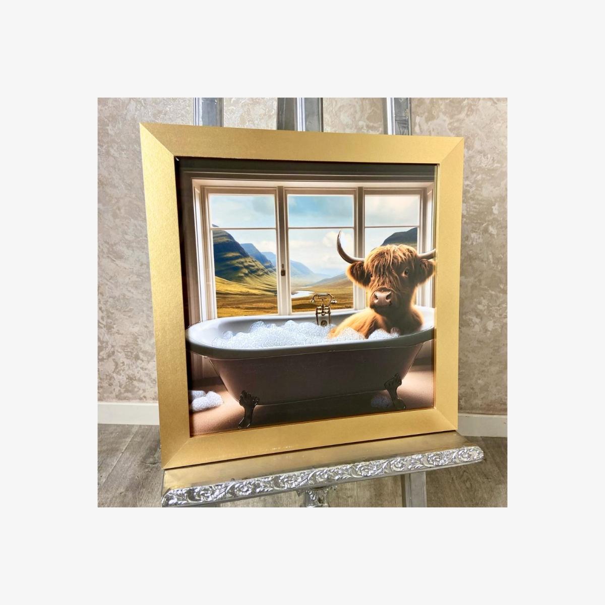 Novelty artwork of a highland cow taking a bath, featuring liquid detailing and a gold frame. A whimsical and charming piece that adds a playful touch to your decor, this delightful artwork features a highland cow enjoying a bath, brought to life with intricate liquid detailing that adds depth and texture. Encased in a luxurious gold frame, this piece combines humour with elegance, making it a standout addition to any room. Perfect for adding character to your bathroom, living room or hallway, this novelty wall art is sure to bring a smile to your face and become a conversation starter among guests. Novelty artwork of a highland cow taking a bath, featuring liquid detailing and a gold frame. A whimsical and charming piece that adds a playful touch to your decor, this delightful artwork features a highland cow enjoying a bath, brought to life with intricate liquid detailing that adds depth and texture. Encased in a luxurious gold frame, this piece combines humour with elegance, making it a standout addition to any room. Perfect for adding character to your bathroom, living room or hallway, this novelty wall art is sure to bring a smile to your face and become a conversation starter among guests.